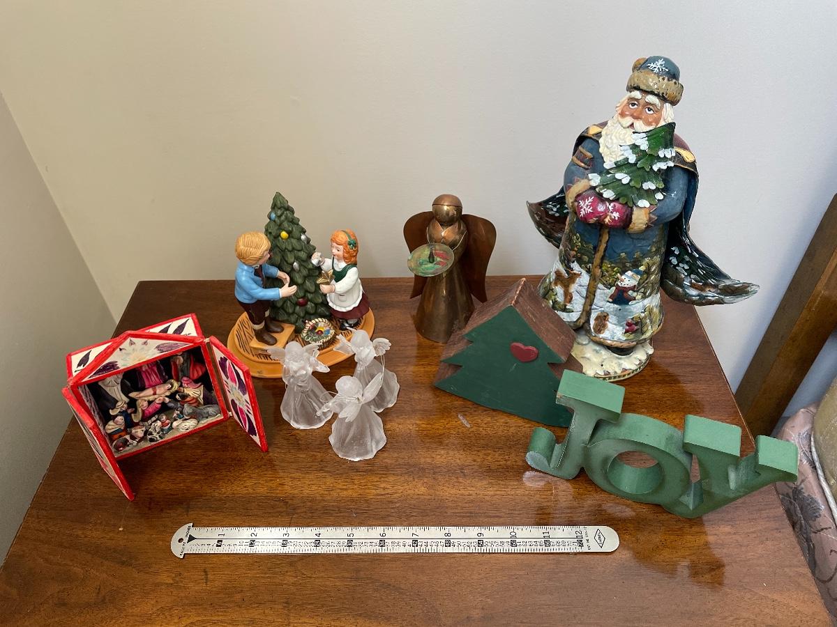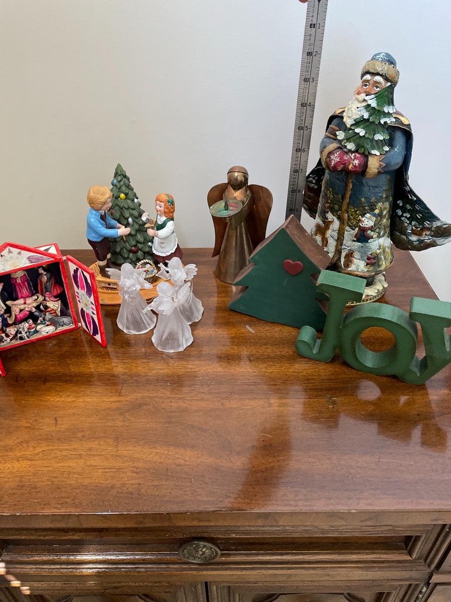 #44 Assorted Xmas Decor Santa, Shadow Box Crèche, Avon, Angels, Joy, Tree Lot of 9