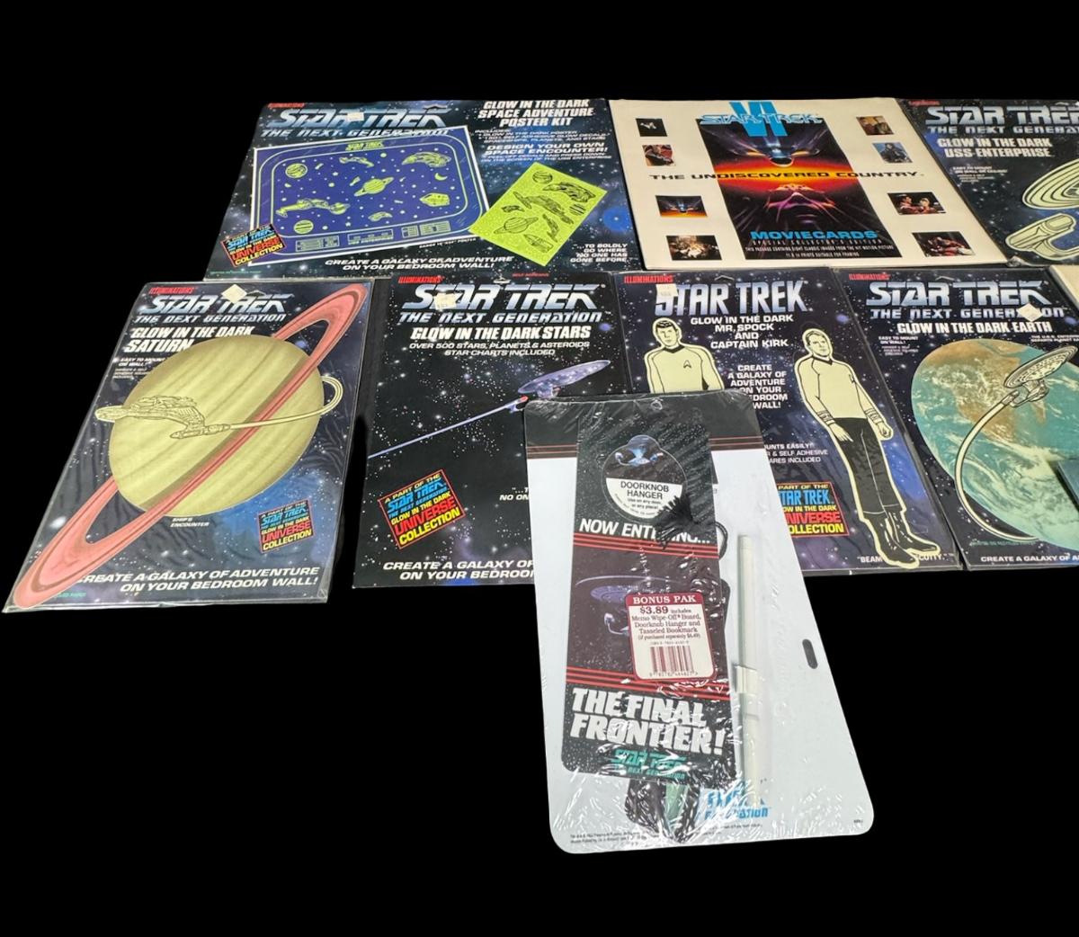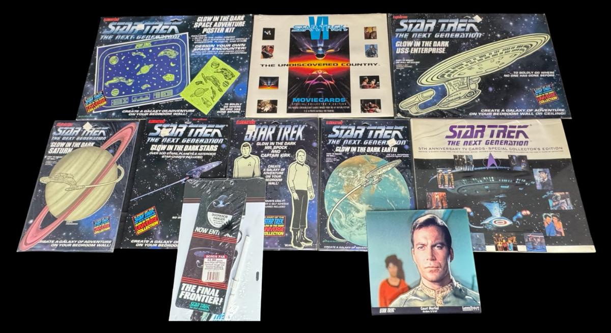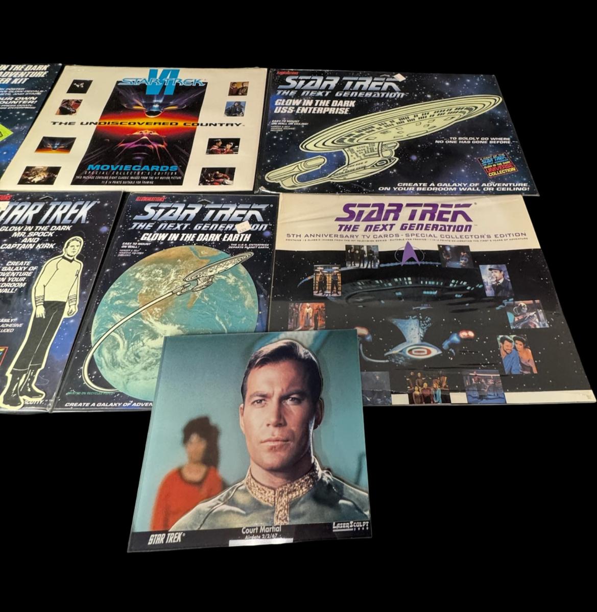 Includes anniversary movie cards, court marshal of Captain Kirk, glow in the dark pieces, and more. Total of nine pieces. Most pieces are in the original unopened packaging.