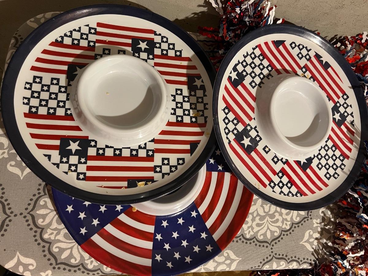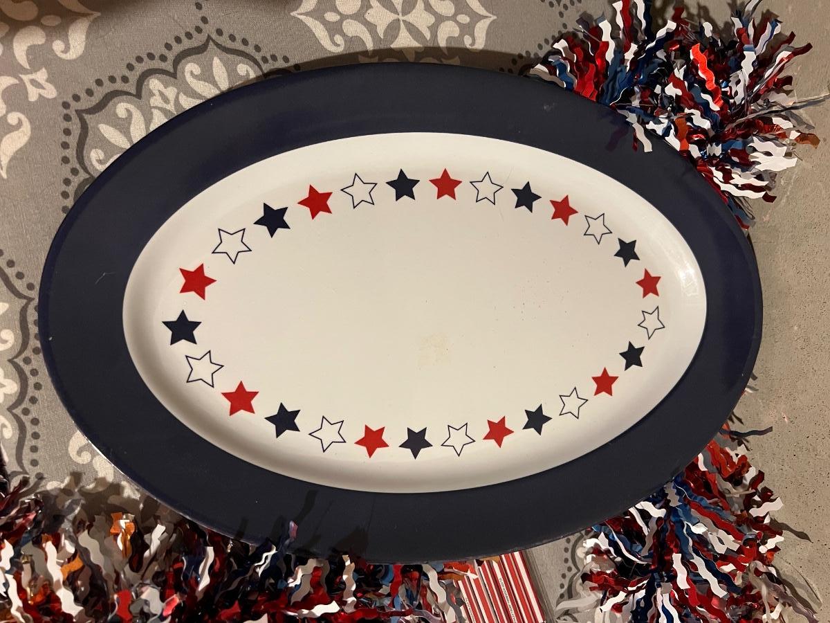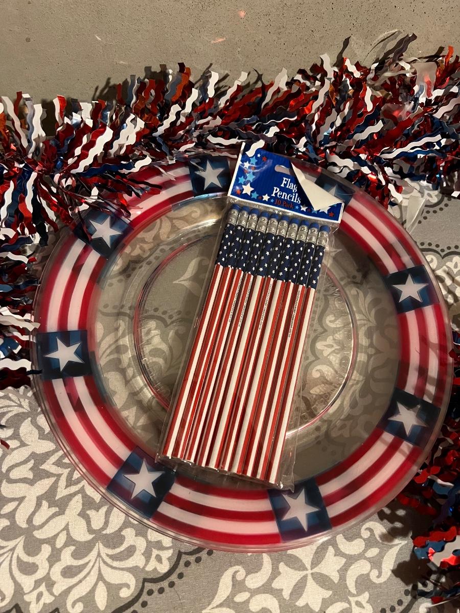 ASSORTMENT OF 4TH OF JULY PLATTERS AND PLATES, TINSEL AND PENCILS