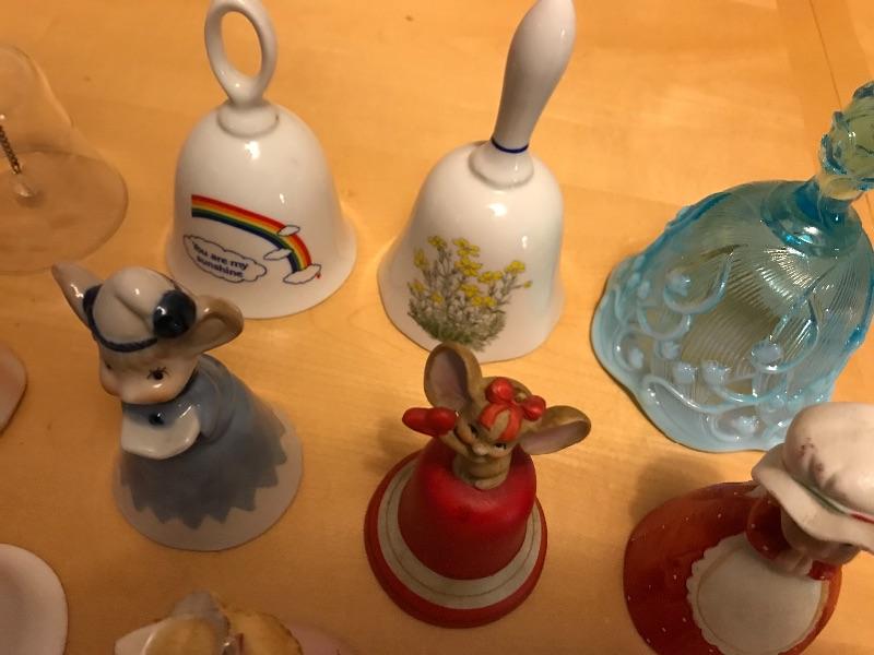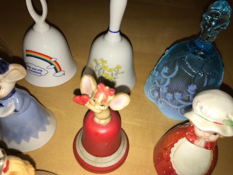 This is a collection of 9 bells. There is a blue Fenton bell, porcelain bells, etched crystal bell and more.