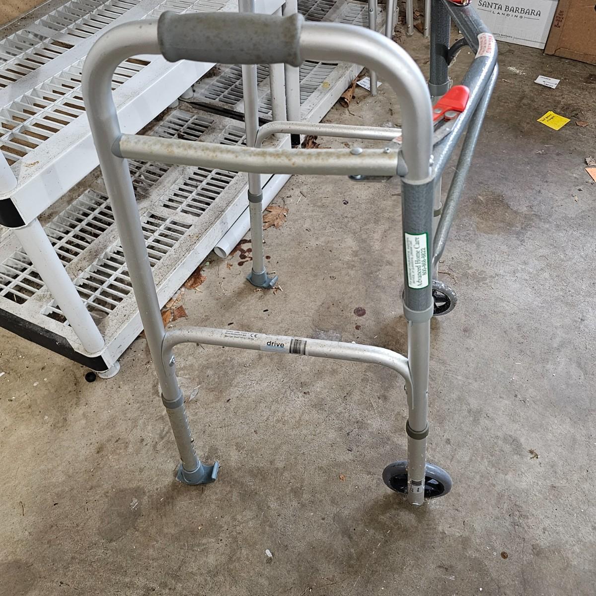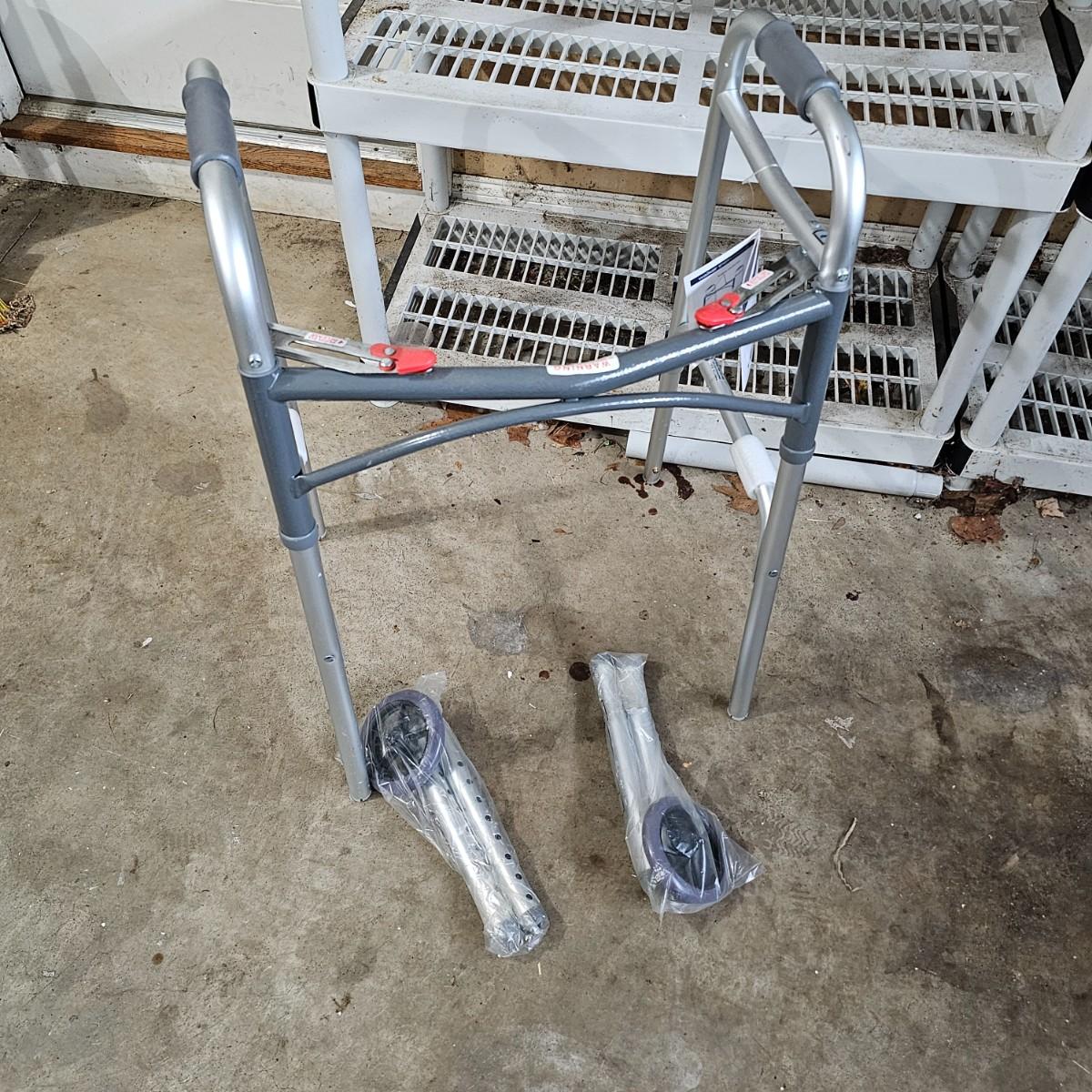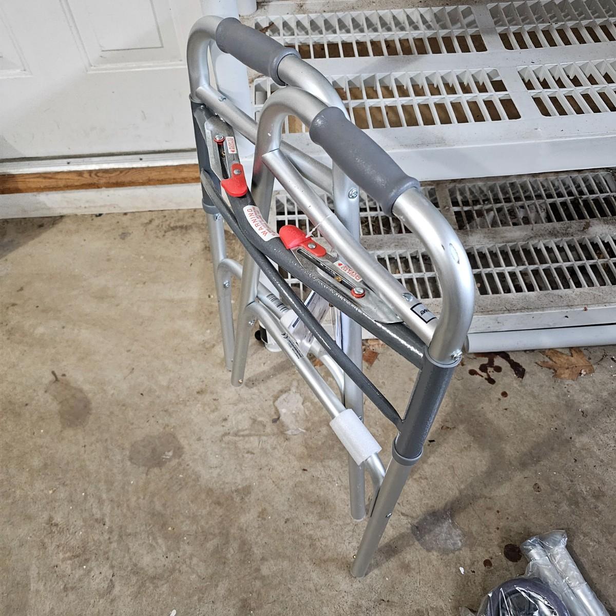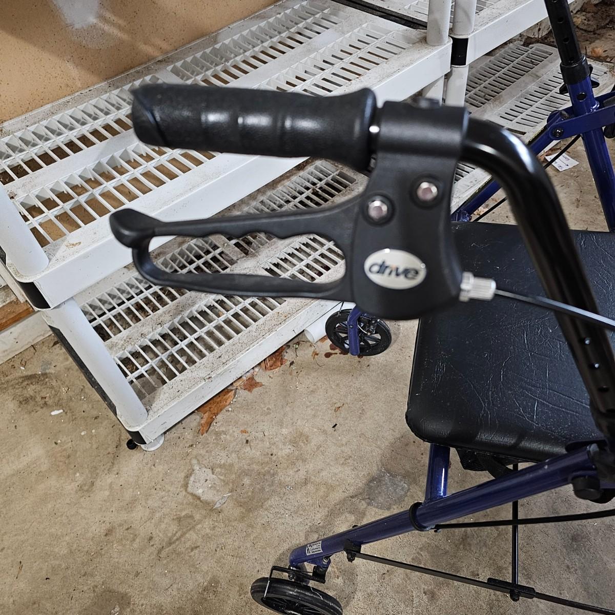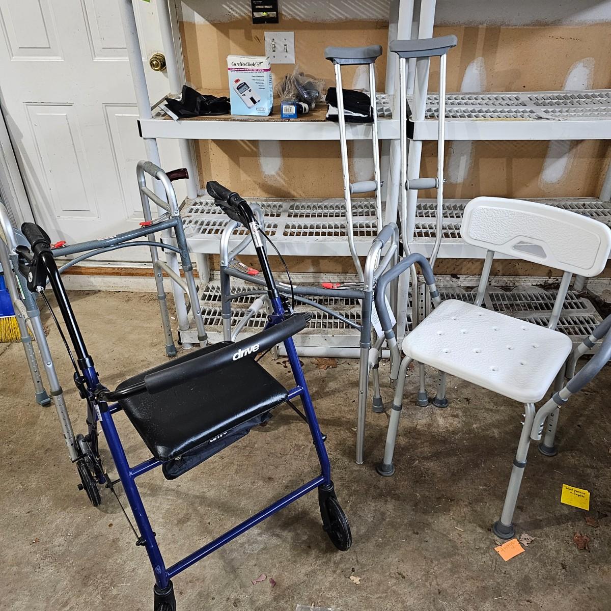Walkers, crutches and more. Pair of aluminum Medline crutches, 8"x 50"H and adjustable. One adjustable hand cane with brown finish. A plastic shower chair that measures 25" x 19" x 32"H, also adjustable. Three walkers, one Drive unit with handles, brakes and seat. 23" x 24" x 36"H with 20" seat height and locking brake handle. Folds to 13" x 41". Two smaller walkers, one Drive is 20" x 16" x 29"H, comes with add on 5" wheel posts. Other item is 20" x 21" x 35"H, has wheels in front and skids in back. Finally a fingertip pulse oximiter, a cardio chek blood tester, a cold pack, extra cane tips and a blood pressure cuff without dial readout. See photos for details. Local pickup only.