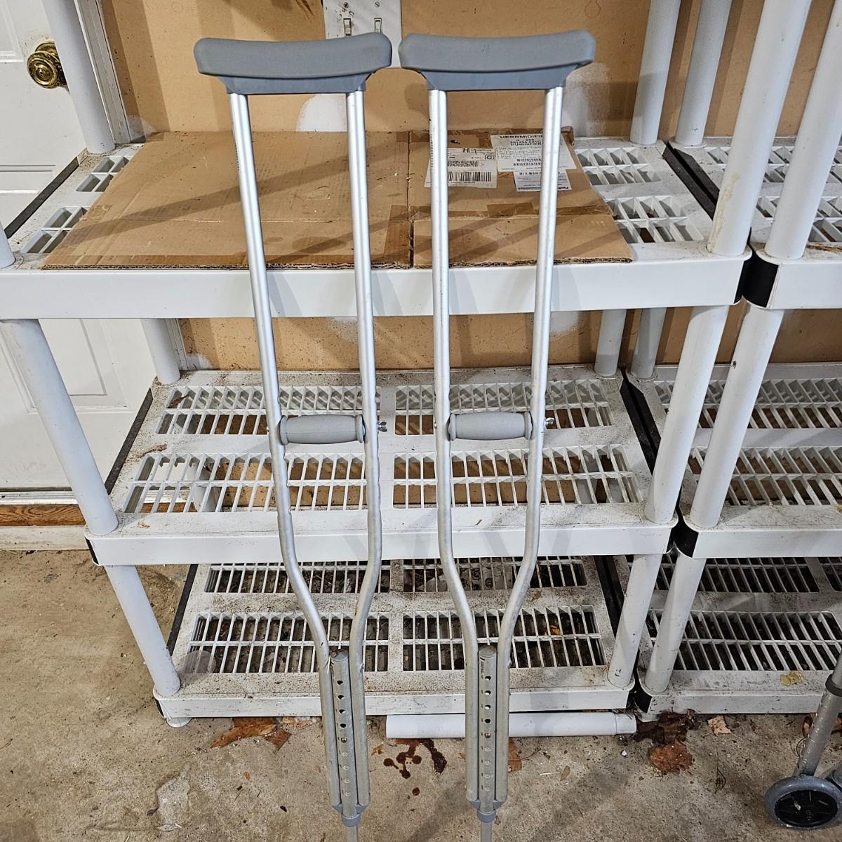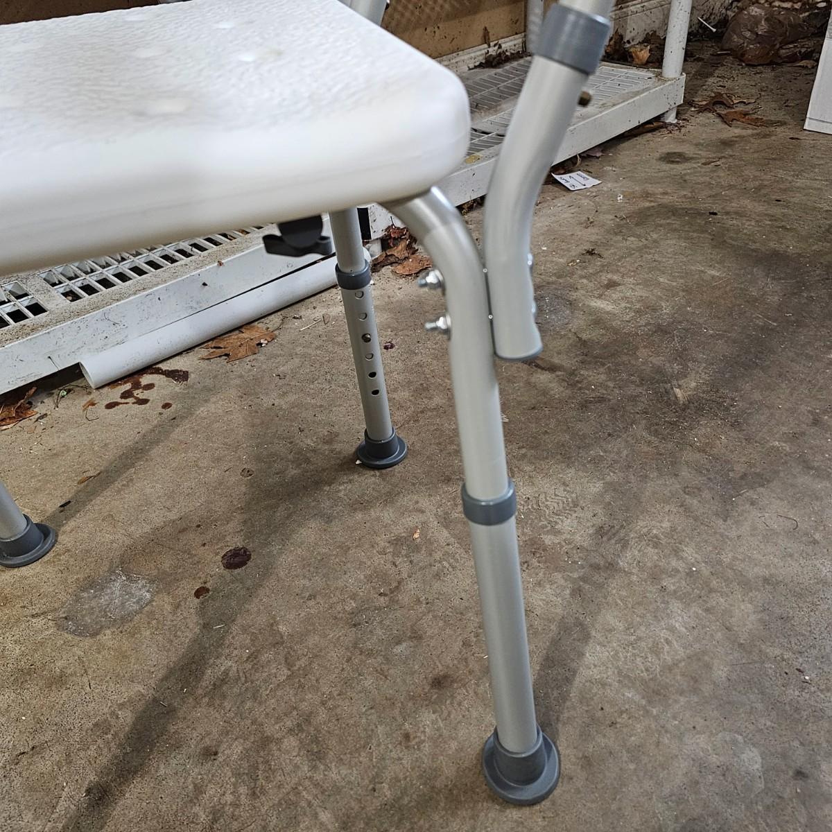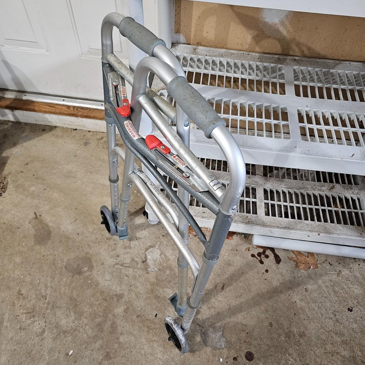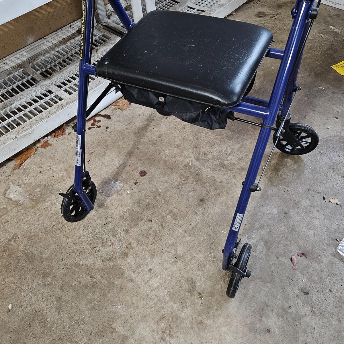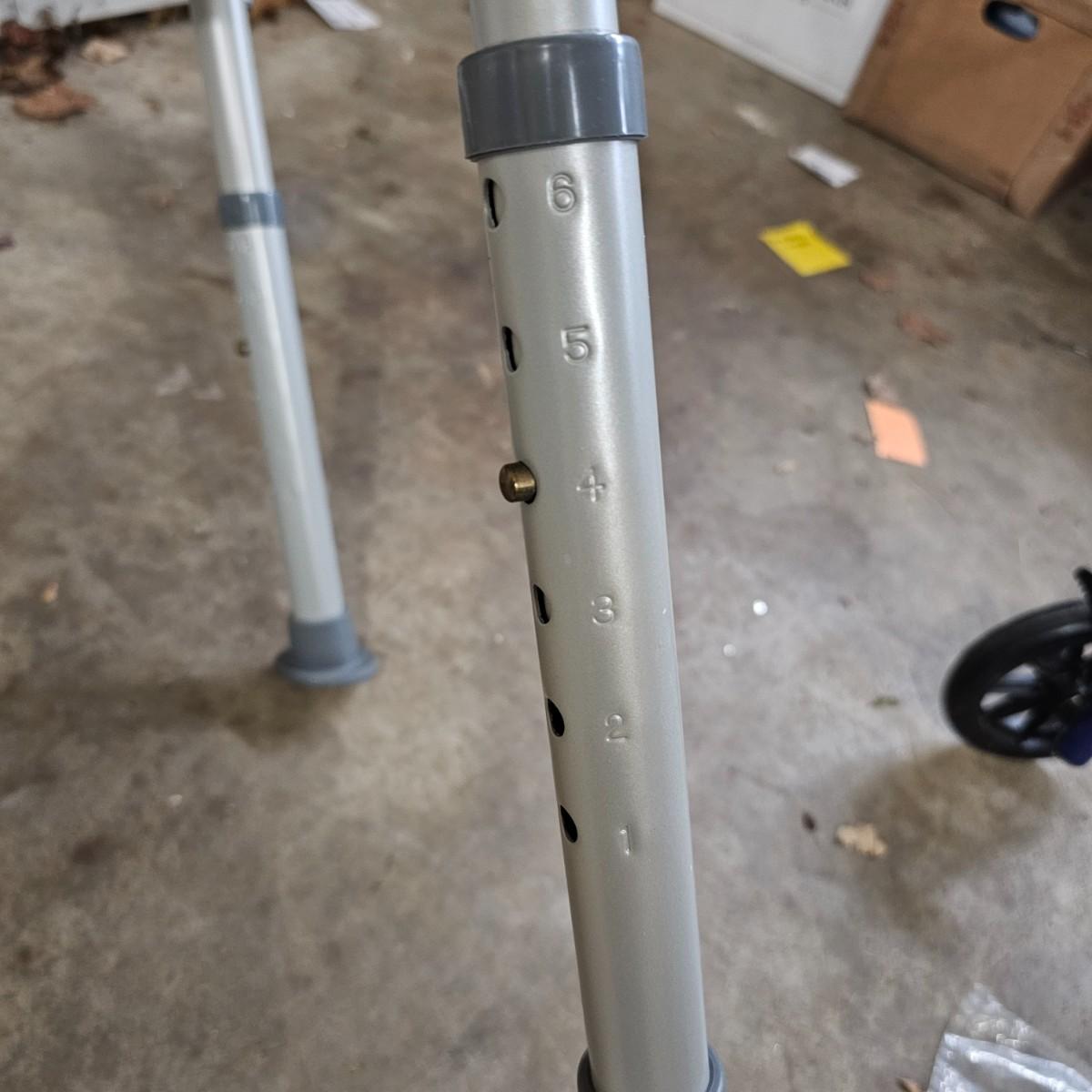 Walkers, crutches and more. Pair of aluminum Medline crutches, 8"x 50"H and adjustable. One adjustable hand cane with brown finish. A plastic shower chair that measures 25" x 19" x 32"H, also adjustable. Three walkers, one Drive unit with handles, brakes and seat. 23" x 24" x 36"H with 20" seat height and locking brake handle. Folds to 13" x 41". Two smaller walkers, one Drive is 20" x 16" x 29"H, comes with add on 5" wheel posts. Other item is 20" x 21" x 35"H, has wheels in front and skids in back. Finally a fingertip pulse oximiter, a cardio chek blood tester, a cold pack, extra cane tips and a blood pressure cuff without dial readout. See photos for details. Local pickup only.