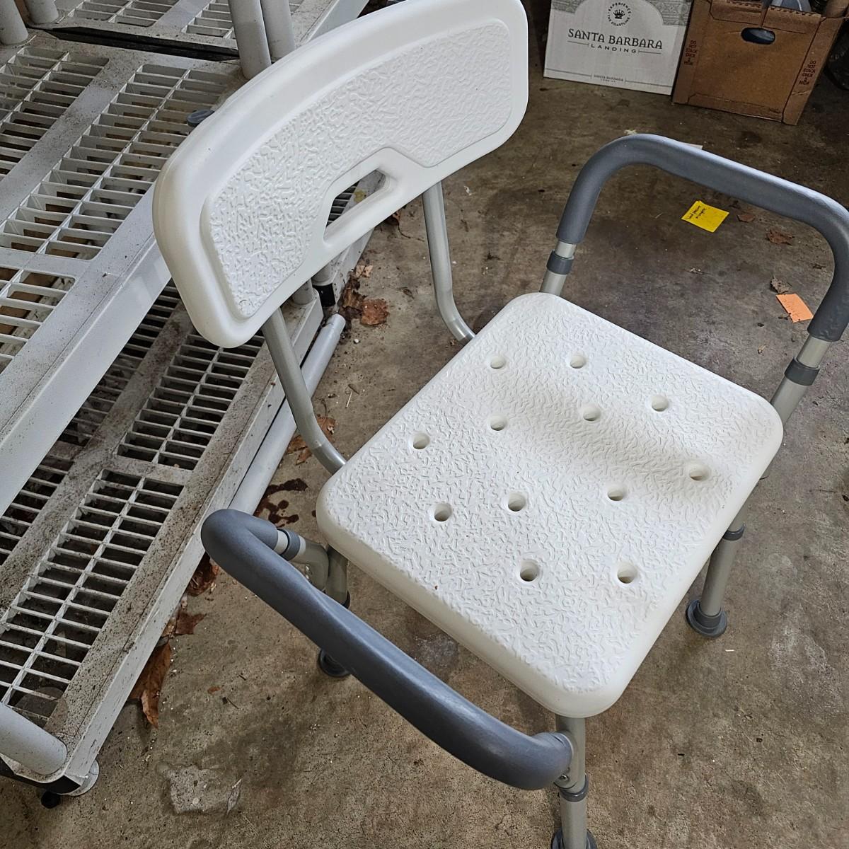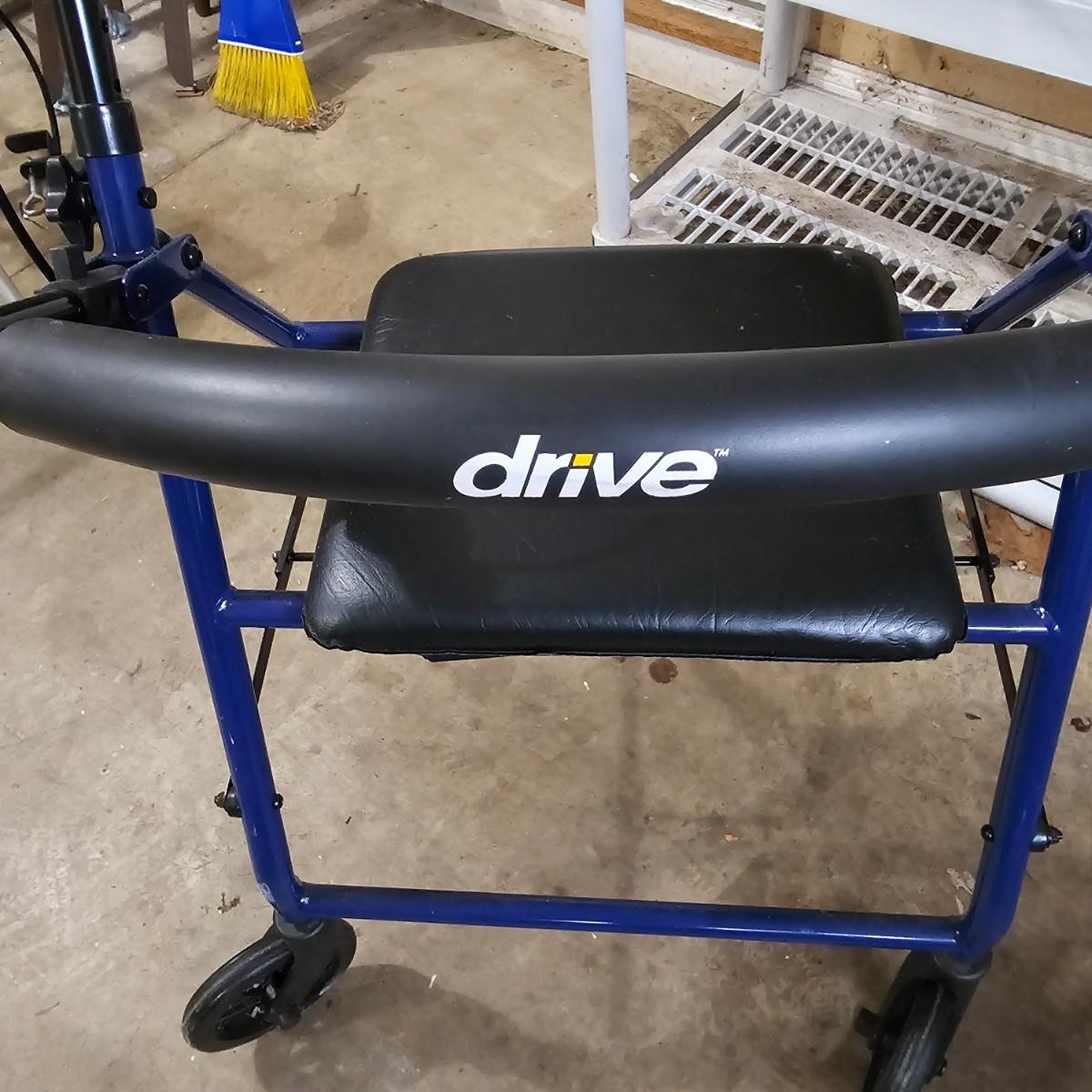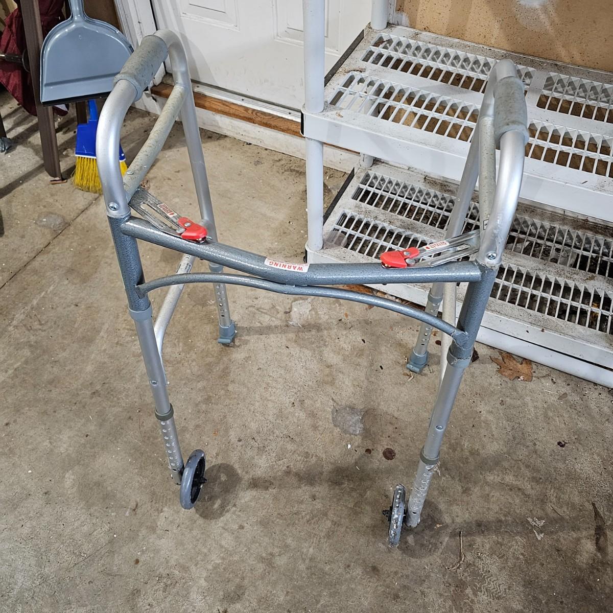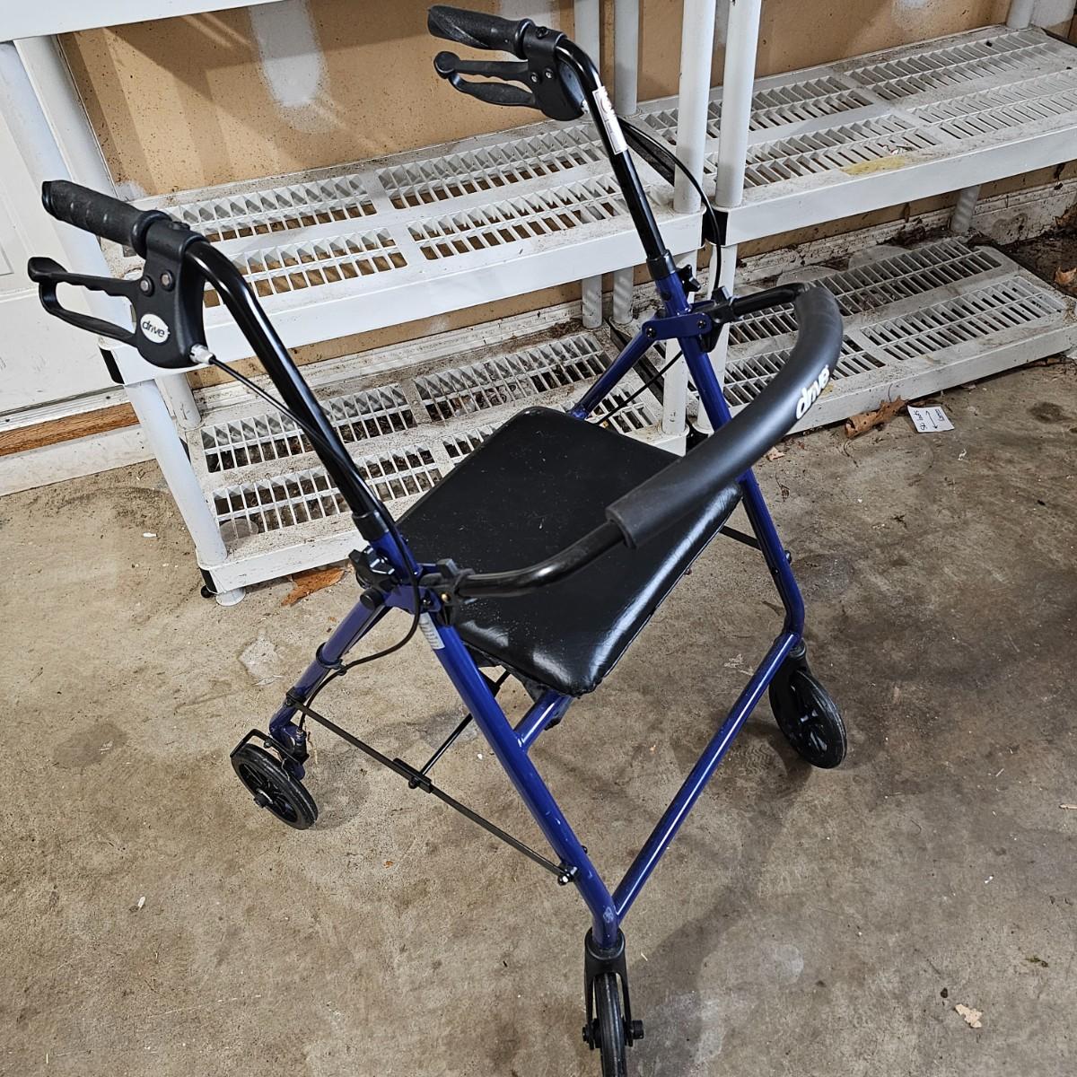 Walkers, crutches and more. Pair of aluminum Medline crutches, 8"x 50"H and adjustable. One adjustable hand cane with brown finish. A plastic shower chair that measures 25" x 19" x 32"H, also adjustable. Three walkers, one Drive unit with handles, brakes and seat. 23" x 24" x 36"H with 20" seat height and locking brake handle. Folds to 13" x 41". Two smaller walkers, one Drive is 20" x 16" x 29"H, comes with add on 5" wheel posts. Other item is 20" x 21" x 35"H, has wheels in front and skids in back. Finally a fingertip pulse oximiter, a cardio chek blood tester, a cold pack, extra cane tips and a blood pressure cuff without dial readout. See photos for details. Local pickup only.