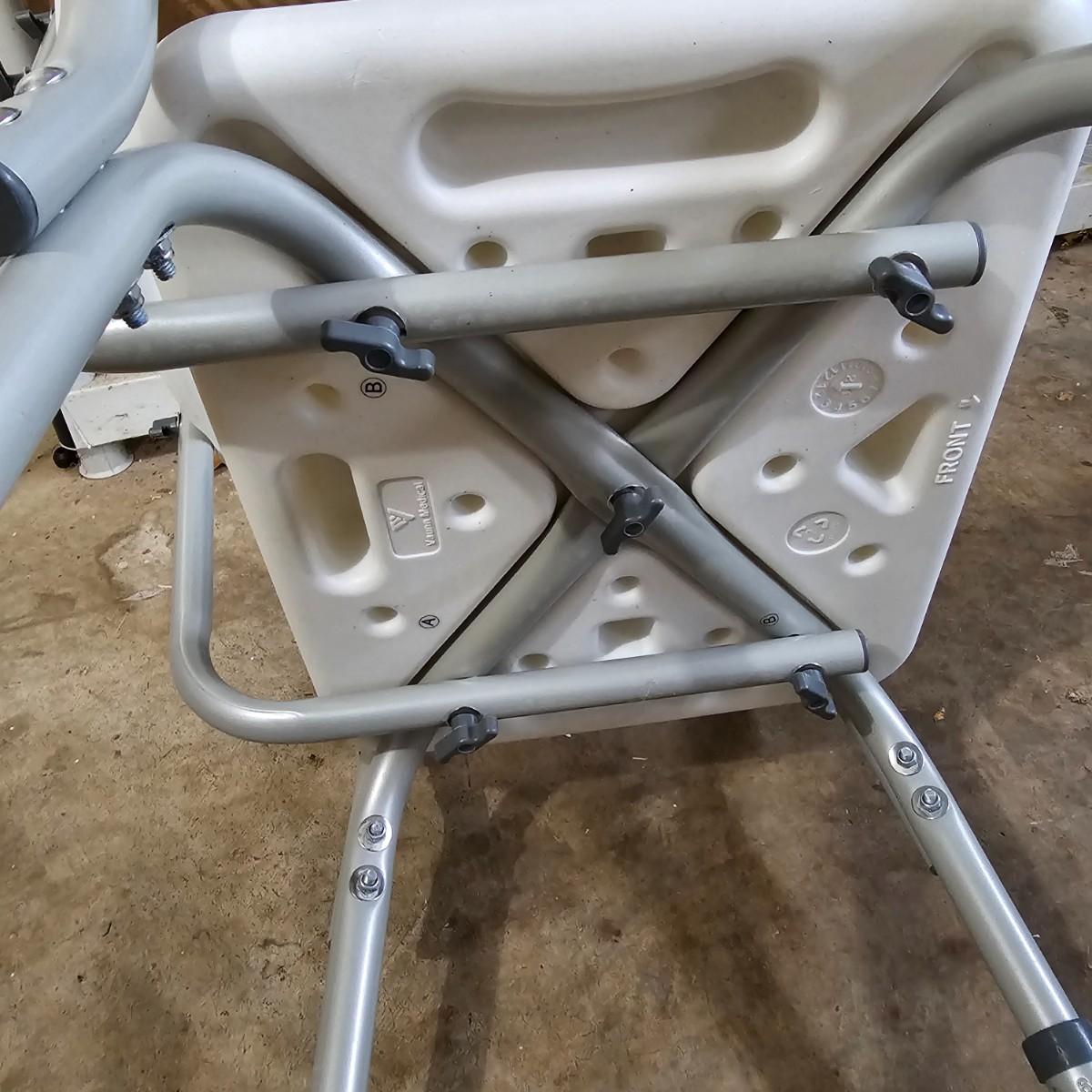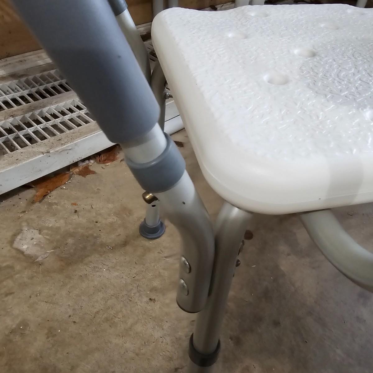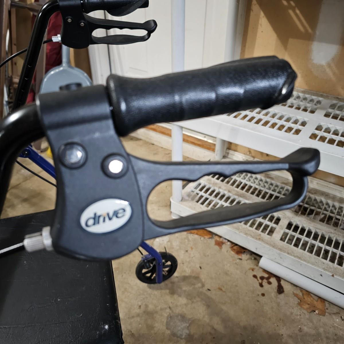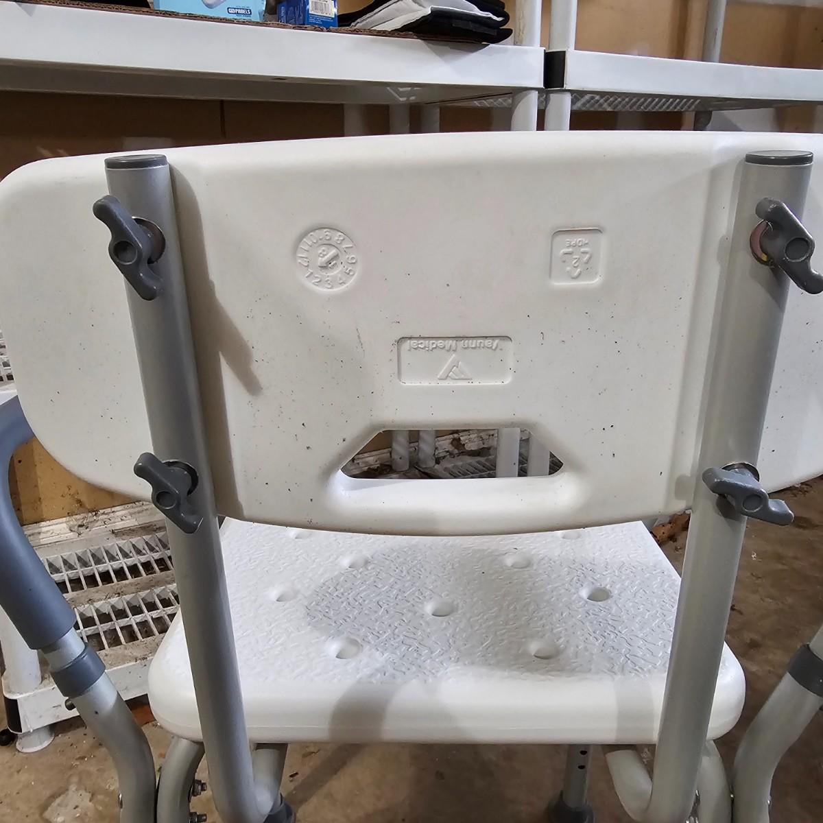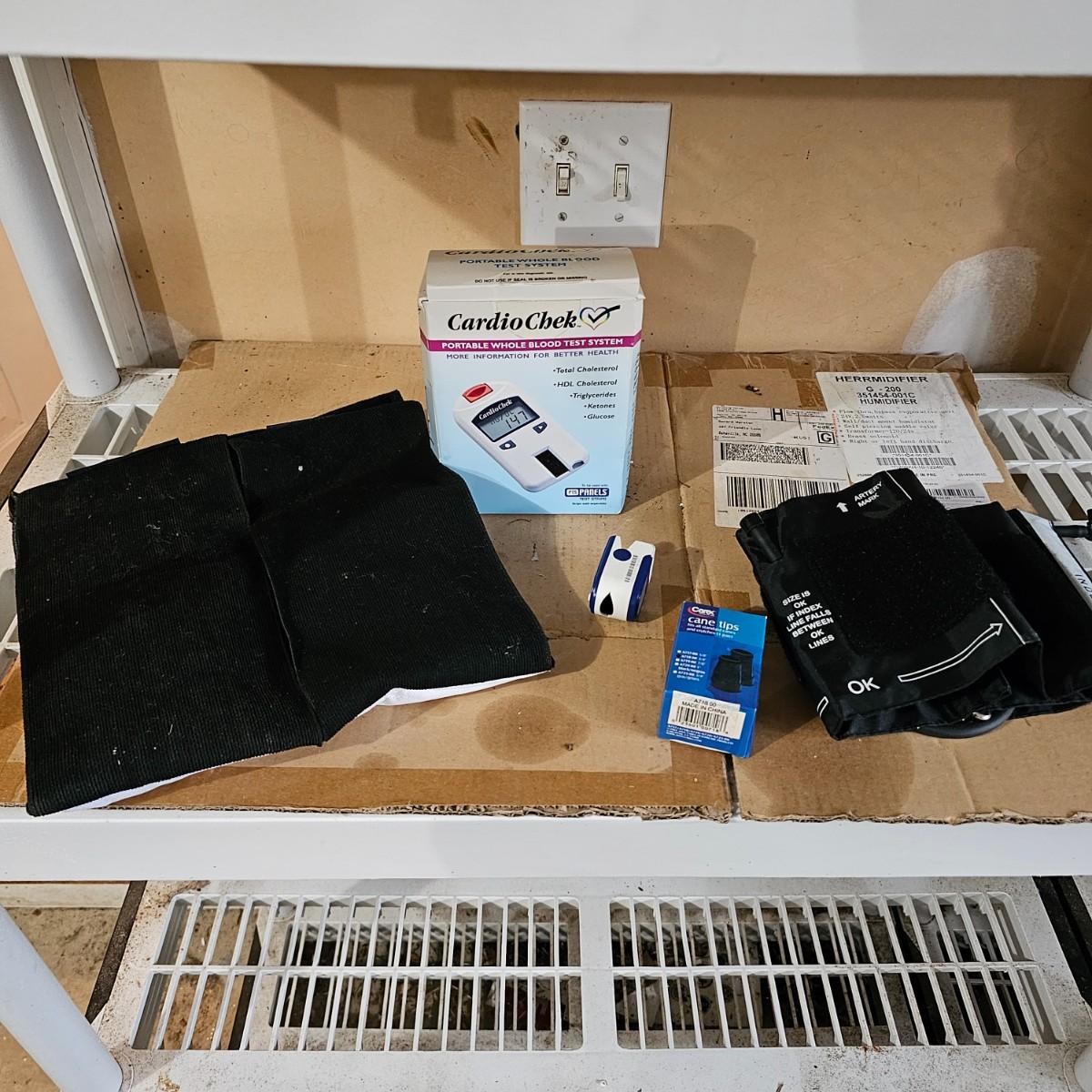 Walkers, crutches and more. Pair of aluminum Medline crutches, 8"x 50"H and adjustable. One adjustable hand cane with brown finish. A plastic shower chair that measures 25" x 19" x 32"H, also adjustable. Three walkers, one Drive unit with handles, brakes and seat. 23" x 24" x 36"H with 20" seat height and locking brake handle. Folds to 13" x 41". Two smaller walkers, one Drive is 20" x 16" x 29"H, comes with add on 5" wheel posts. Other item is 20" x 21" x 35"H, has wheels in front and skids in back. Finally a fingertip pulse oximiter, a cardio chek blood tester, a cold pack, extra cane tips and a blood pressure cuff without dial readout. See photos for details. Local pickup only.