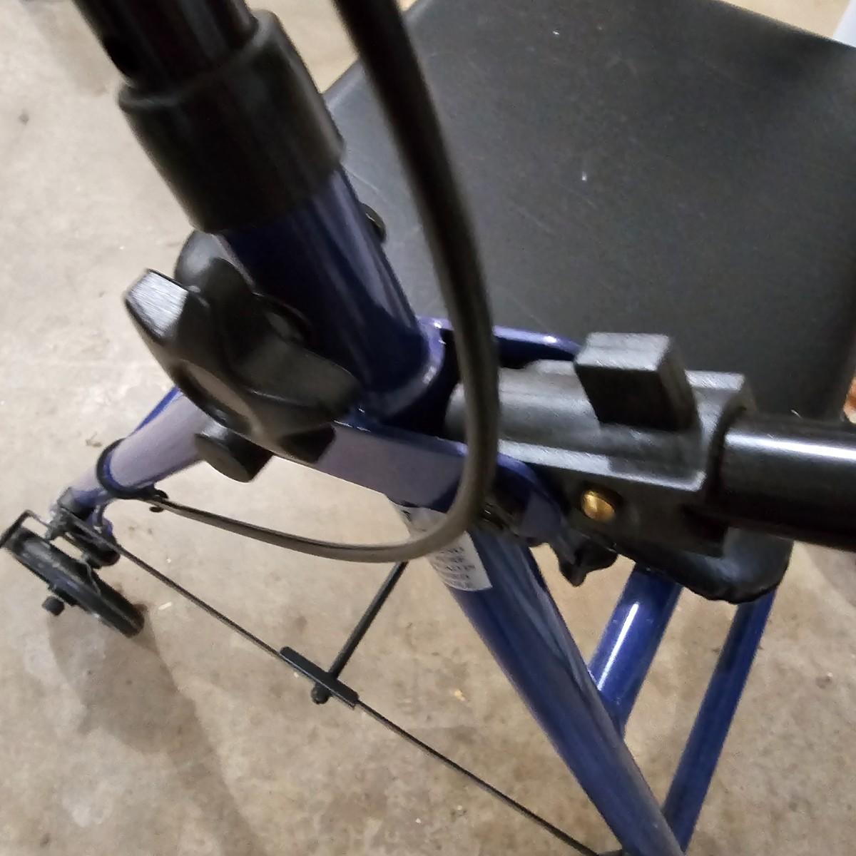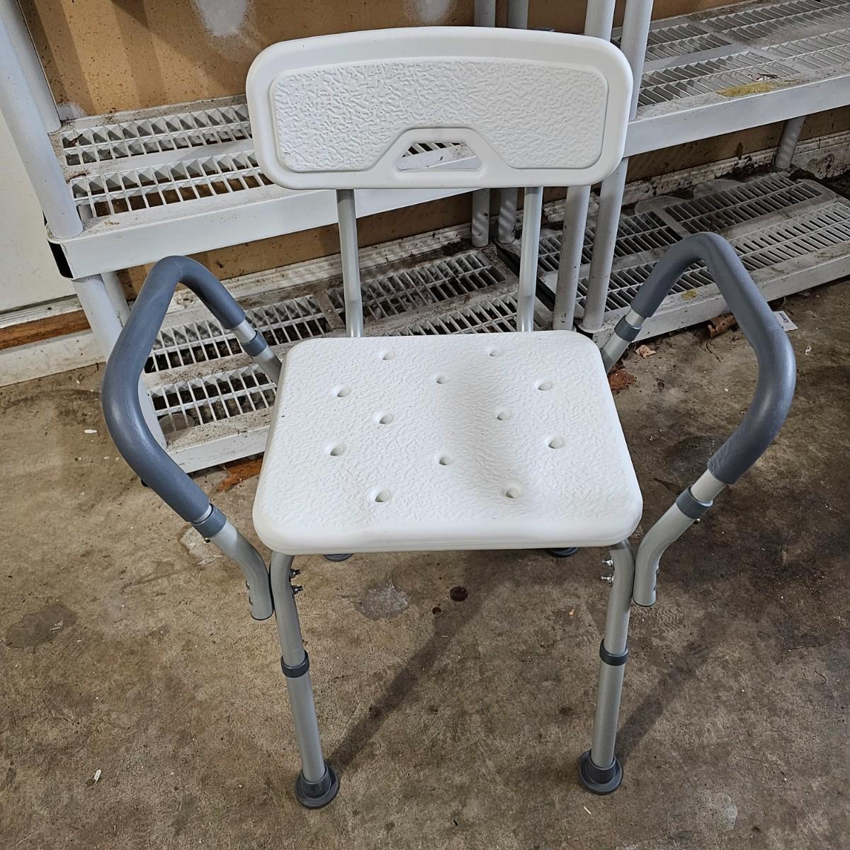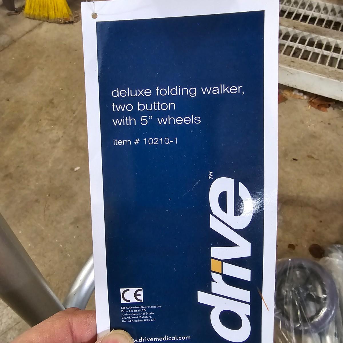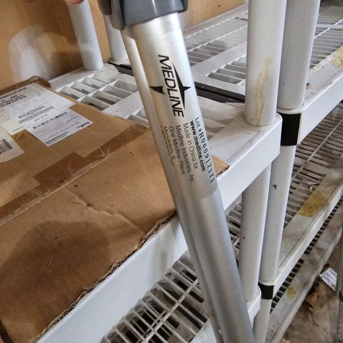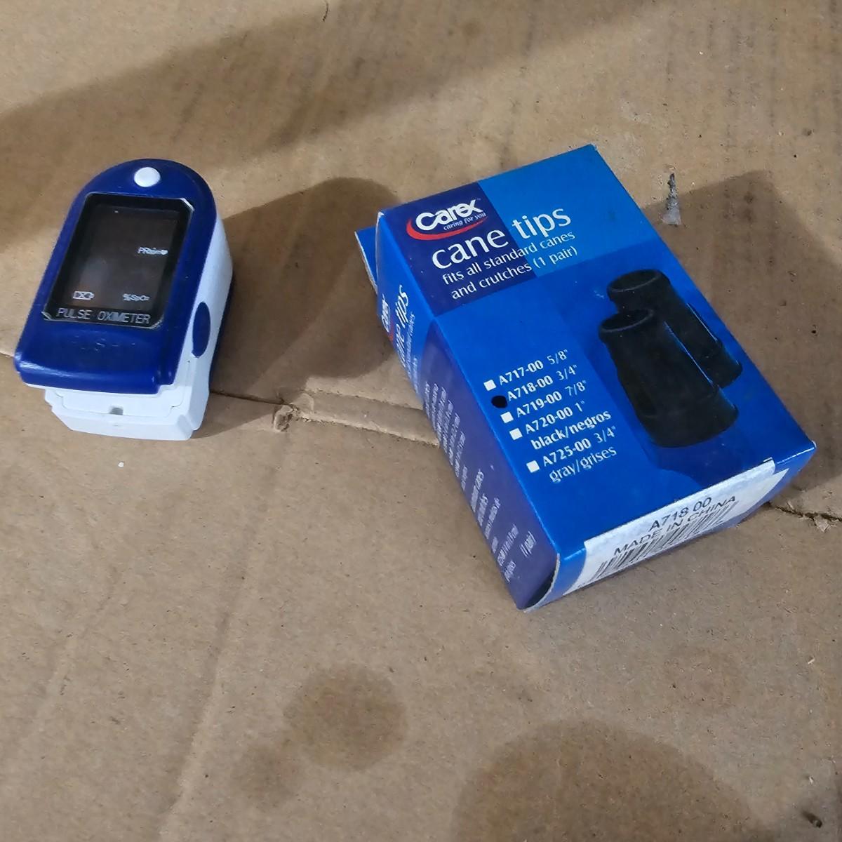 Walkers, crutches and more. Pair of aluminum Medline crutches, 8"x 50"H and adjustable. One adjustable hand cane with brown finish. A plastic shower chair that measures 25" x 19" x 32"H, also adjustable. Three walkers, one Drive unit with handles, brakes and seat. 23" x 24" x 36"H with 20" seat height and locking brake handle. Folds to 13" x 41". Two smaller walkers, one Drive is 20" x 16" x 29"H, comes with add on 5" wheel posts. Other item is 20" x 21" x 35"H, has wheels in front and skids in back. Finally a fingertip pulse oximiter, a cardio chek blood tester, a cold pack, extra cane tips and a blood pressure cuff without dial readout. See photos for details. Local pickup only.