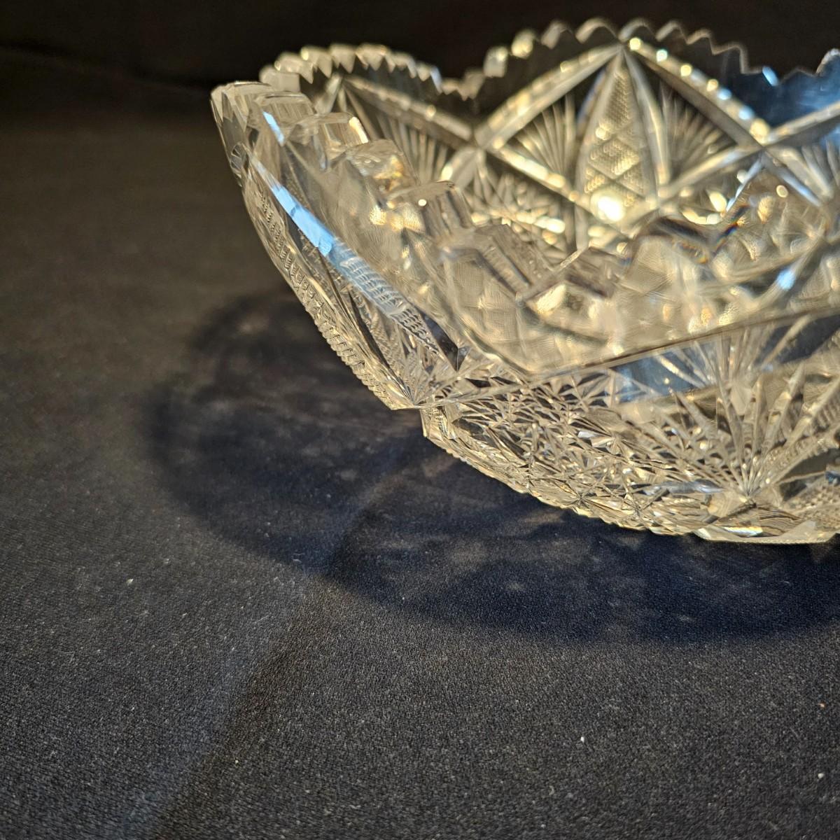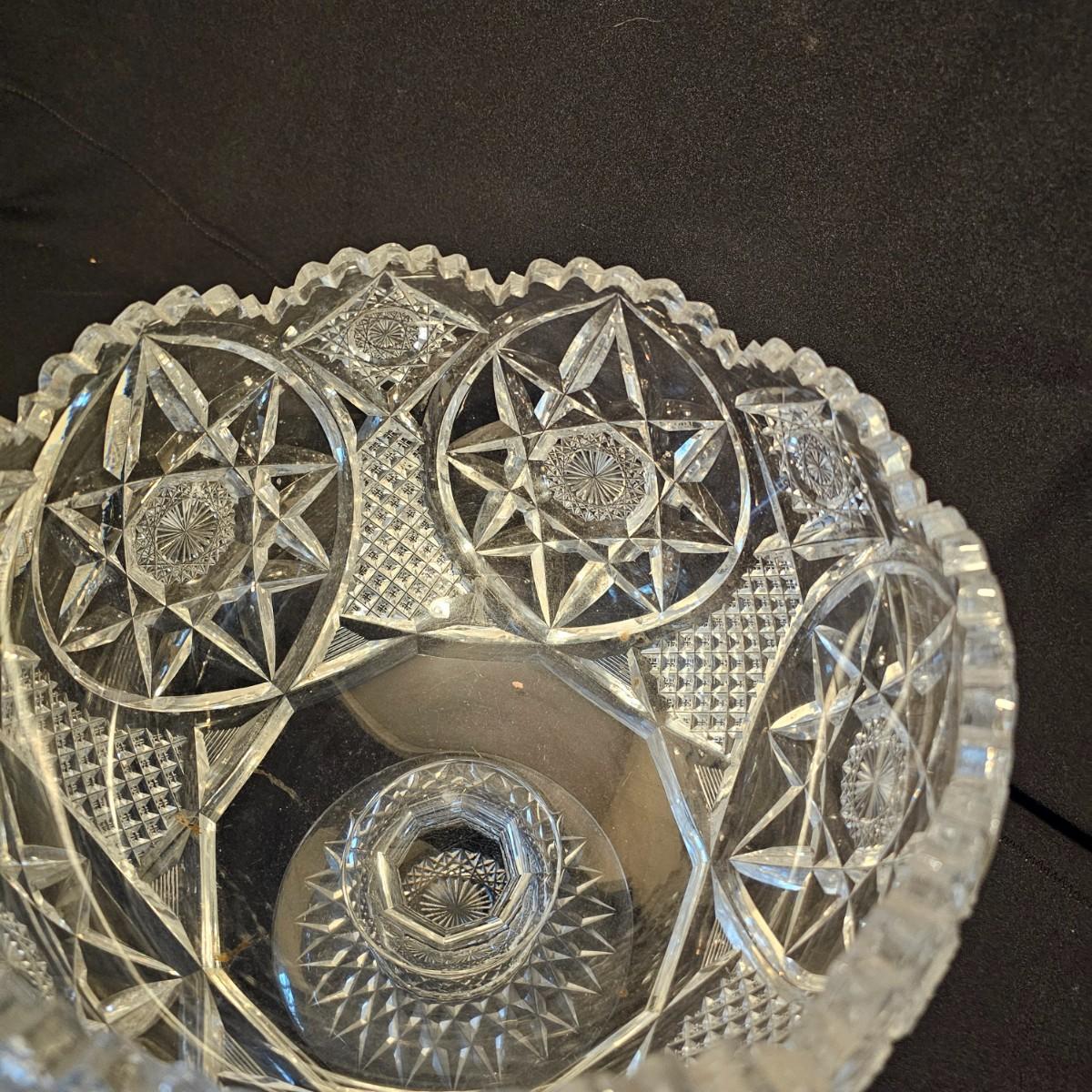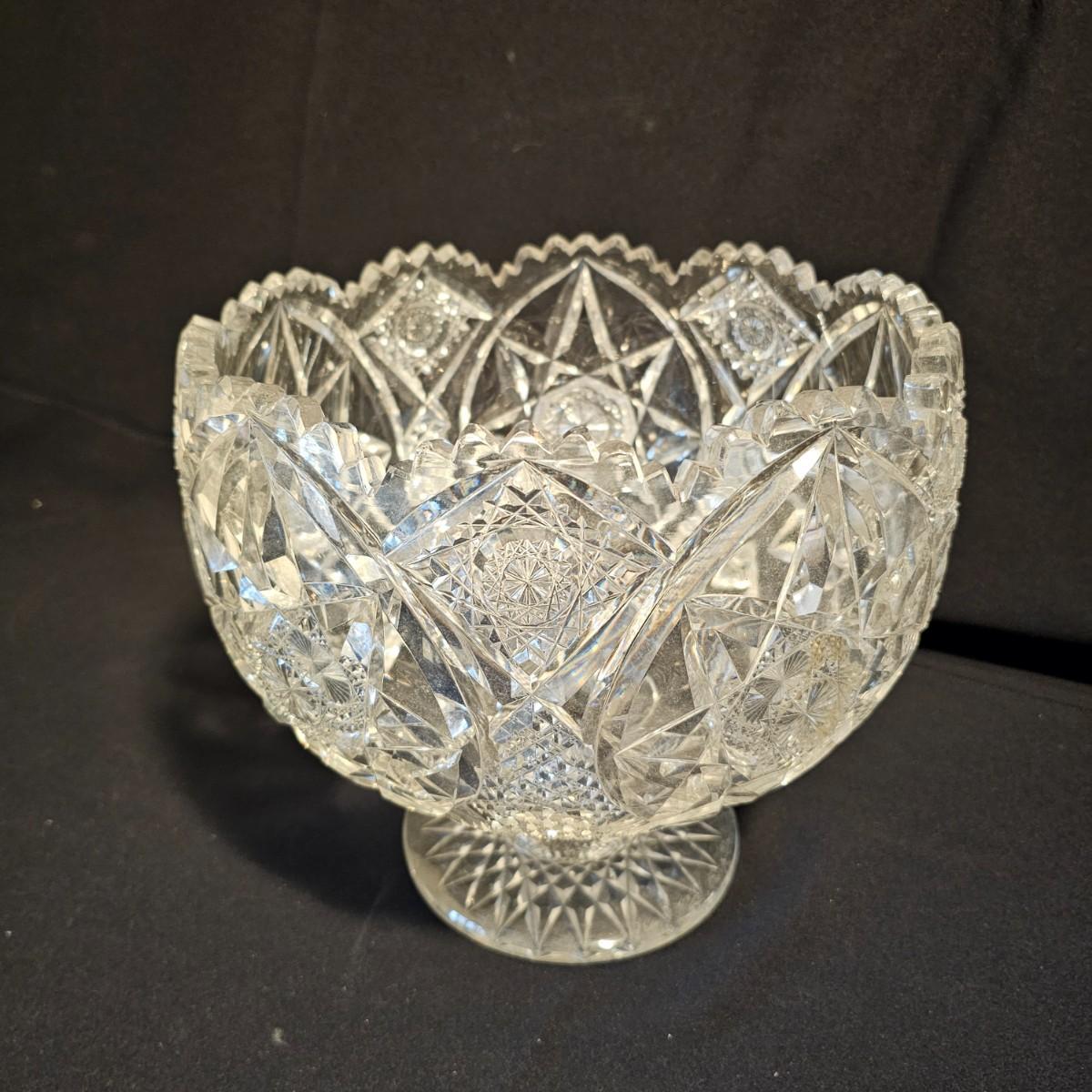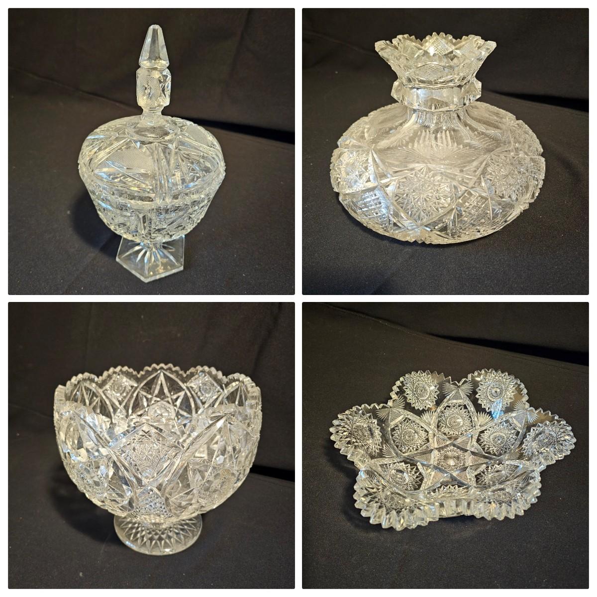 Six different types and shapes of cut lead glass crystal in the Americana Brilliant style, including hobstars and fan pattern designs. Large punch bowl, footed candy dish, two matching short leg bowls and more. Punch bowl measures 11"D x 9.5"H, flat piece is 10"D x 6.5"H and the oblong bowl is 11" x 10" x 3"H. No visible nicks but some scratches on bases. See photos for details. Local pickup only.