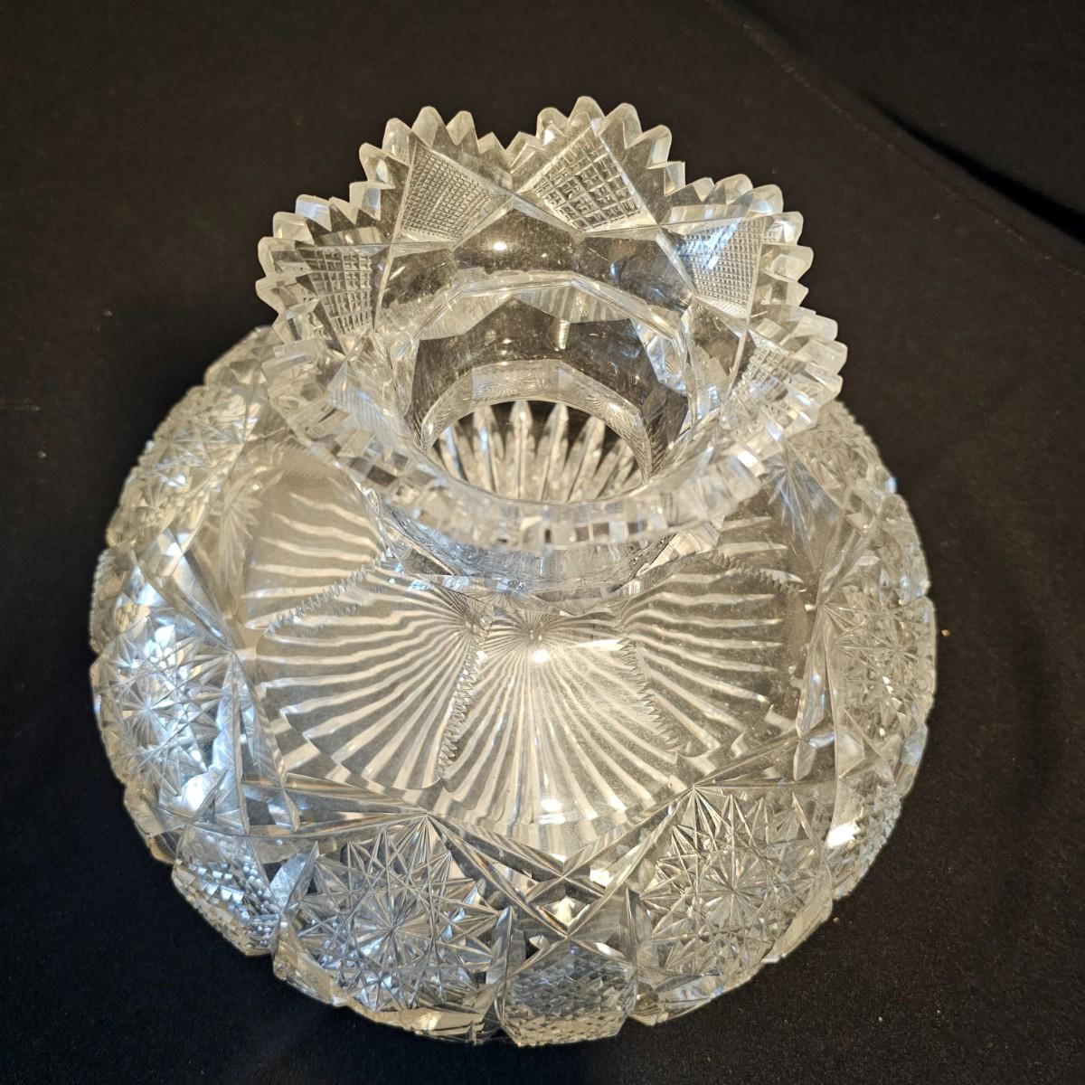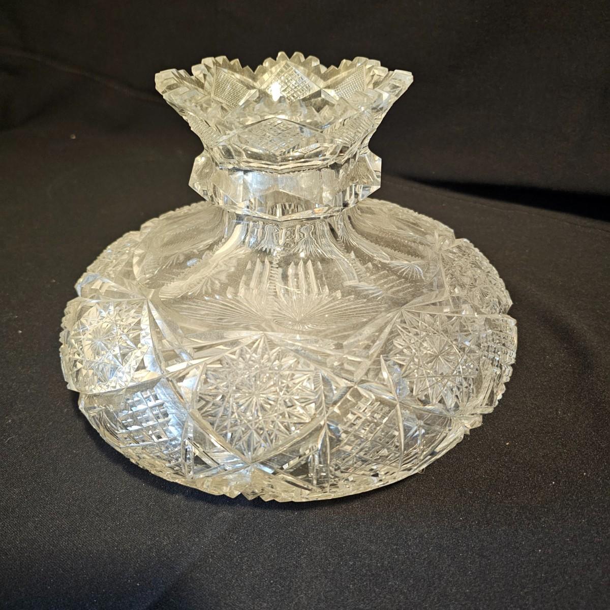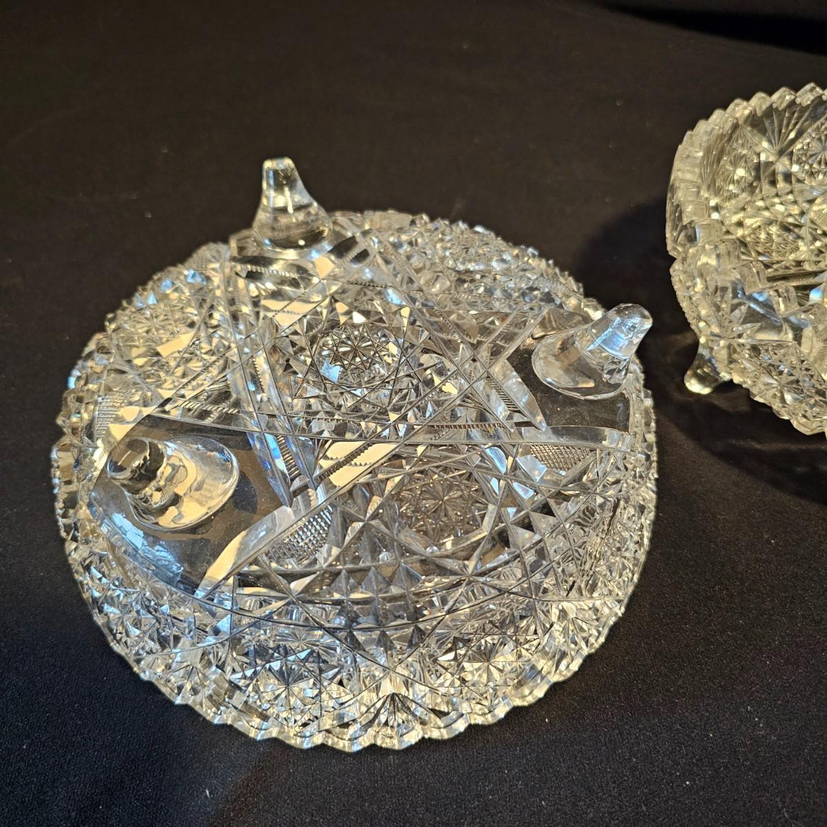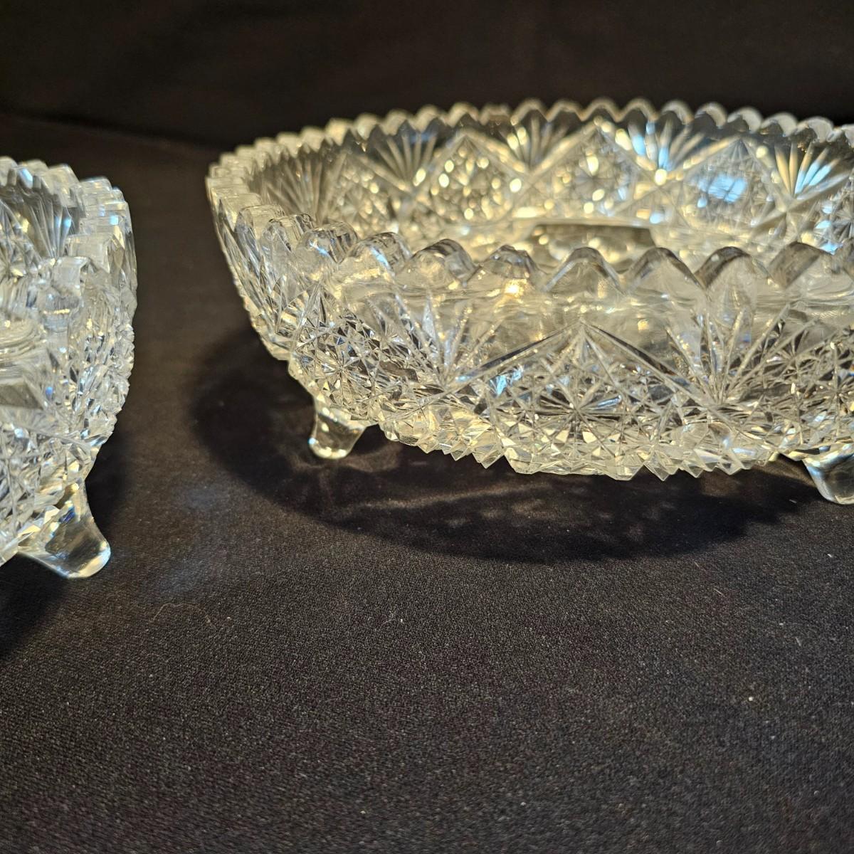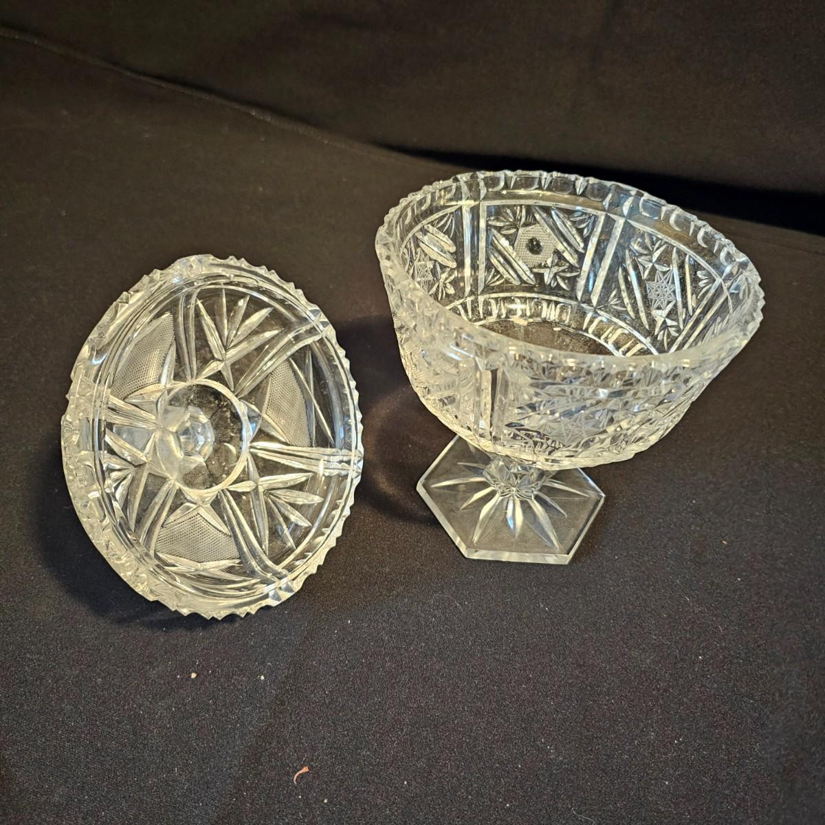 Six different types and shapes of cut lead glass crystal in the Americana Brilliant style, including hobstars and fan pattern designs. Large punch bowl, footed candy dish, two matching short leg bowls and more. Punch bowl measures 11"D x 9.5"H, flat piece is 10"D x 6.5"H and the oblong bowl is 11" x 10" x 3"H. No visible nicks but some scratches on bases. See photos for details. Local pickup only.