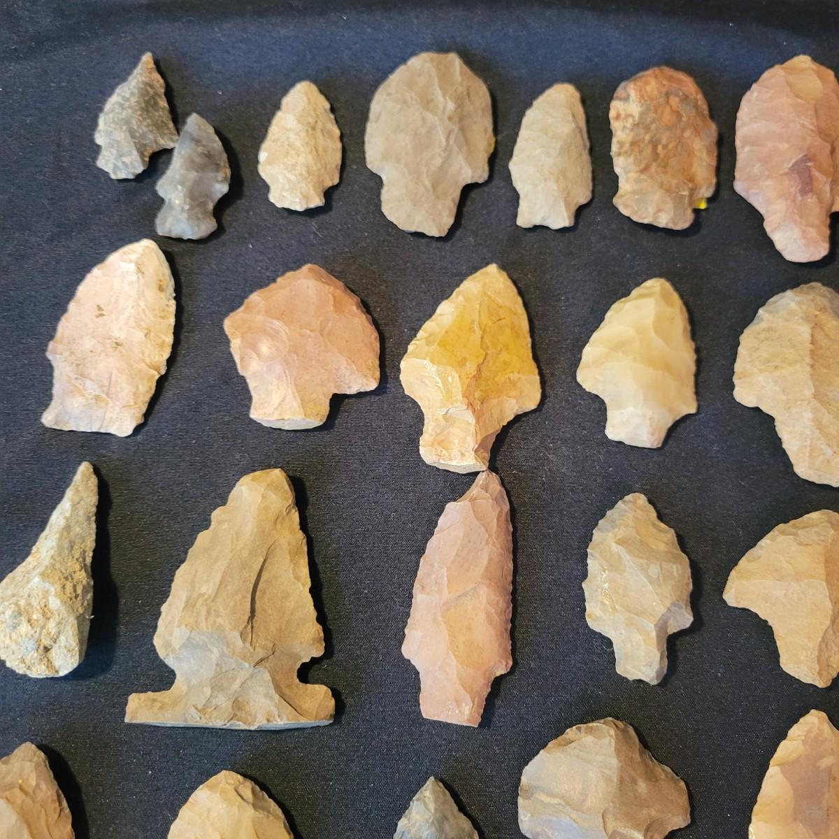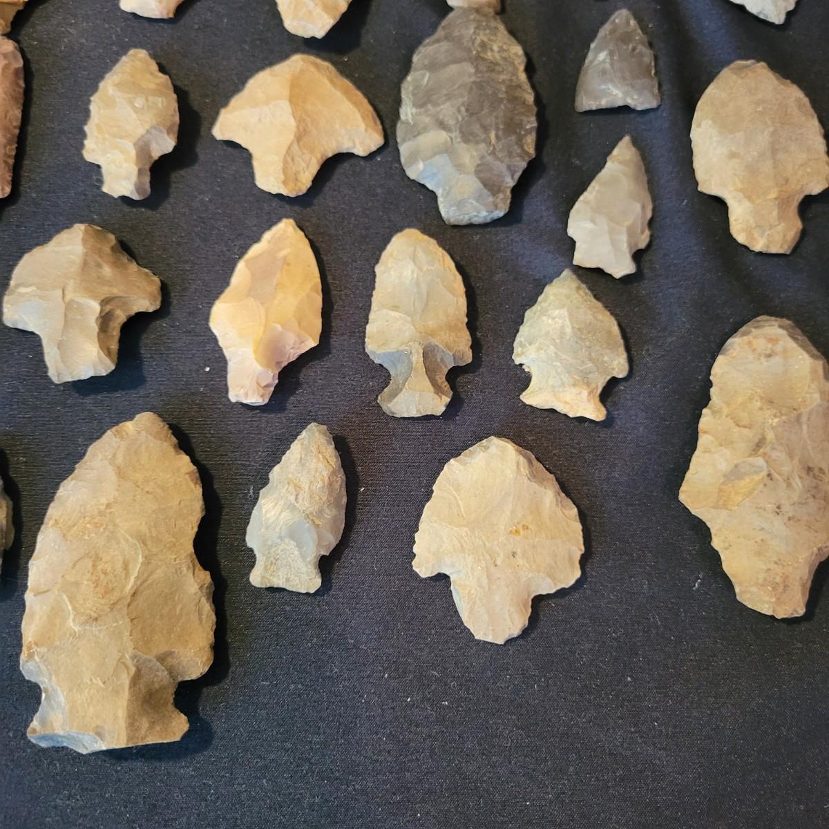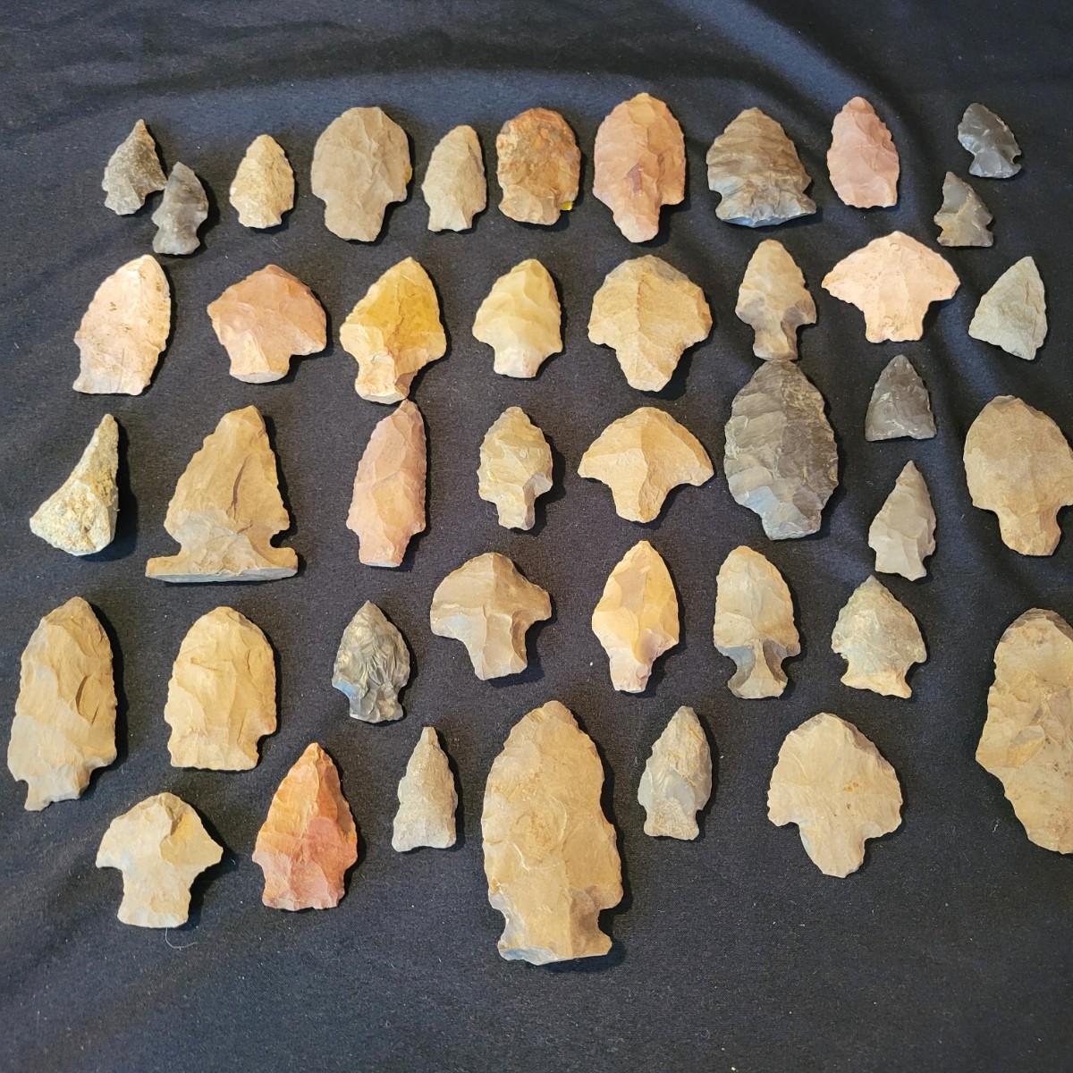 An assortment of over 35 arrowheads in a variety of sizes, conditions and materials. The largest pieces measure approximately 3" in length. These appear to have been glued to a board at some point, as there is residue on the backs of many of them. Shipping available
