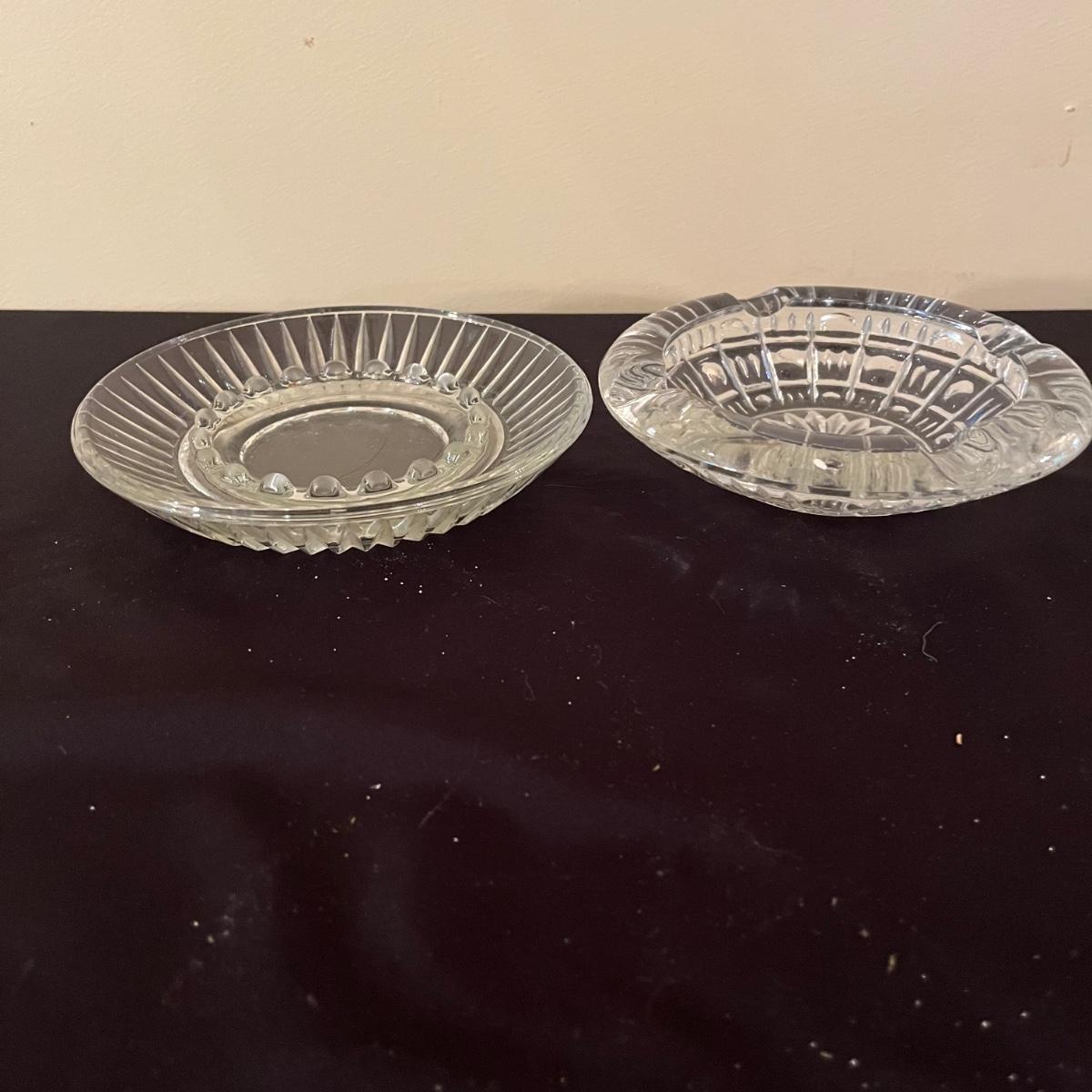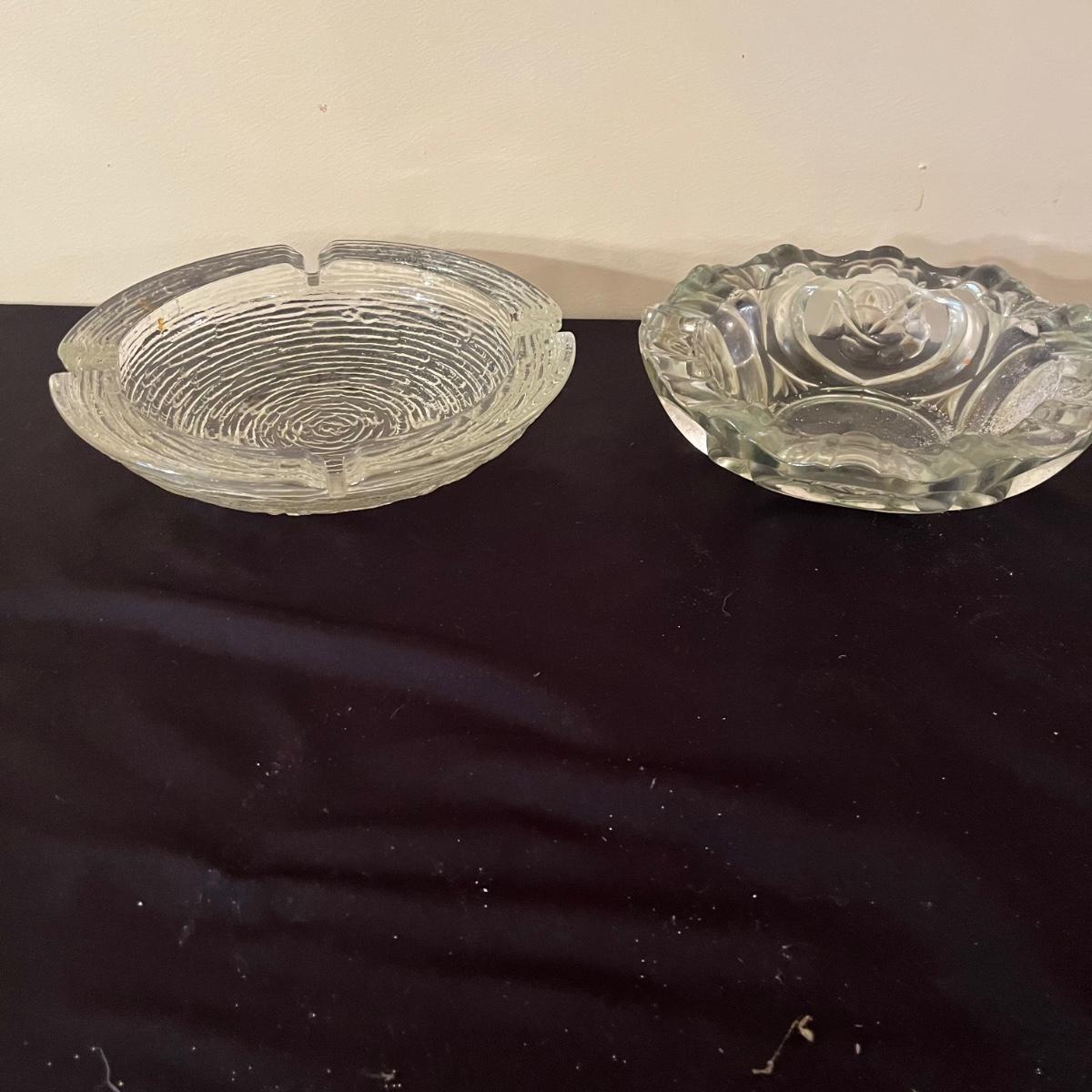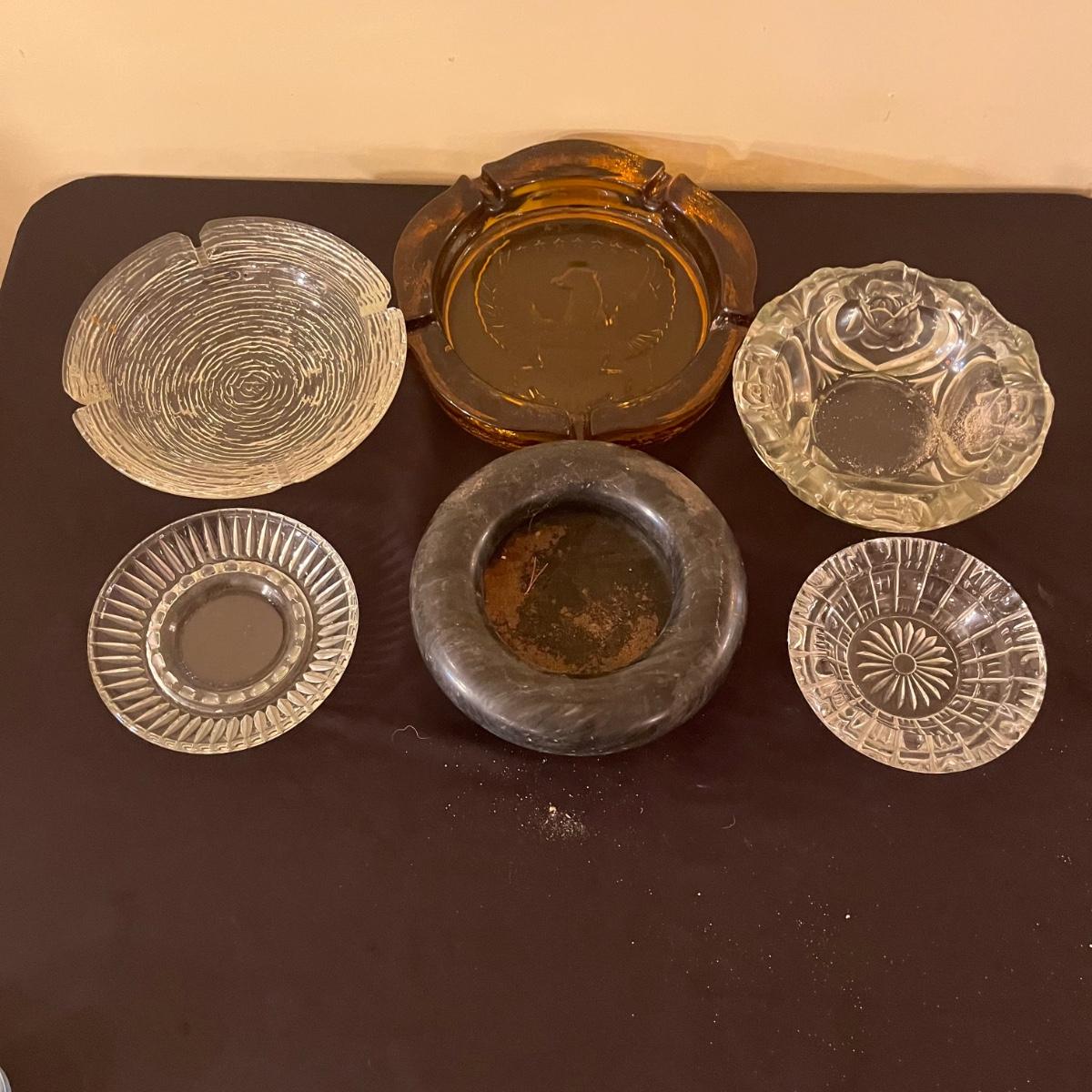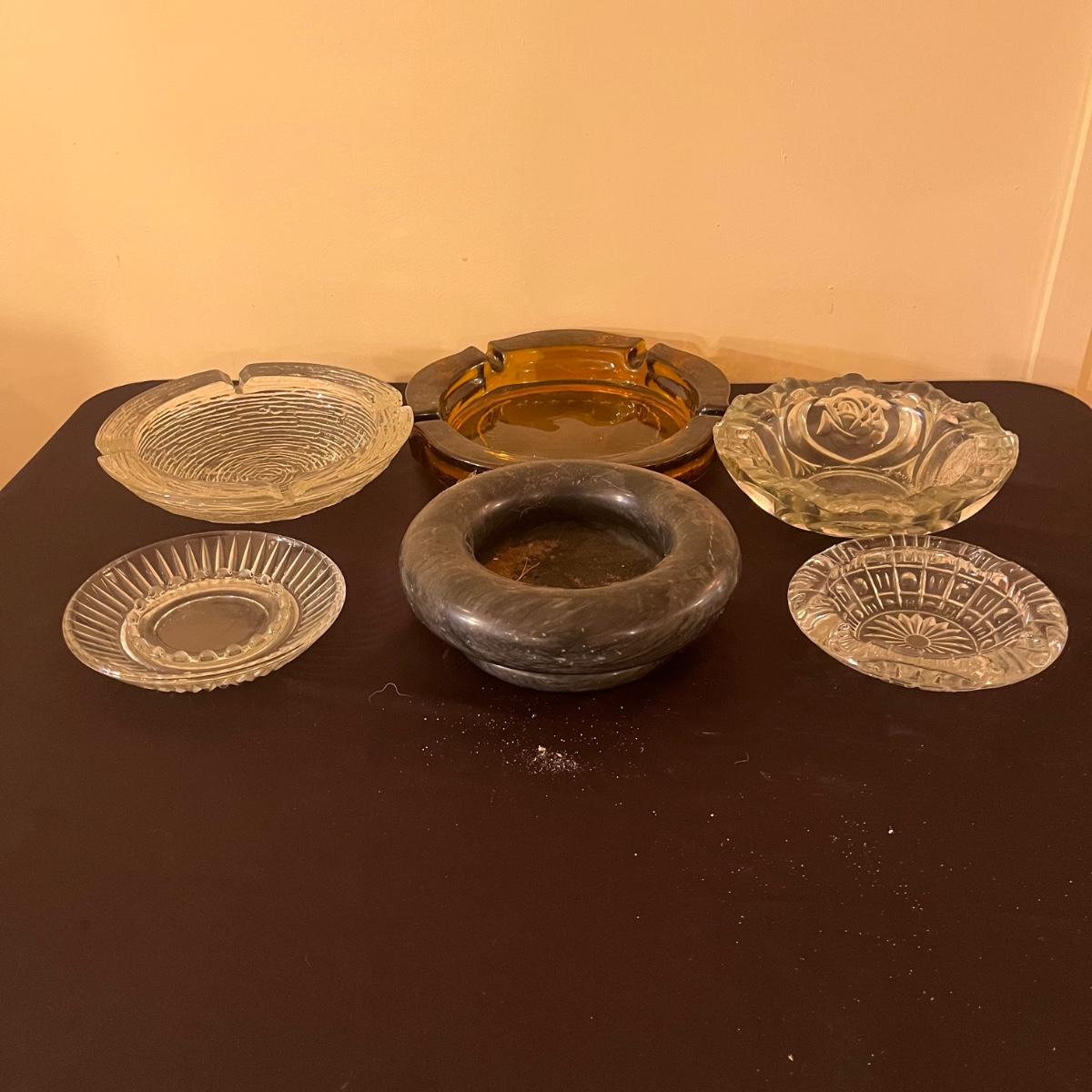 Lot includes four clear glass ashtrays, yellow glass ashtray and a heavy stone ashtray/bowl. Largest ashtray measures 10”D x 2” tall.