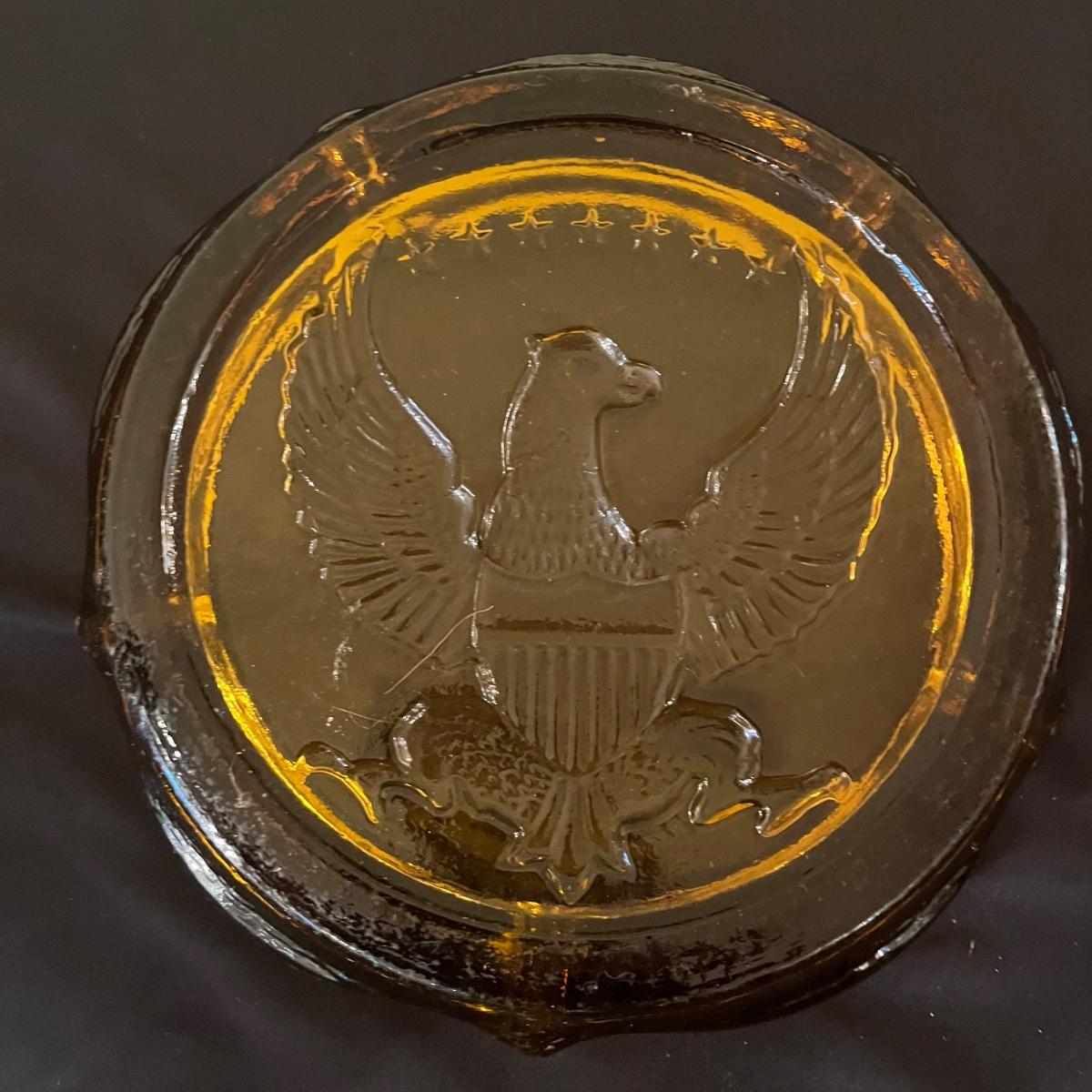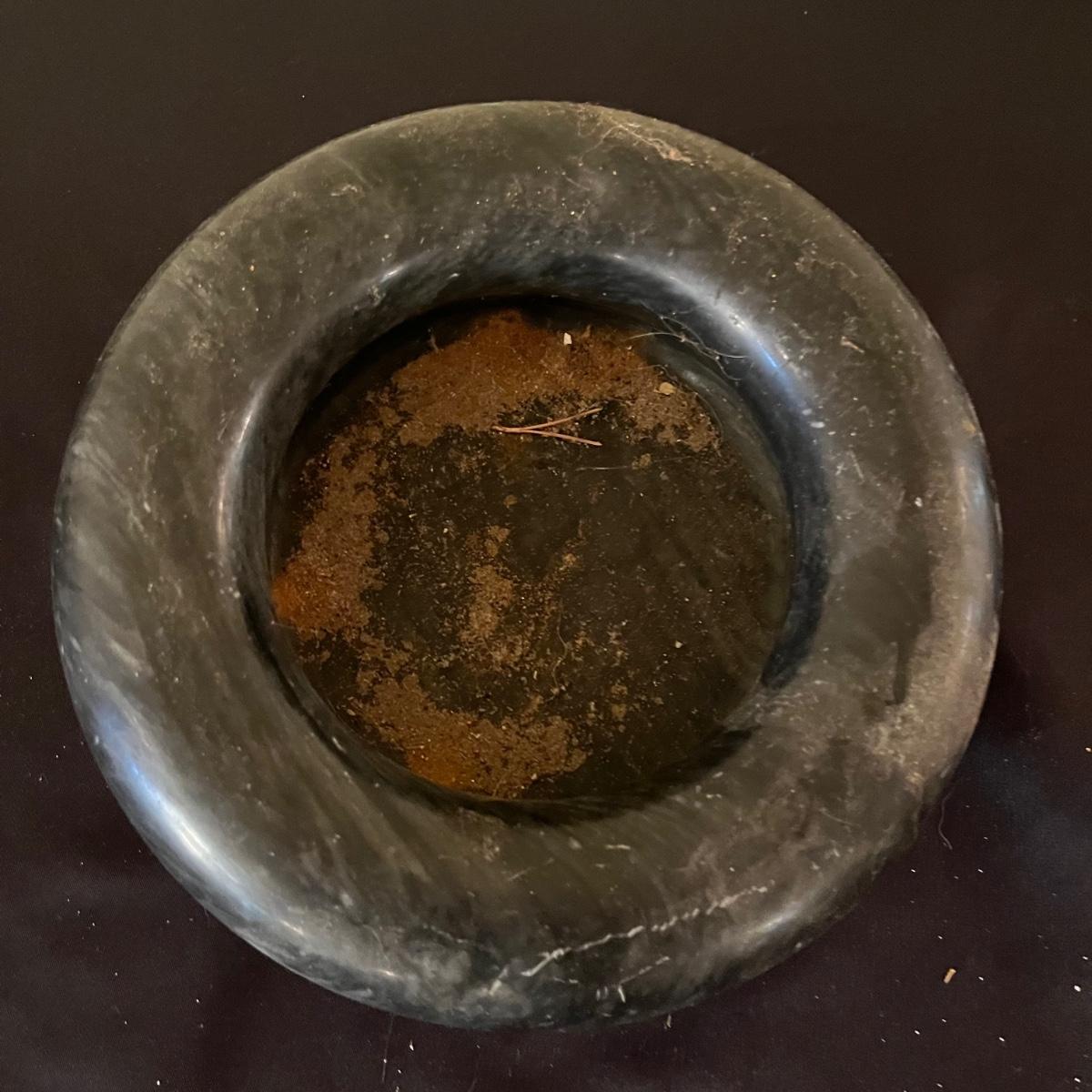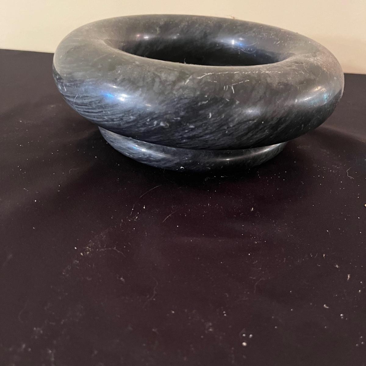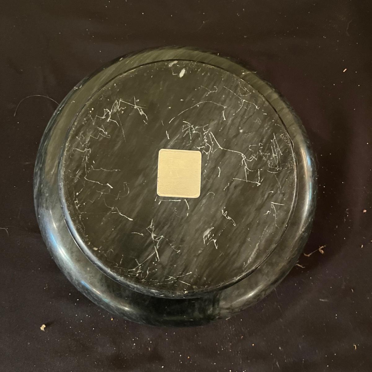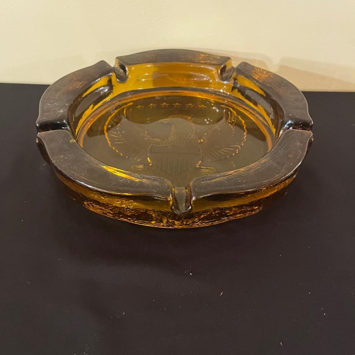 Lot includes four clear glass ashtrays, yellow glass ashtray and a heavy stone ashtray/bowl. Largest ashtray measures 10”D x 2” tall.