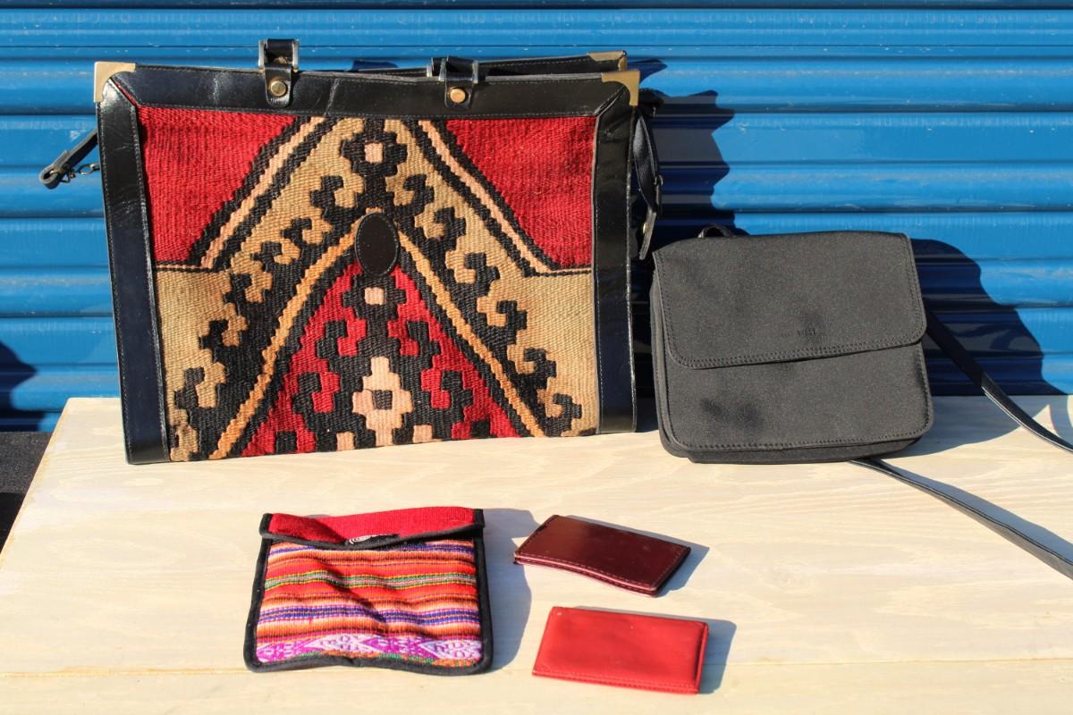 Assortment of bags.  Turkish bag, nine west bag, two small card wallets
