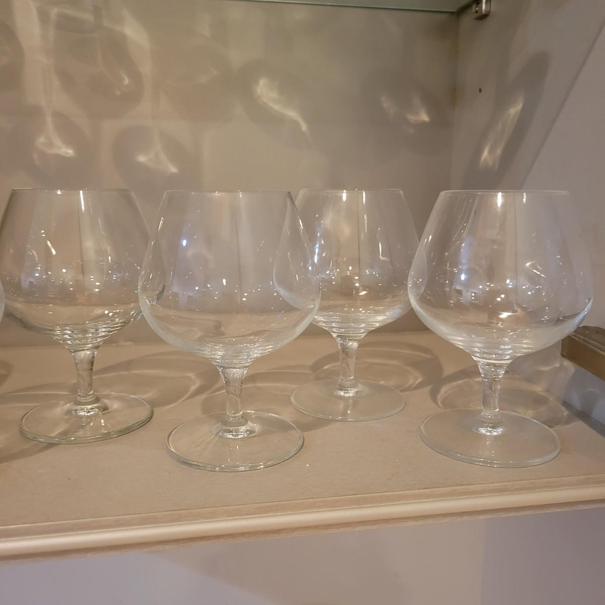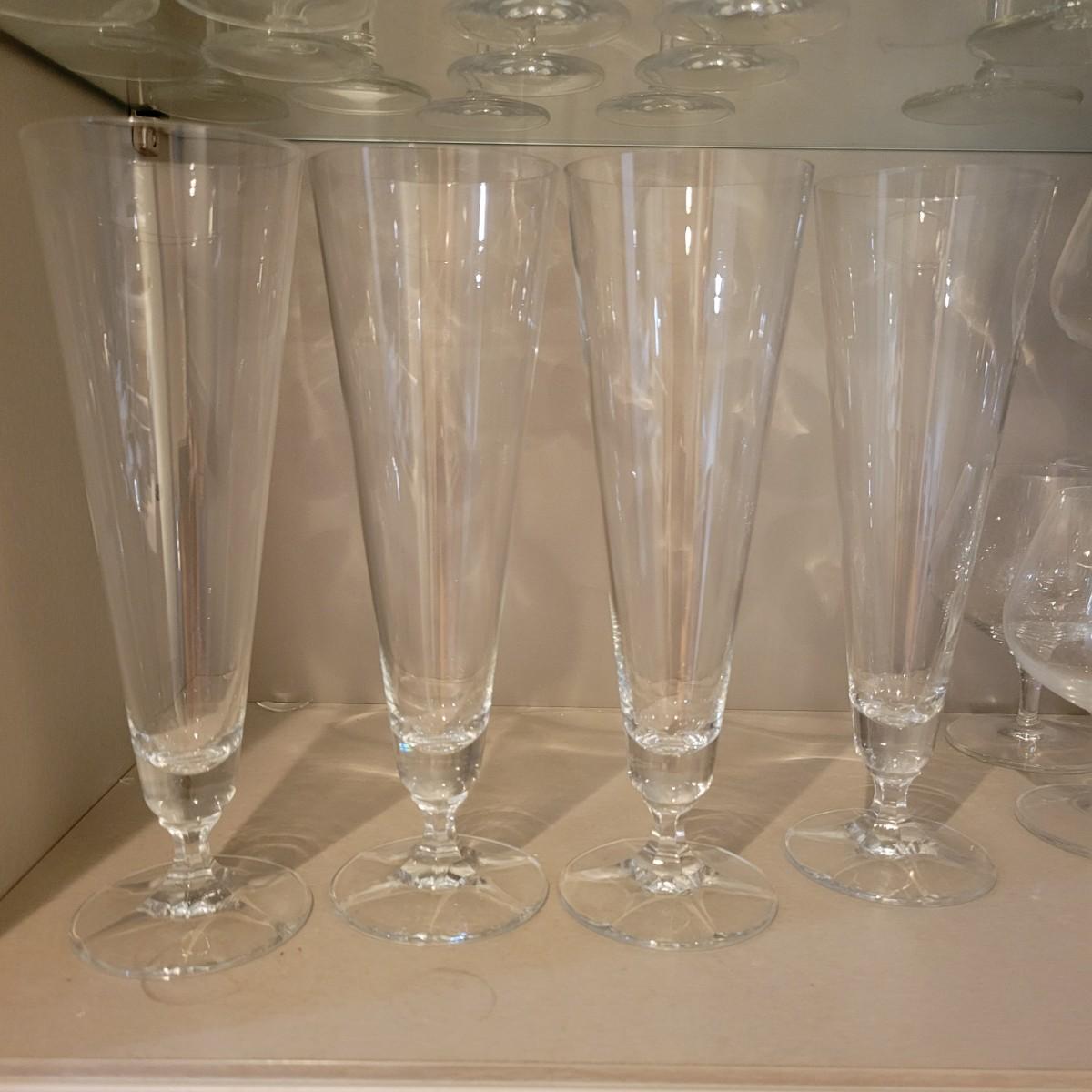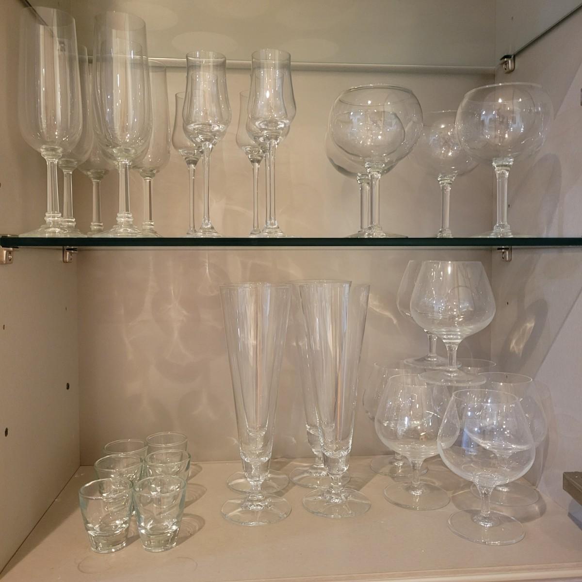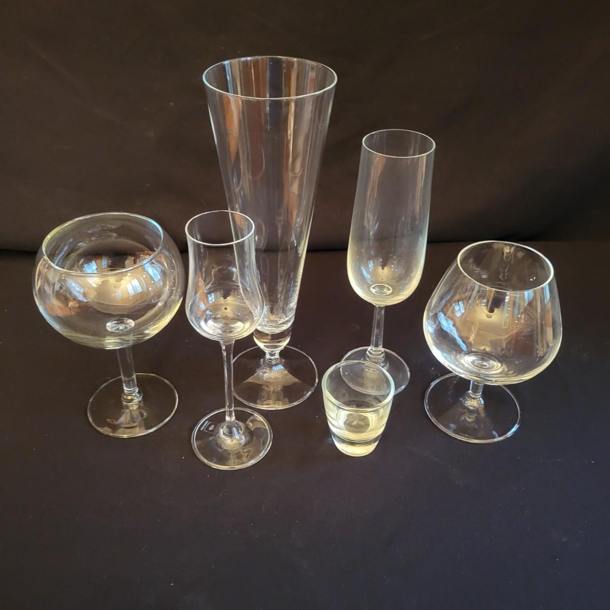 An assortment of bar glasses in a variety of shapes and sizes. These glasses range from pilsner glasses to sherry glasses and more. Tallest glasses measures approximately 9.5"H. Local pickup only