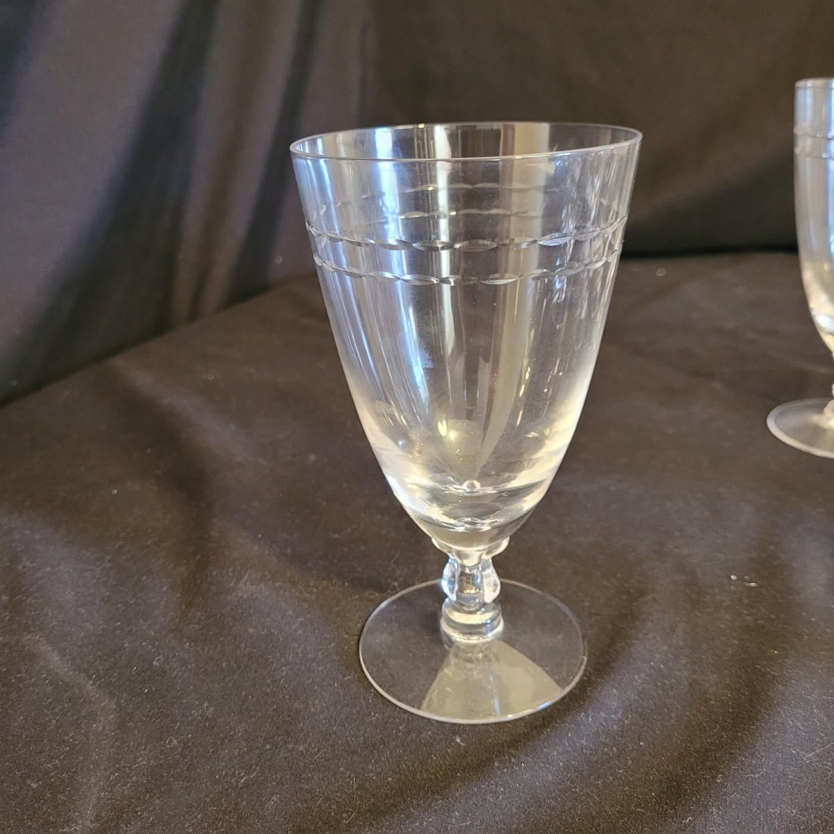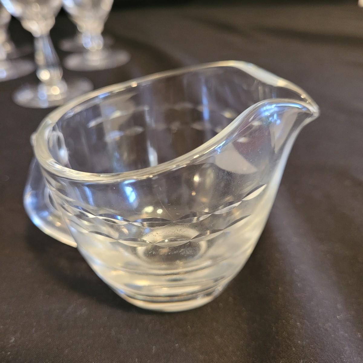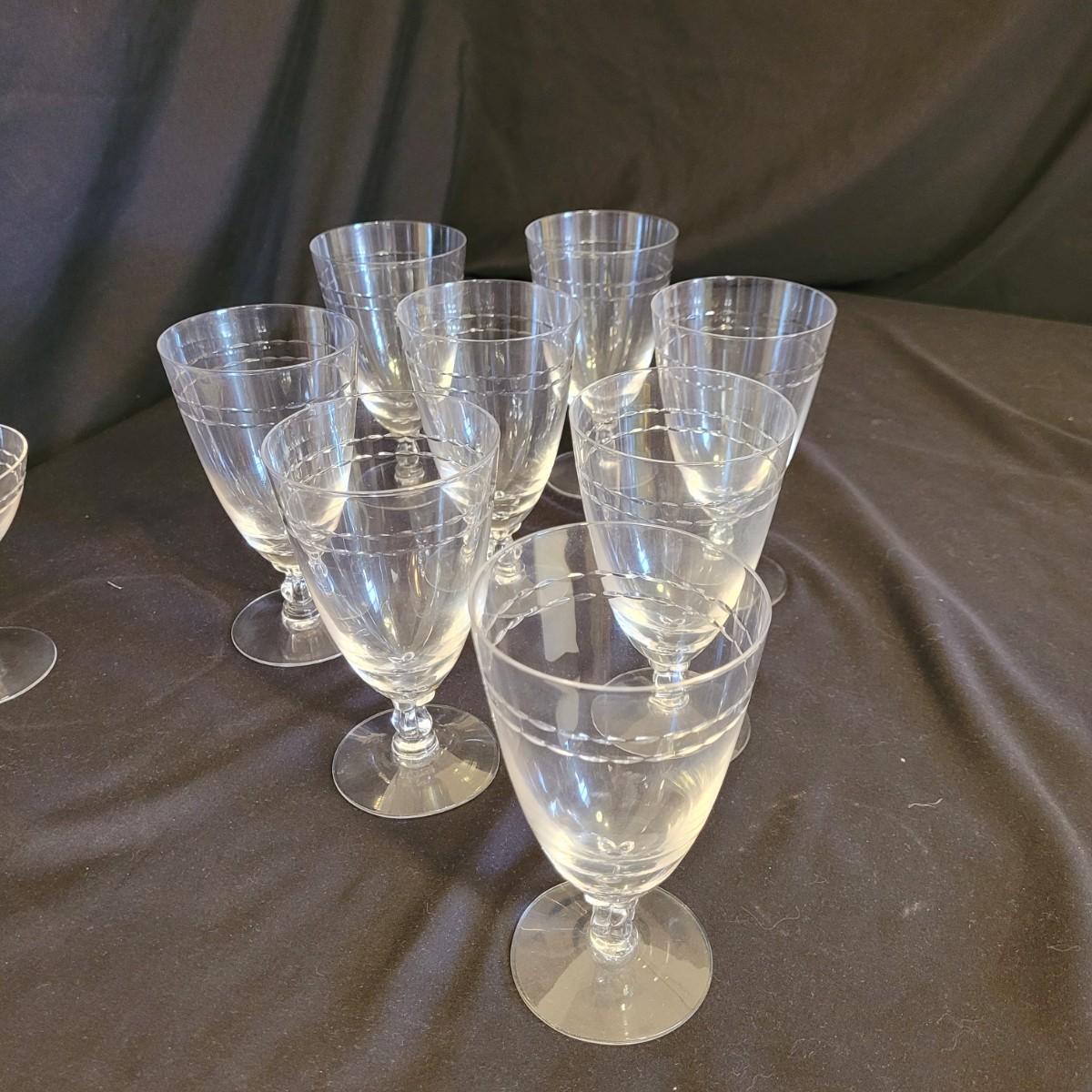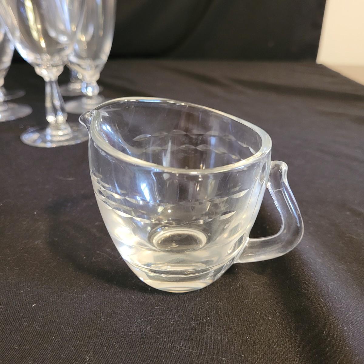 Four different sizes of thin, crystal like glass stemware with simple yet elegant borders make up this lot. Glasses total fourteen in all. Additional items include a small creamer and four 7.5"D plates.
