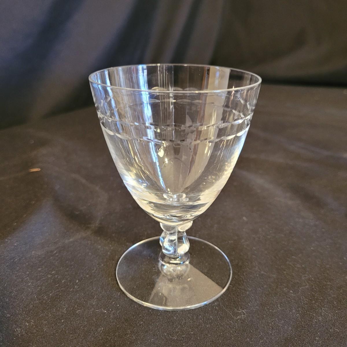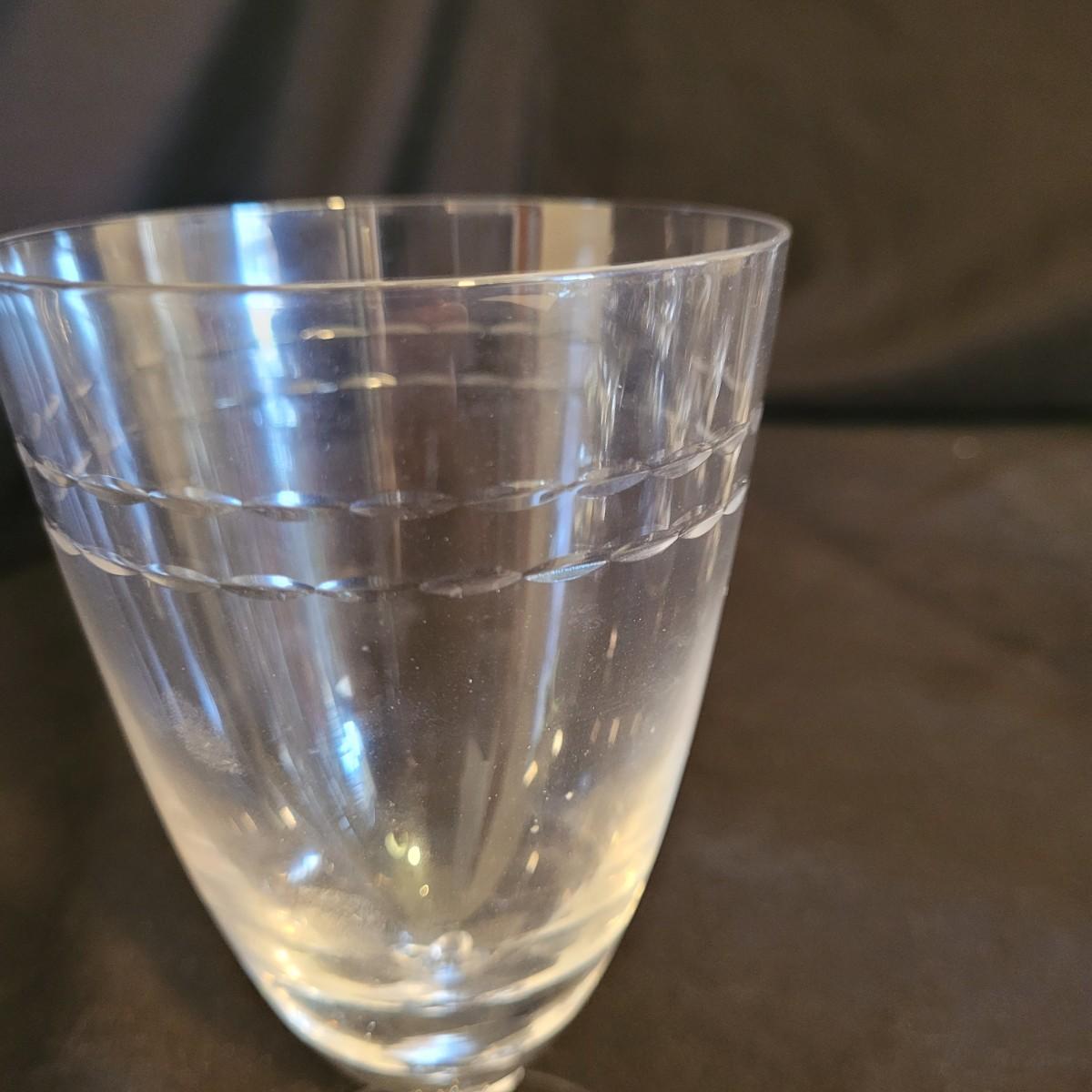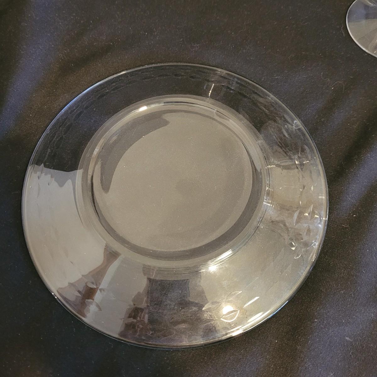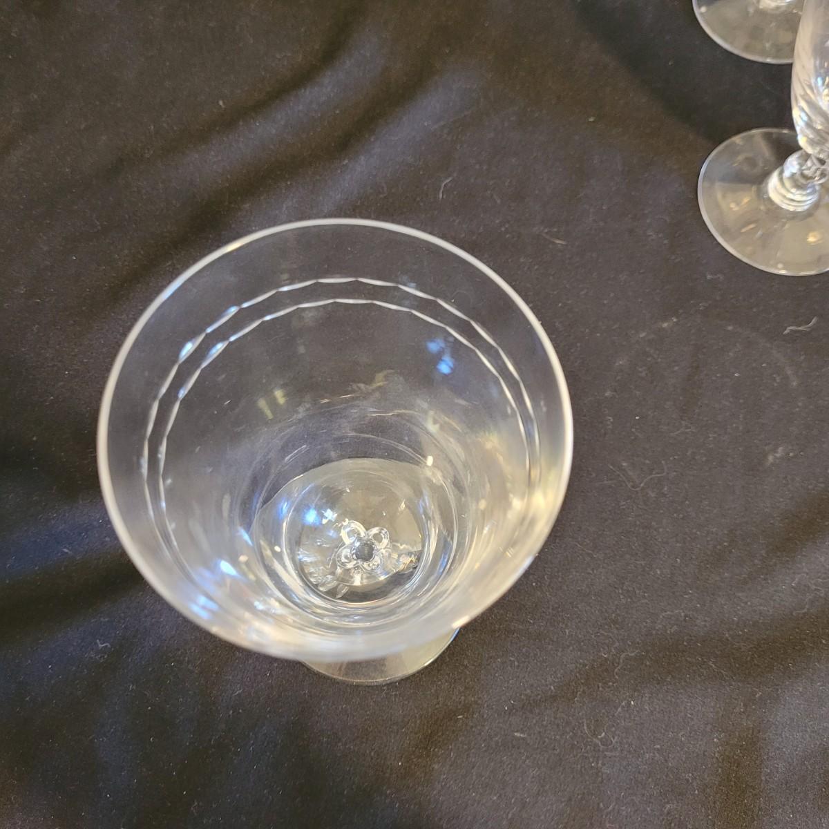 Four different sizes of thin, crystal like glass stemware with simple yet elegant borders make up this lot. Glasses total fourteen in all. Additional items include a small creamer and four 7.5"D plates.