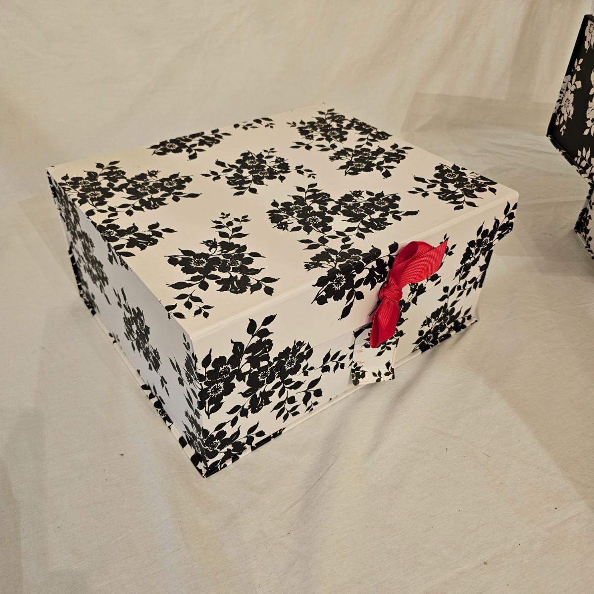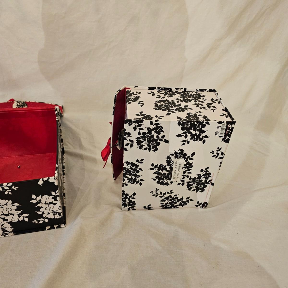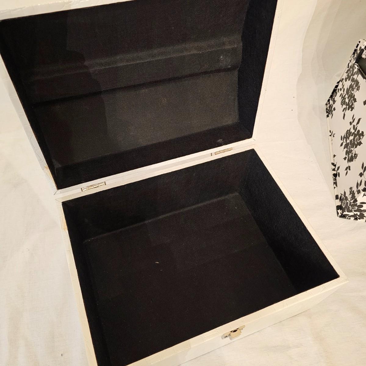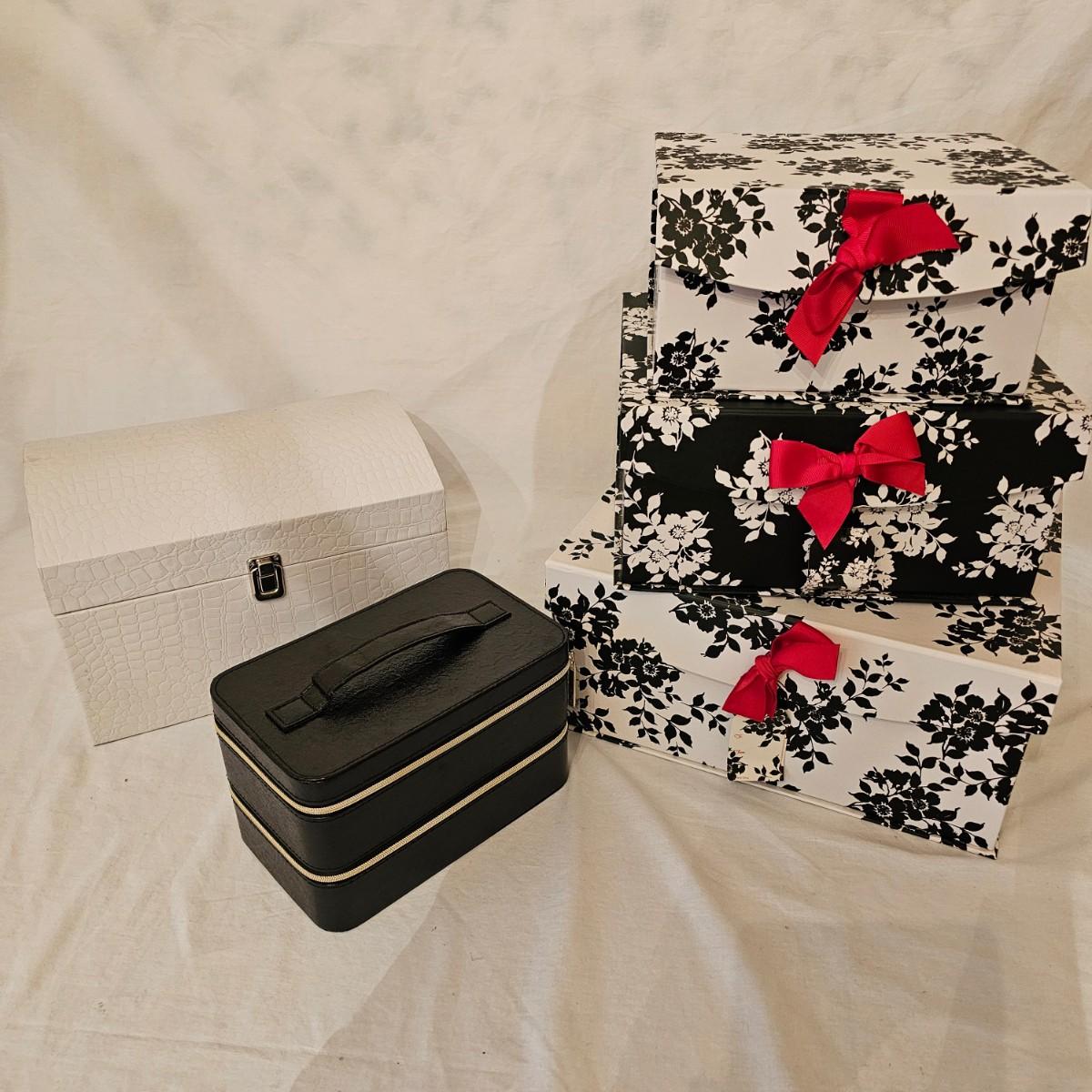 A white domed box with snap closure, 9.5" x 12" x 8"H. Three black & white nesting boxes with velcro snap closures, largest 12" xc14.5" x 6.5"H. Small Lancome zippered case with two compartments, 6" x 9" x 6"H. See photos for details. Shipping available.