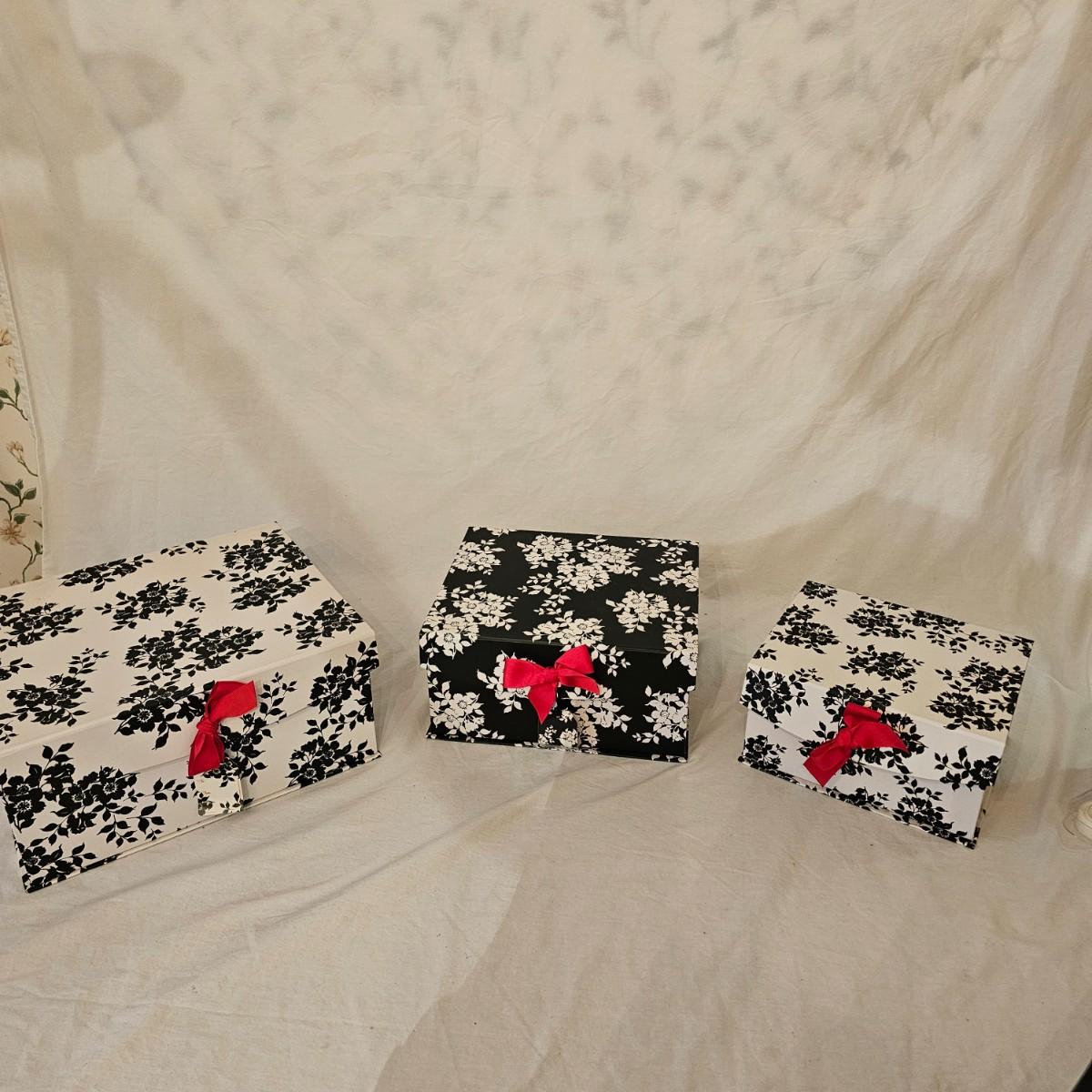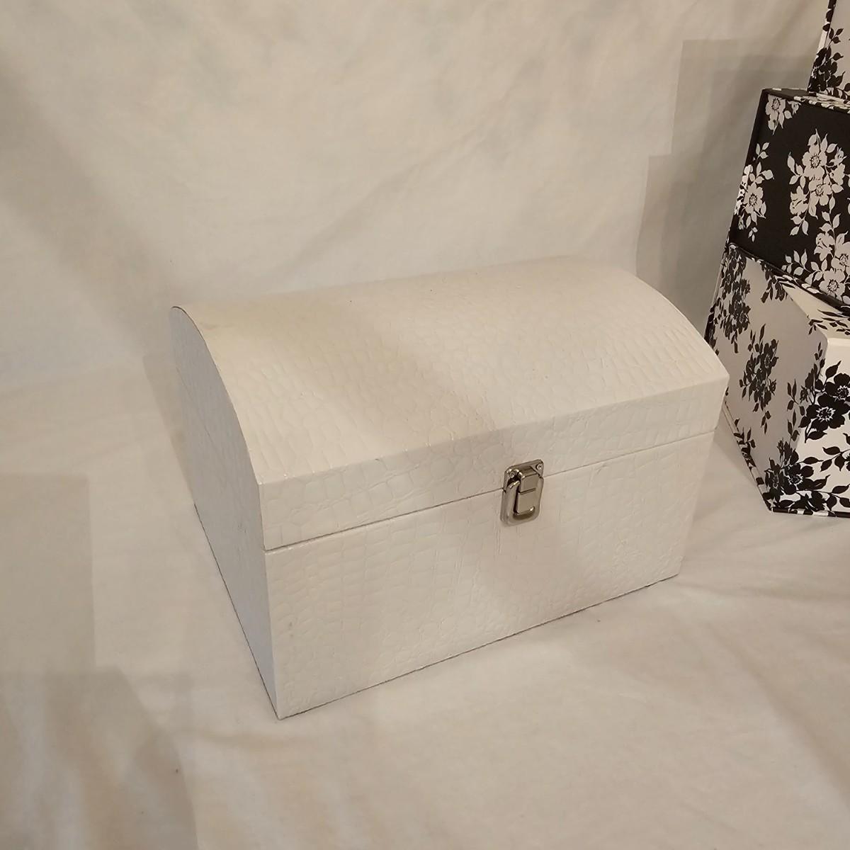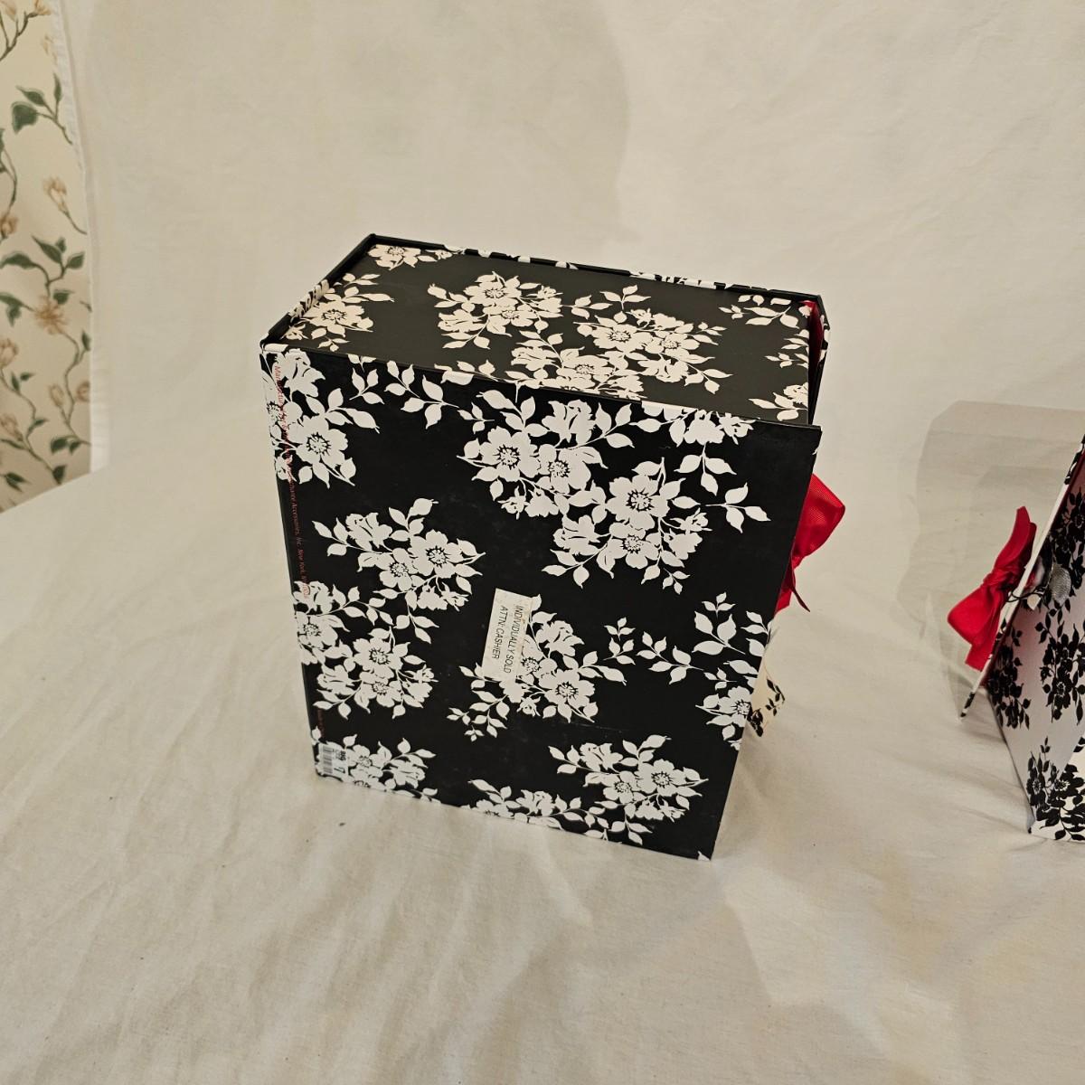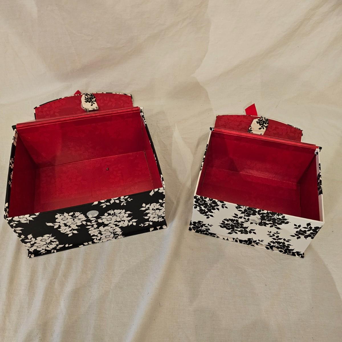 A white domed box with snap closure, 9.5" x 12" x 8"H. Three black & white nesting boxes with velcro snap closures, largest 12" xc14.5" x 6.5"H. Small Lancome zippered case with two compartments, 6" x 9" x 6"H. See photos for details. Shipping available.