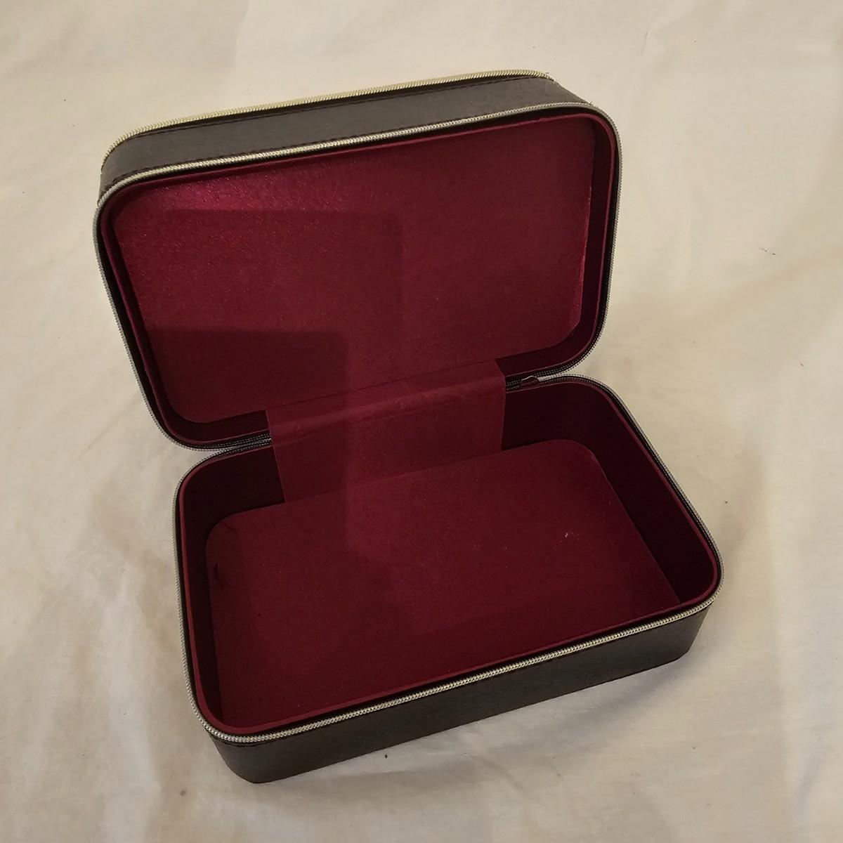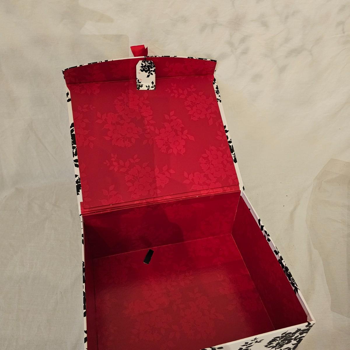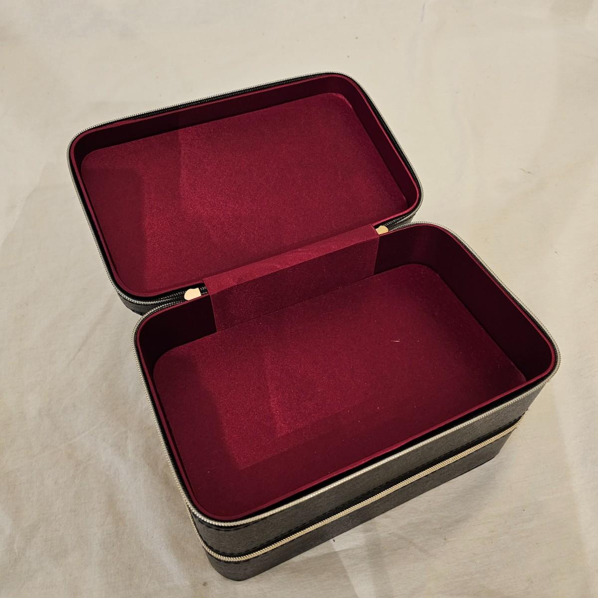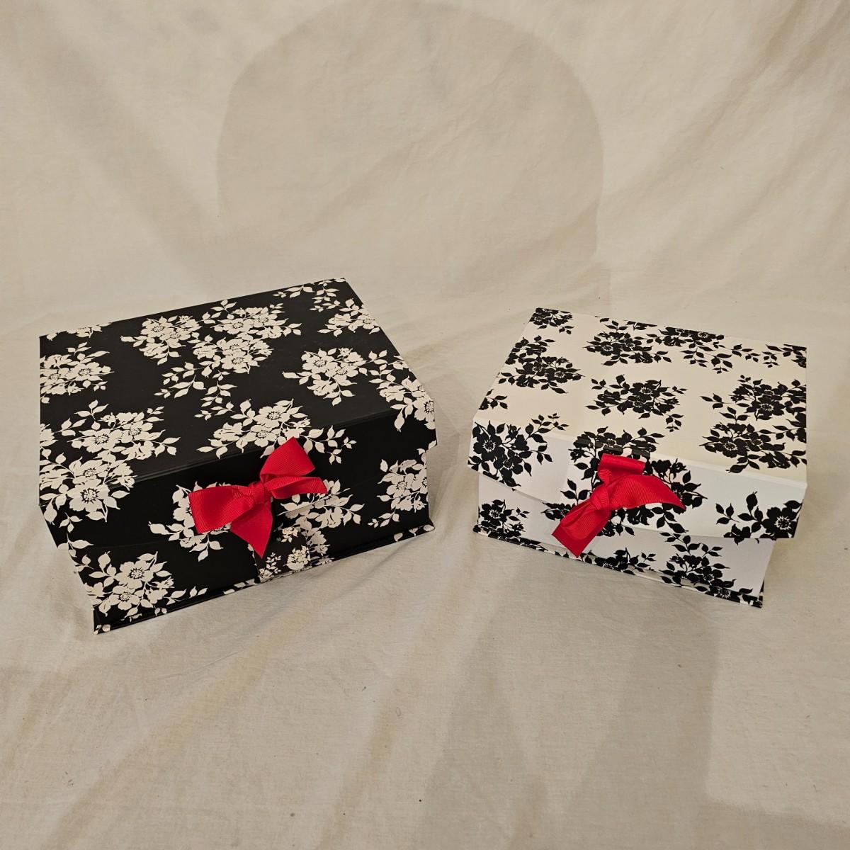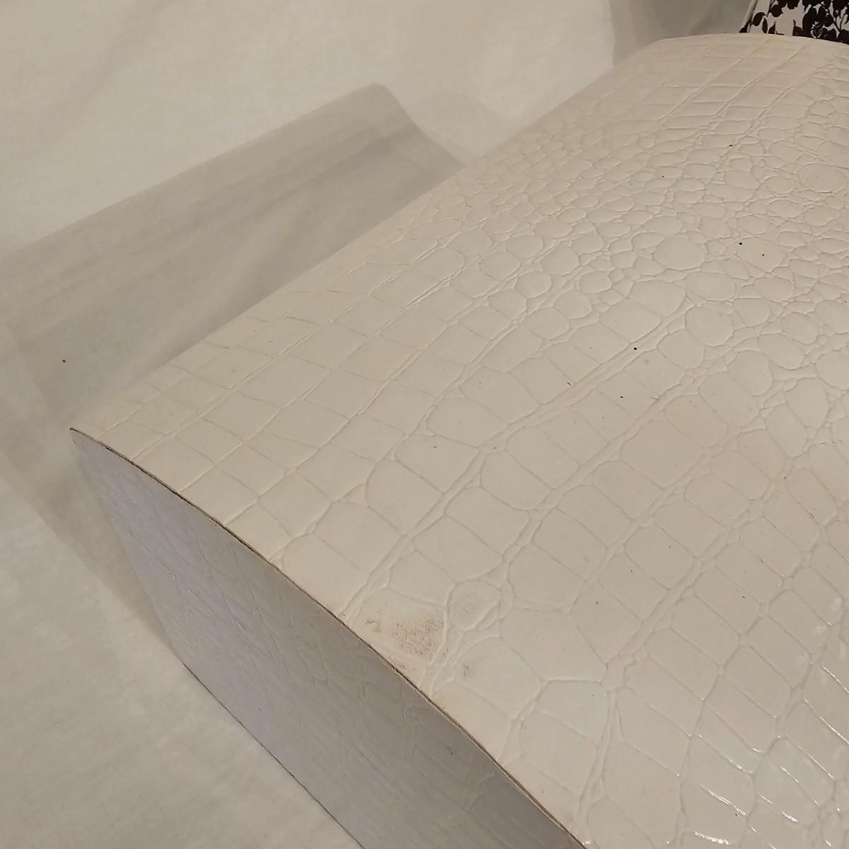 A white domed box with snap closure, 9.5" x 12" x 8"H. Three black & white nesting boxes with velcro snap closures, largest 12" xc14.5" x 6.5"H. Small Lancome zippered case with two compartments, 6" x 9" x 6"H. See photos for details. Shipping available.