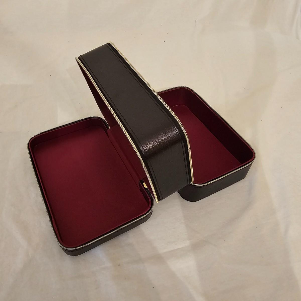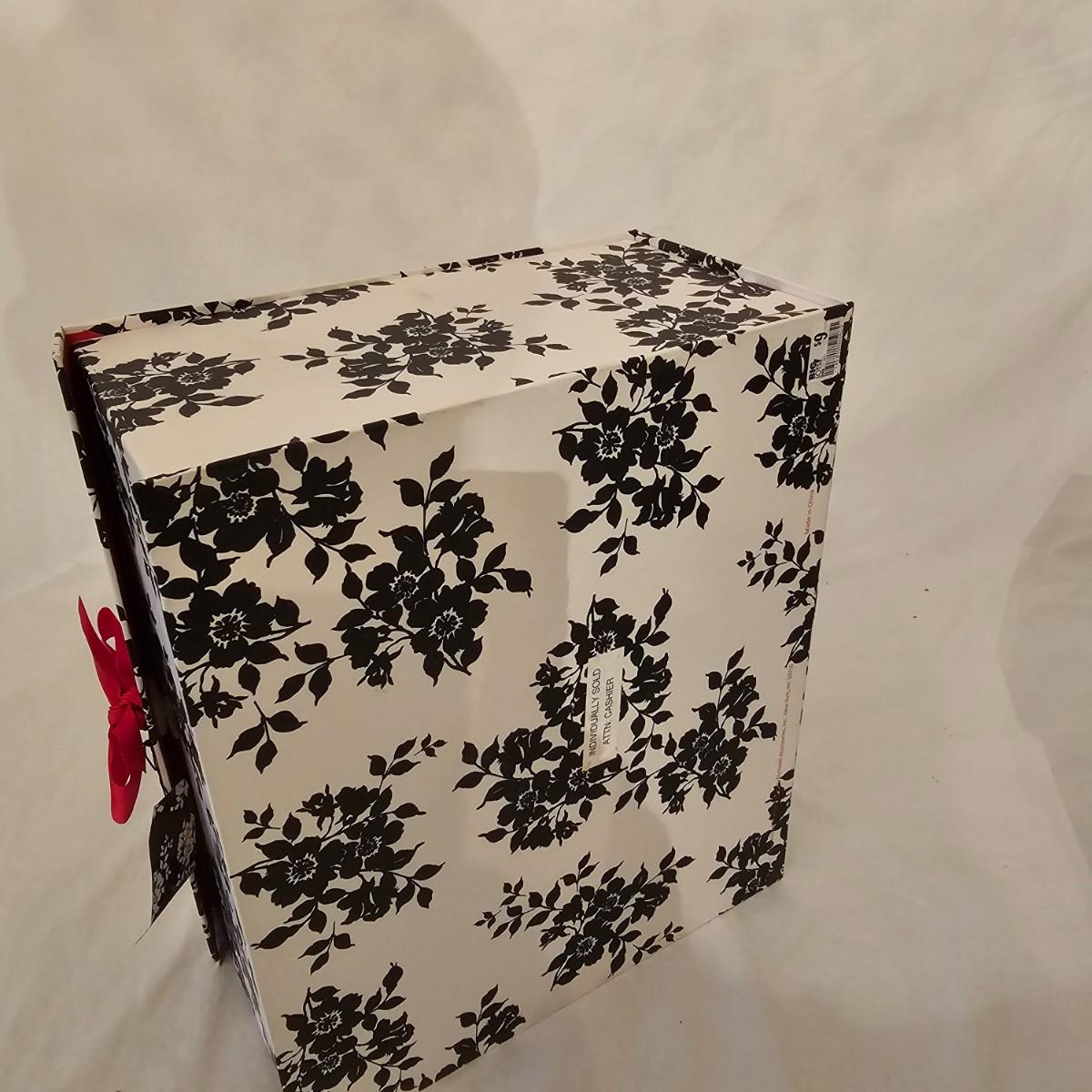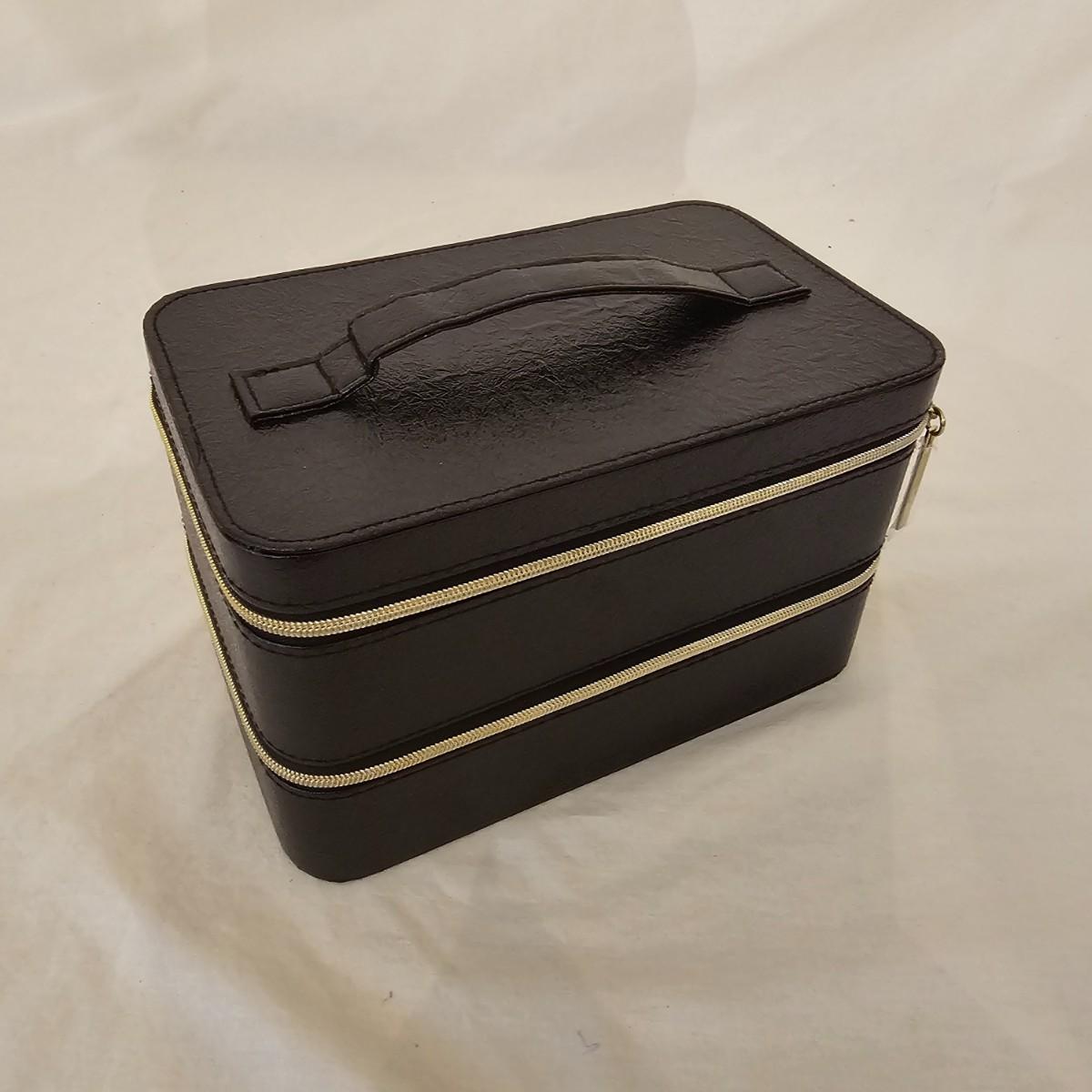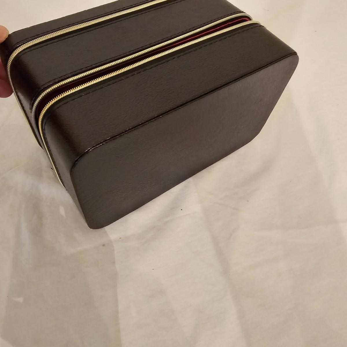 A white domed box with snap closure, 9.5" x 12" x 8"H. Three black & white nesting boxes with velcro snap closures, largest 12" xc14.5" x 6.5"H. Small Lancome zippered case with two compartments, 6" x 9" x 6"H. See photos for details. Shipping available.