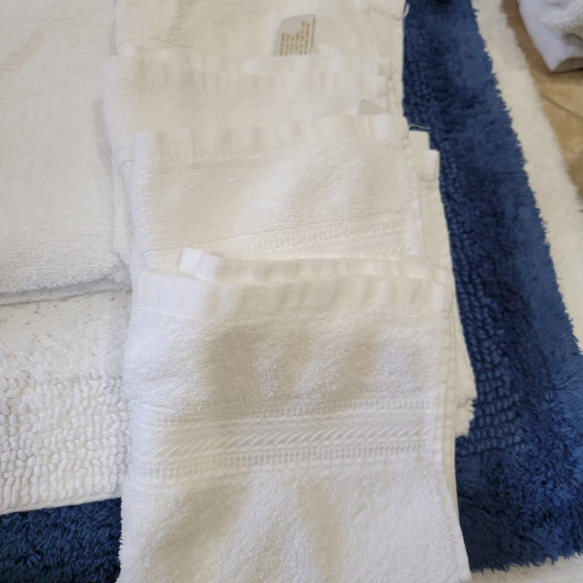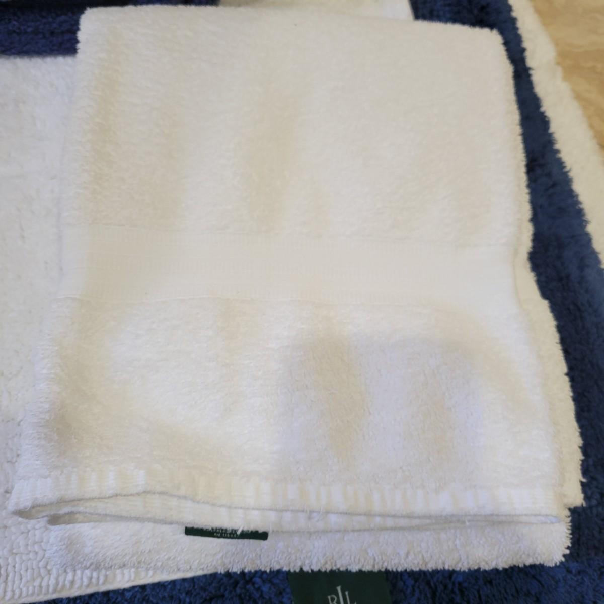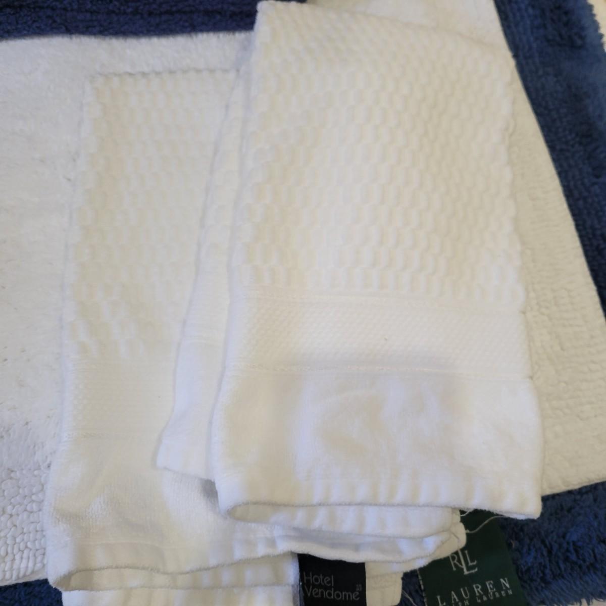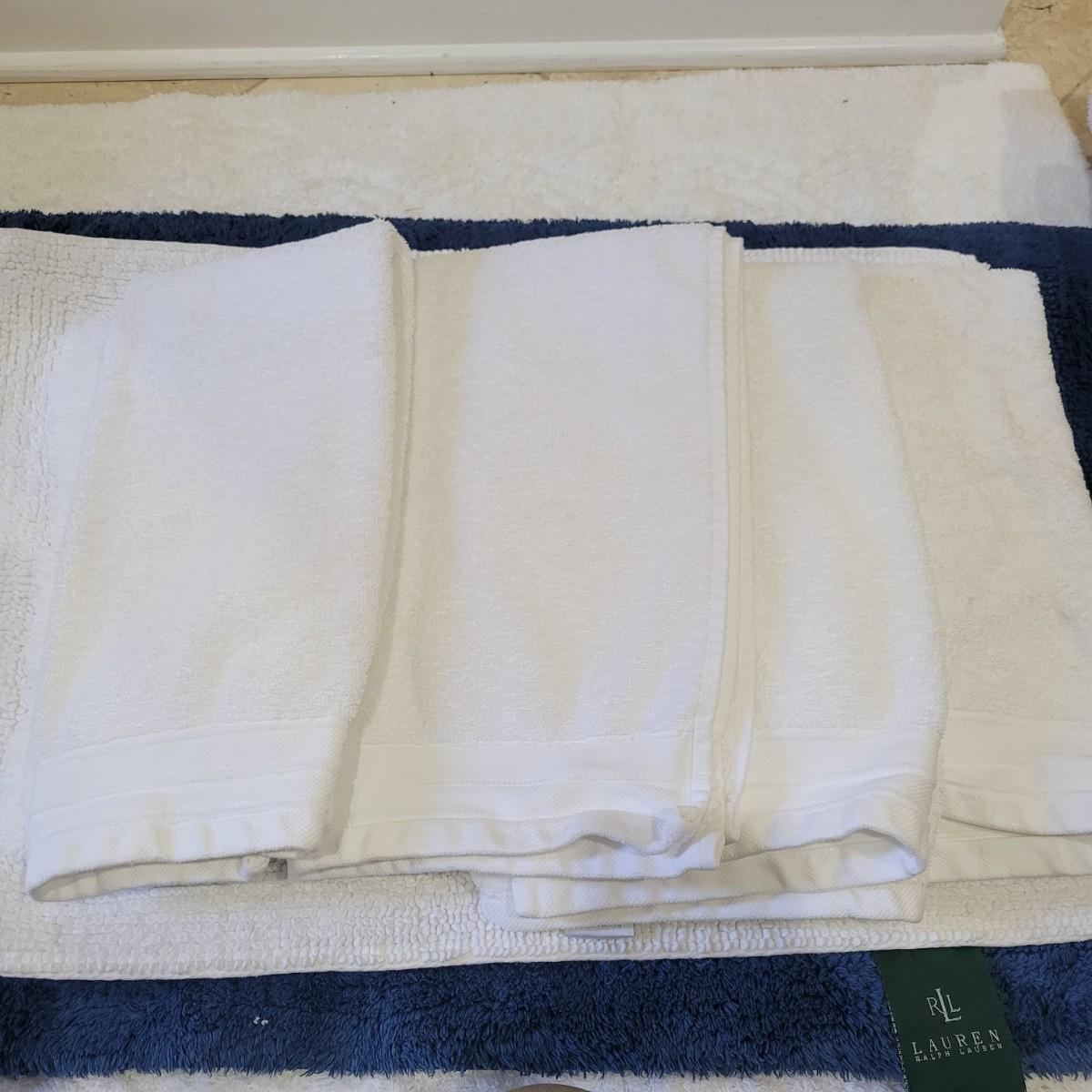 An assortment of cotton bathroom linens that are stain free. Produced by a multitude of manufacturers such as Ralph Lauren,