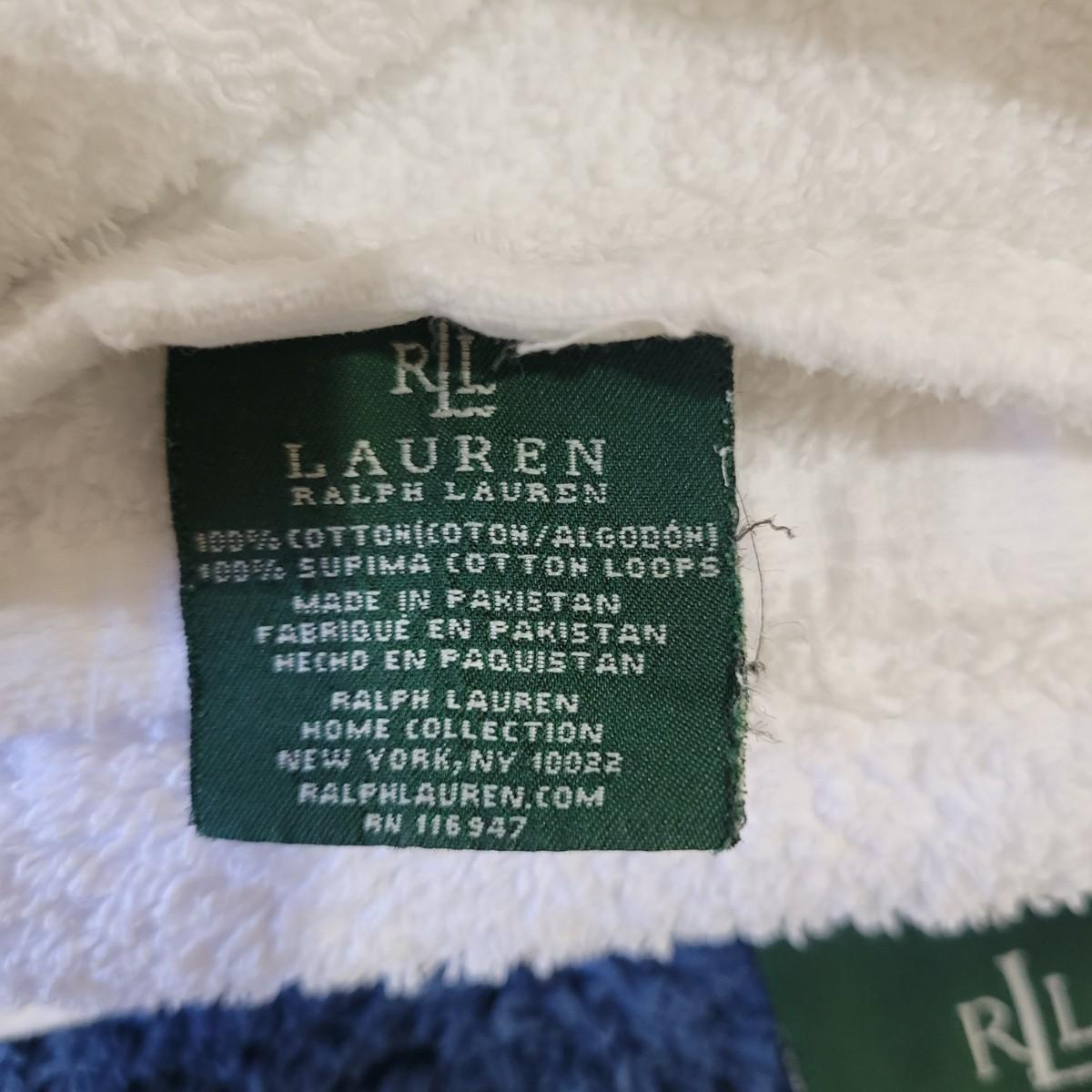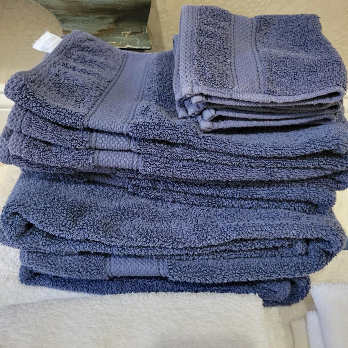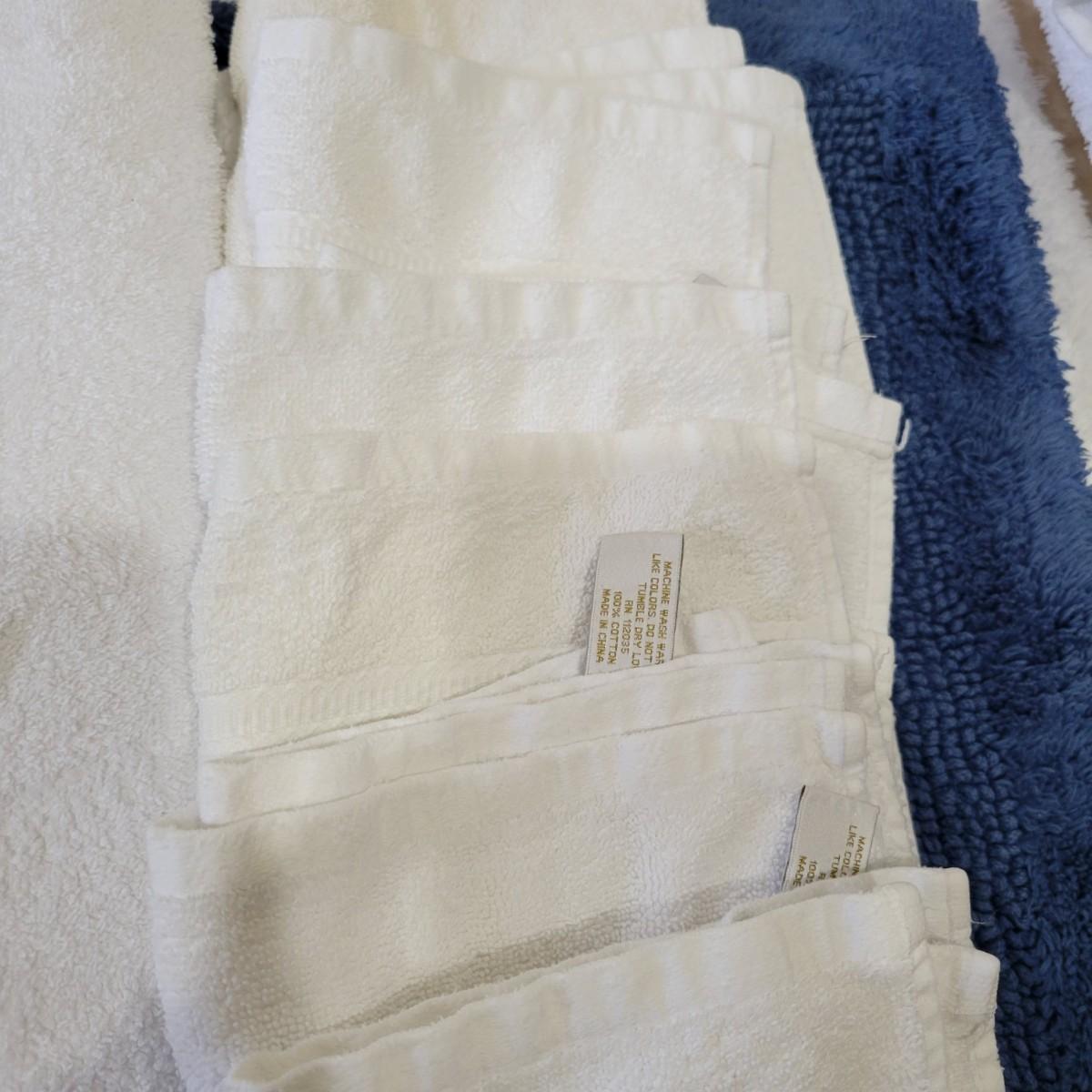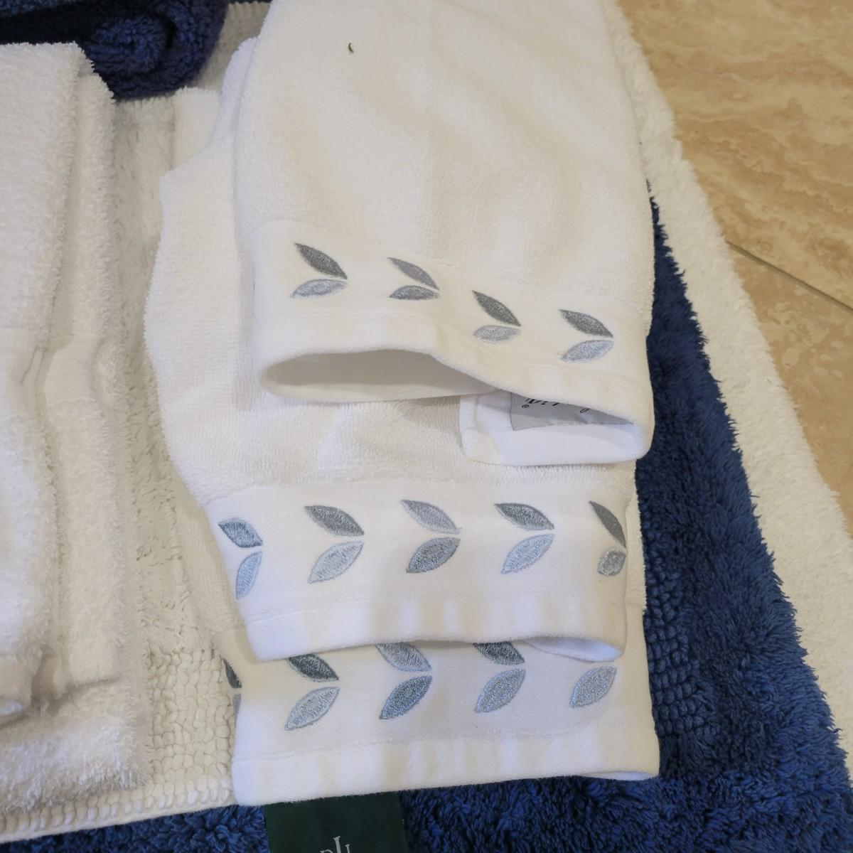 An assortment of cotton bathroom linens that are stain free. Produced by a multitude of manufacturers such as Ralph Lauren,