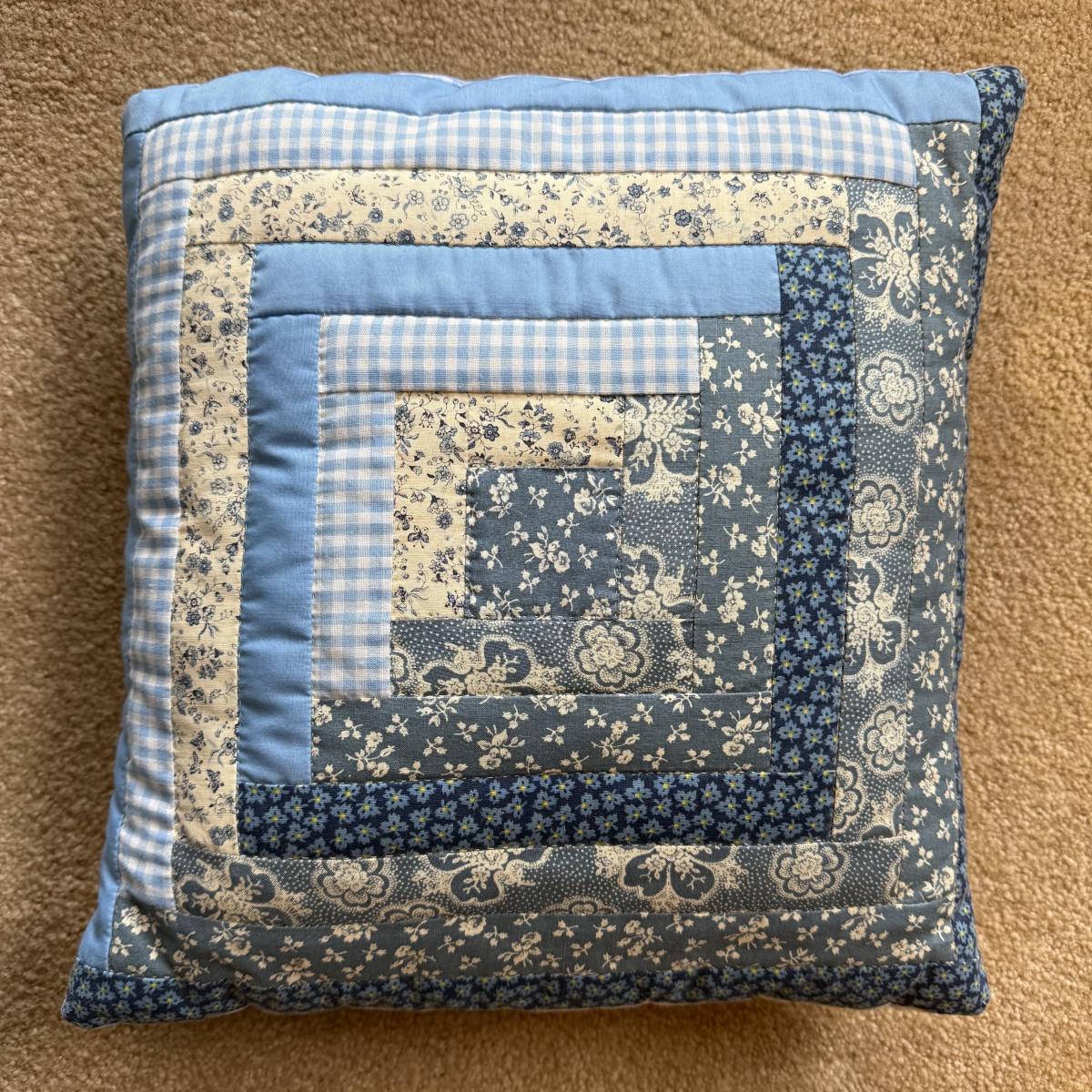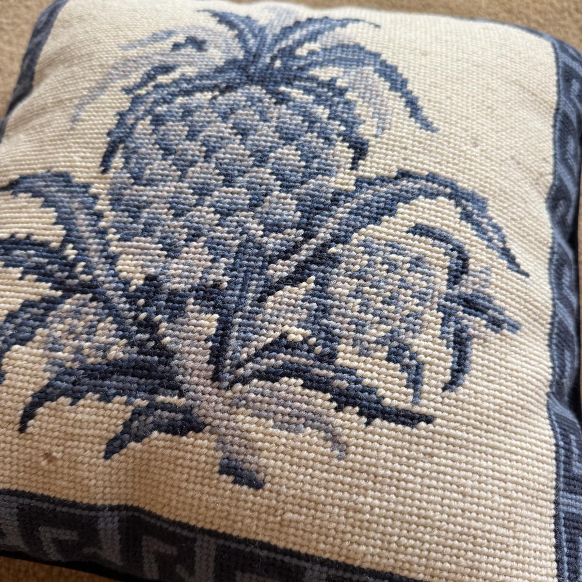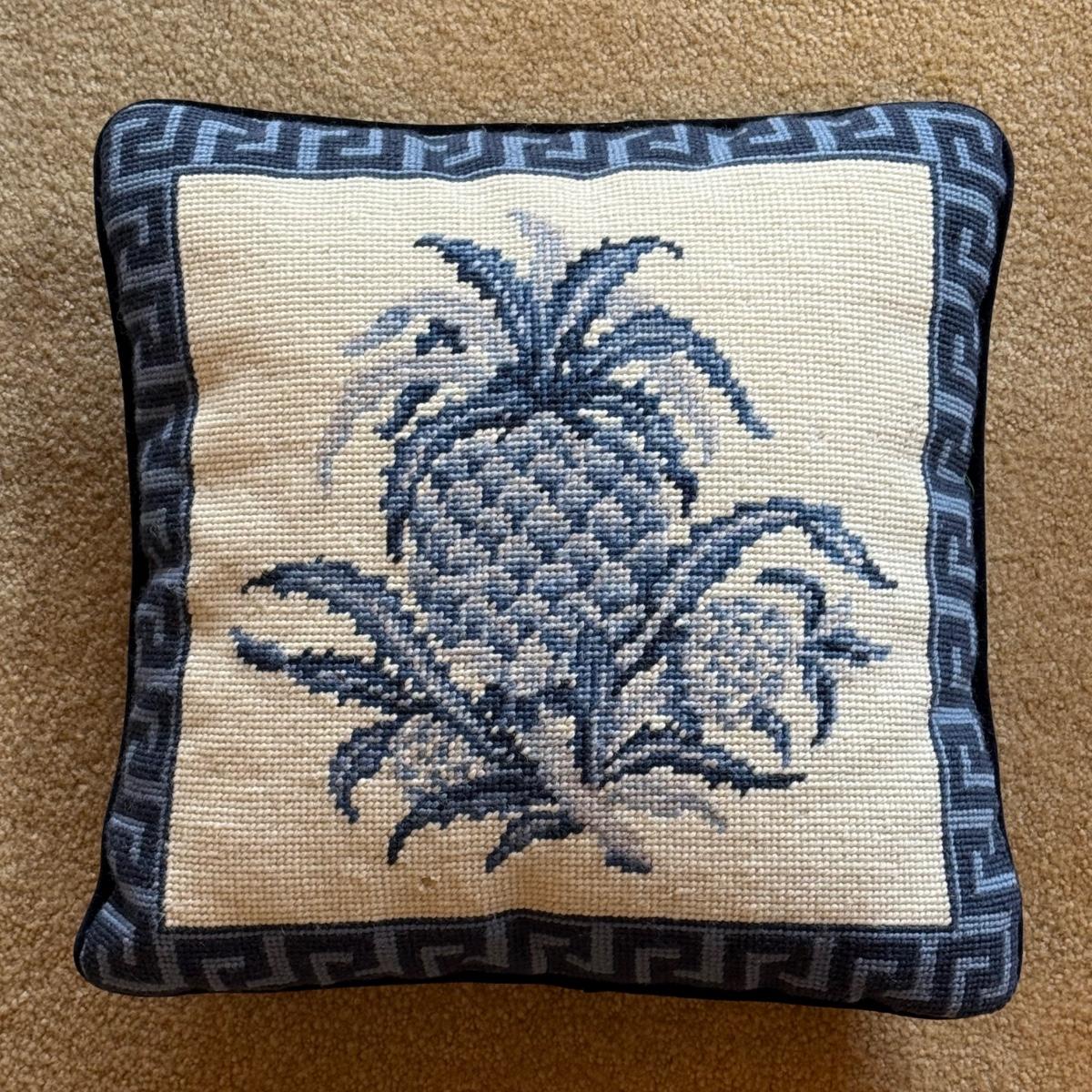 Largest pillow is the blue/white toile pillow which measures 18” square.