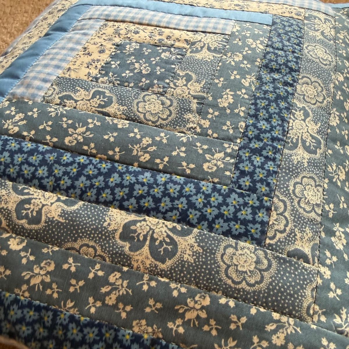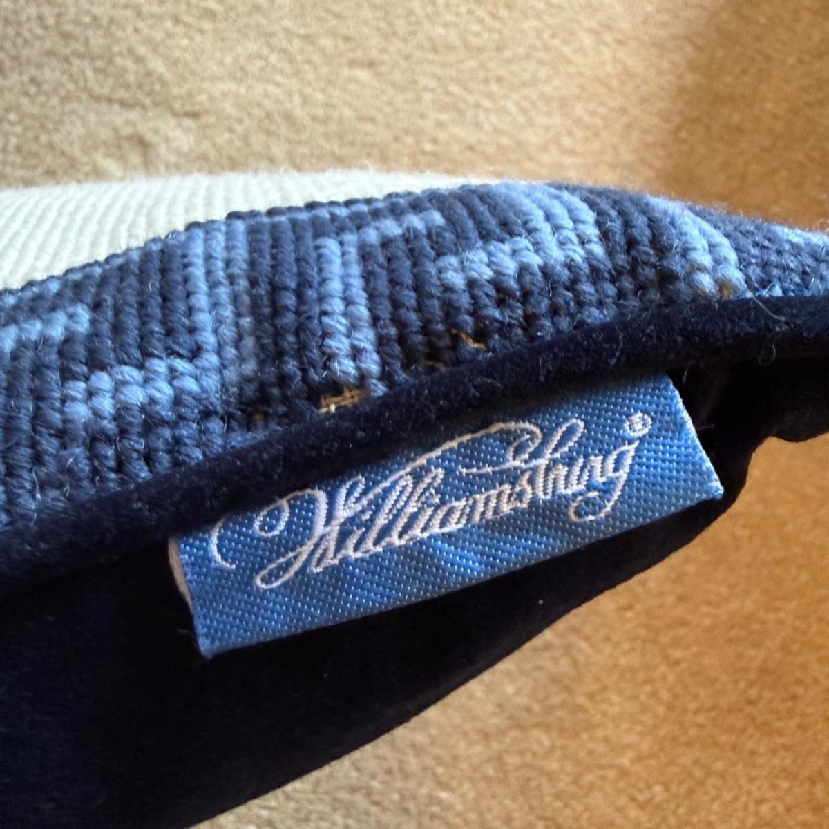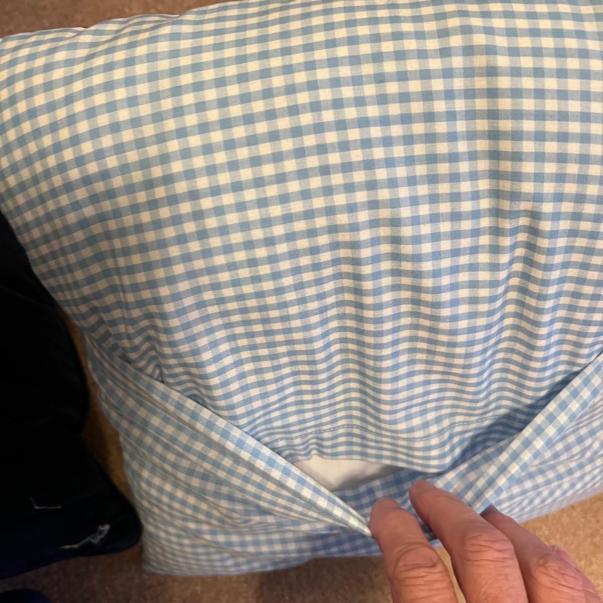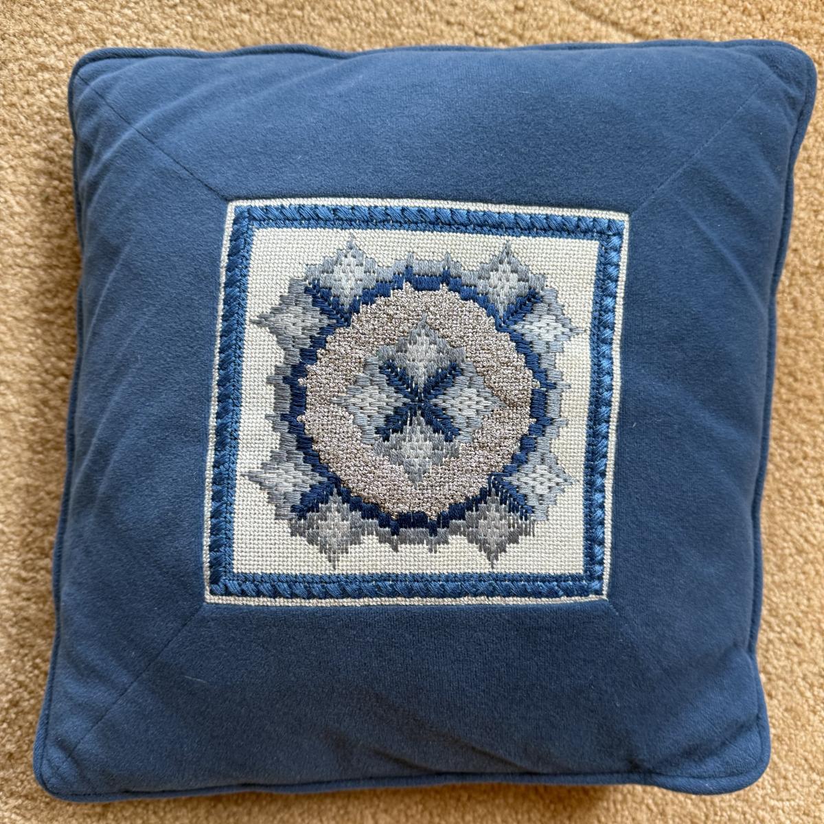 Largest pillow is the blue/white toile pillow which measures 18” square.