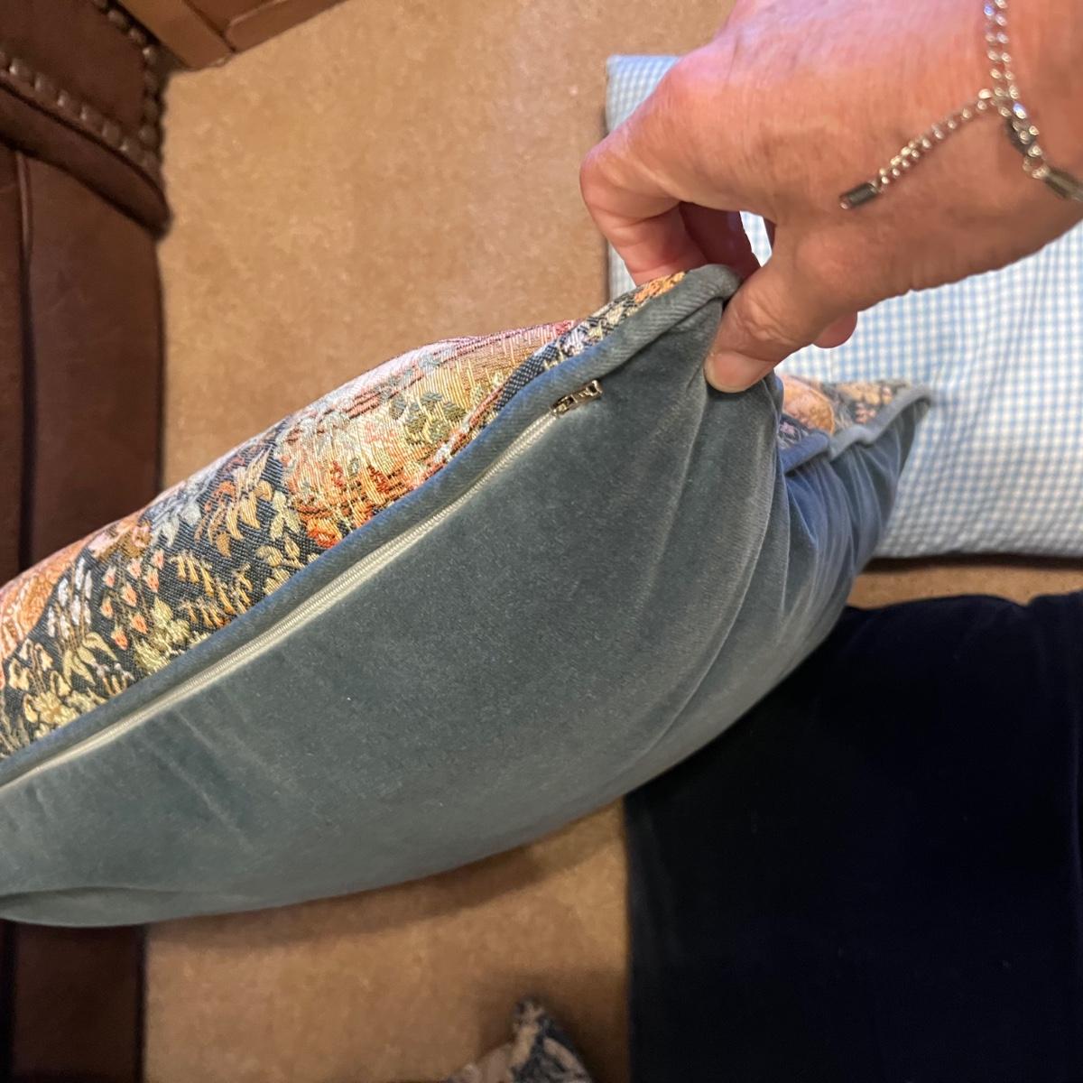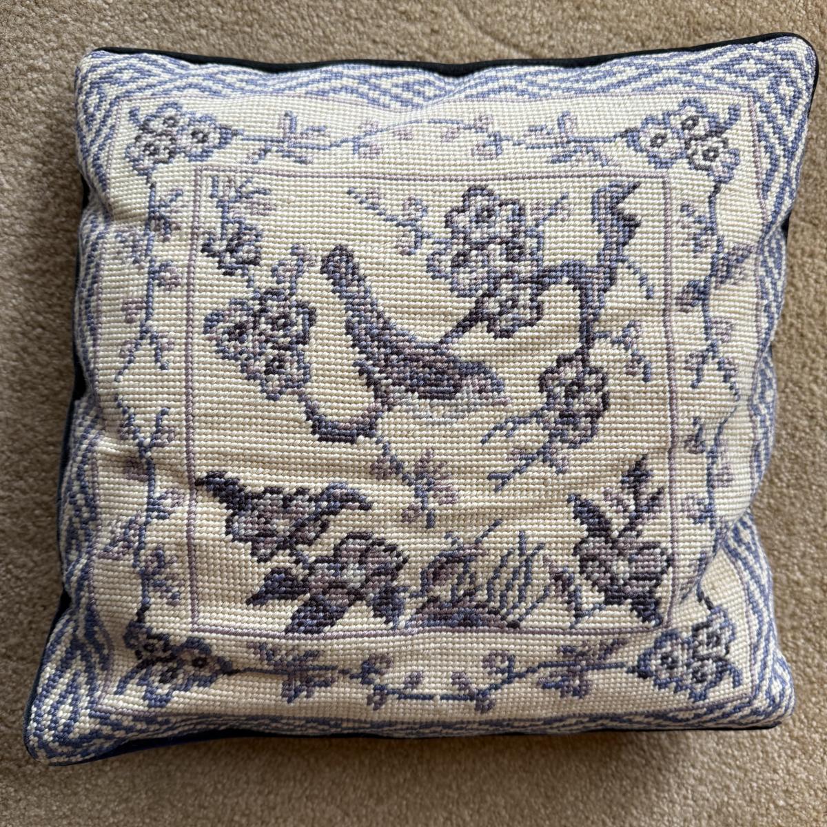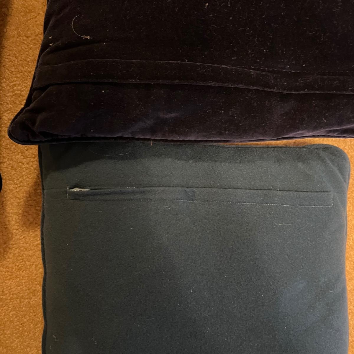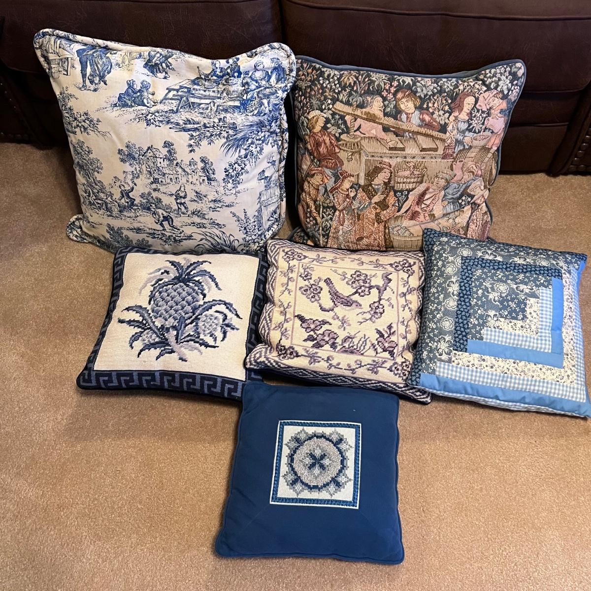 Lovely assortment of six accent pillows includes cross stitch and quilt pillows. All but the largest pillow have removable covers. Four have velvet.