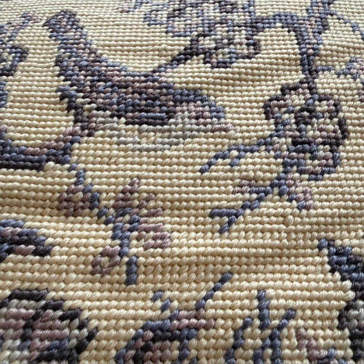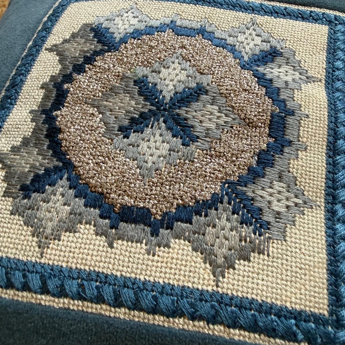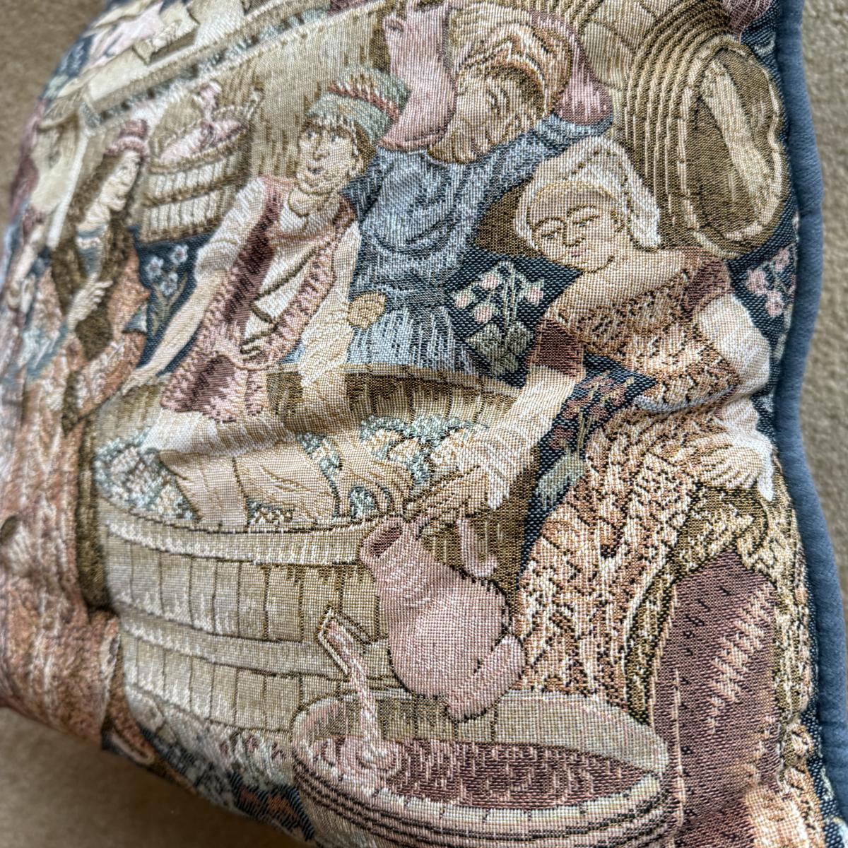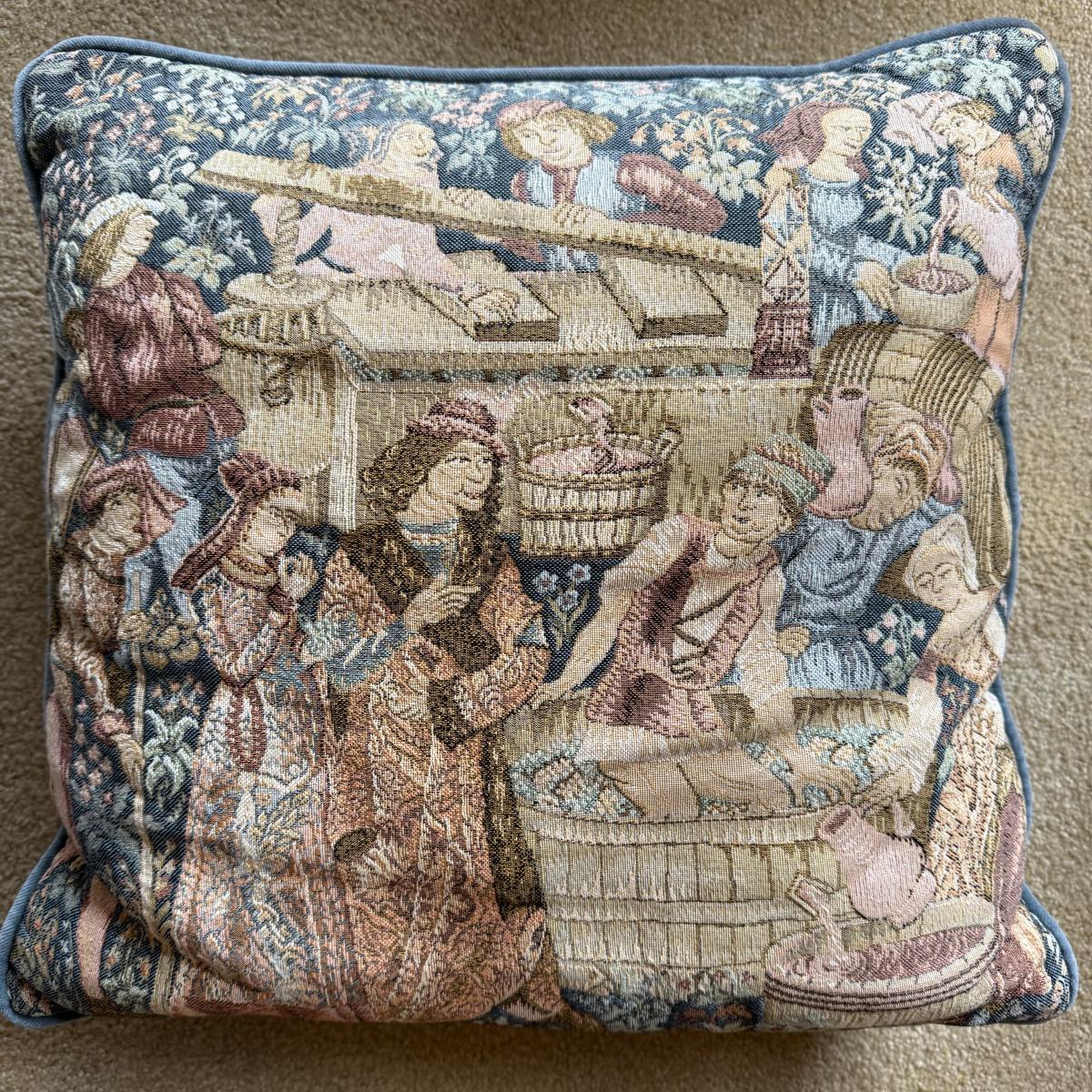 Lovely assortment of six accent pillows includes cross stitch and quilt pillows. All but the largest pillow have removable covers. Four have velvet.