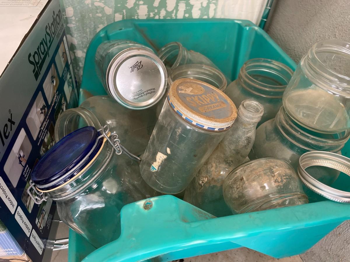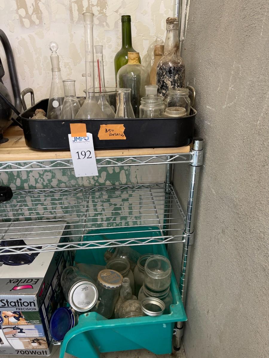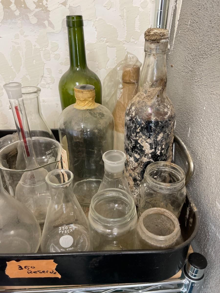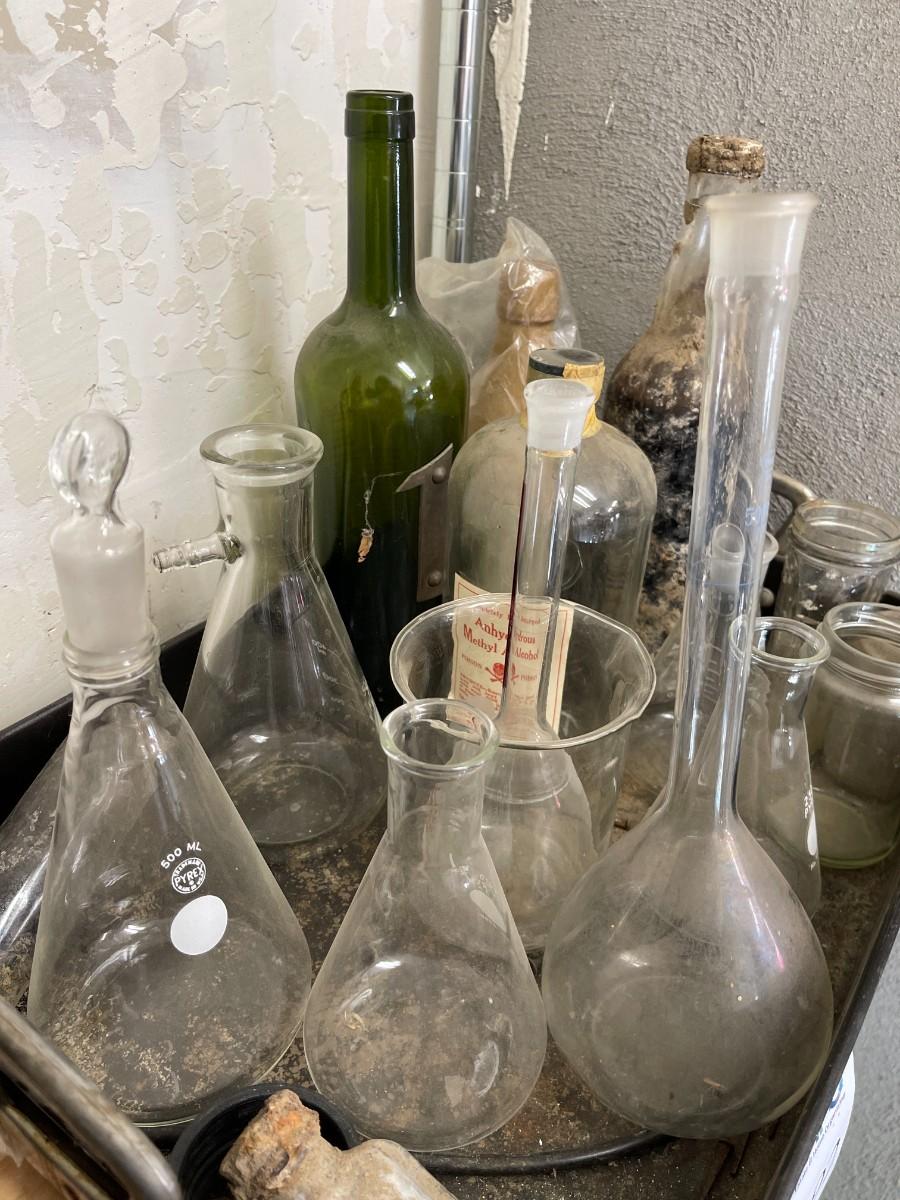 2 Containers (1 Bin and 1 Roasting Pan) of vintage chemistry set Glass Bottles, Beakers and Jars