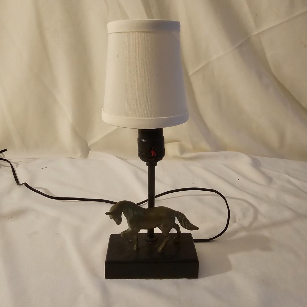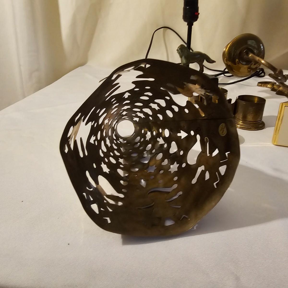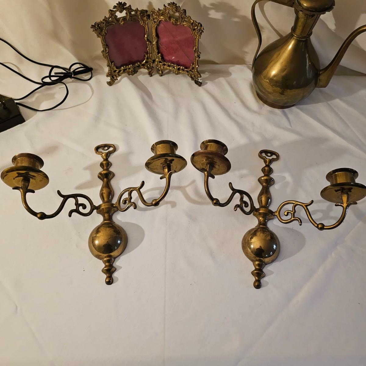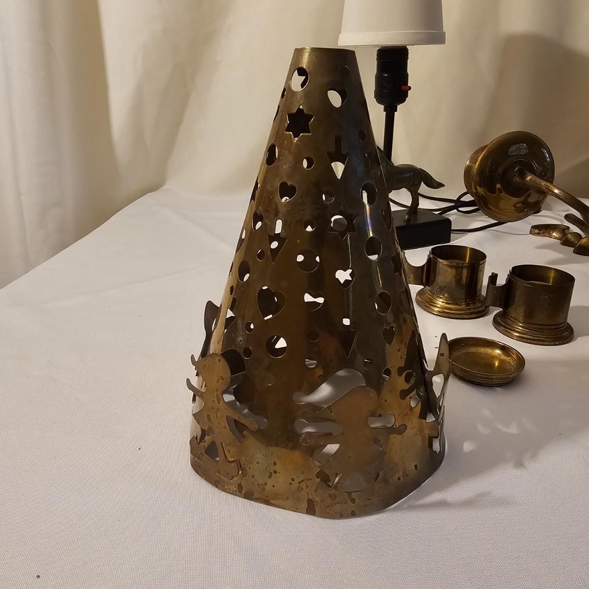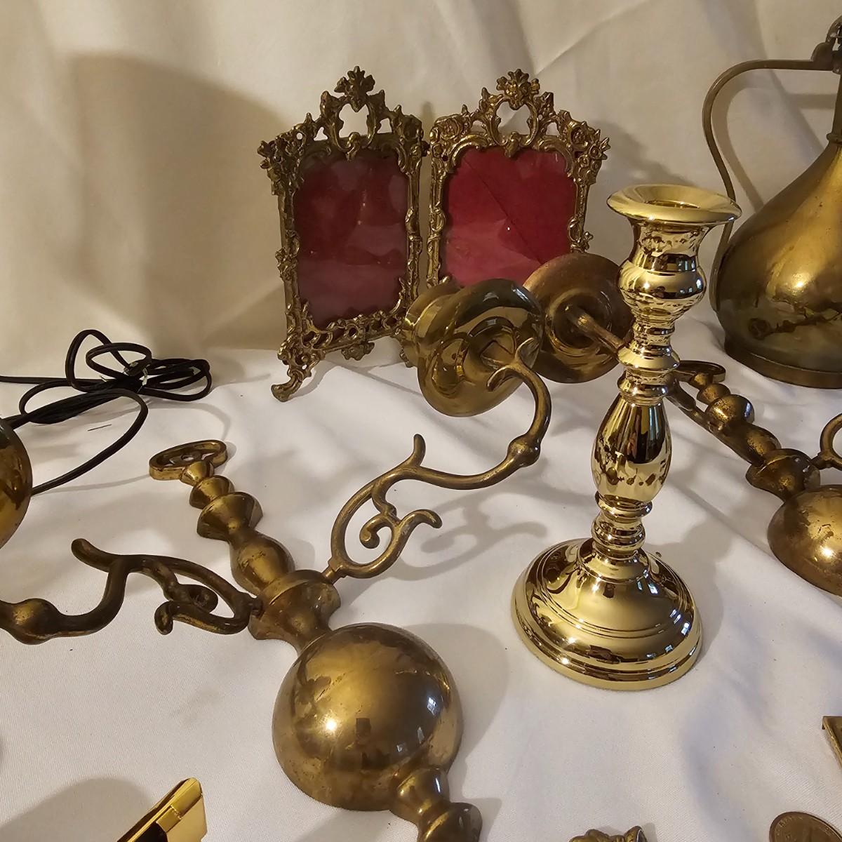 Several different brass items including candleholders, a lamp, double photo frame and more. The pitcher measures 6" x 11" x 13"H. The matching sconce candle holders are 13" x 5" x 12"H. The lamp with horse base is 2.5" x 5" x 12"H, powered on when plugged in. The pierced cone is 5"D x 7"H. Some tarnish on items, and one side of photo frame glass is broken. See photos for details. Shipping available.