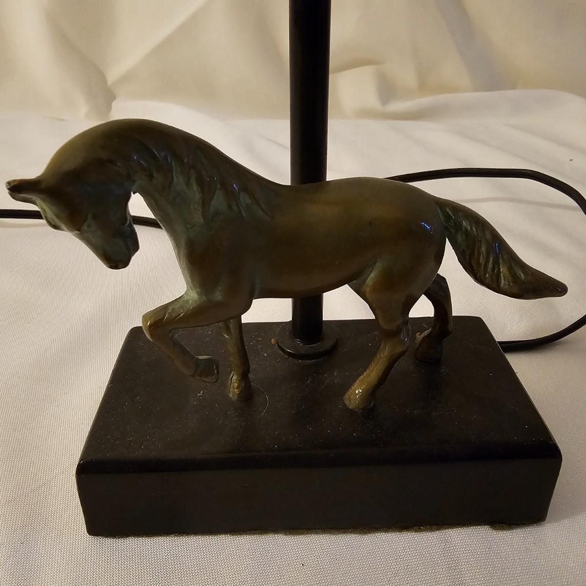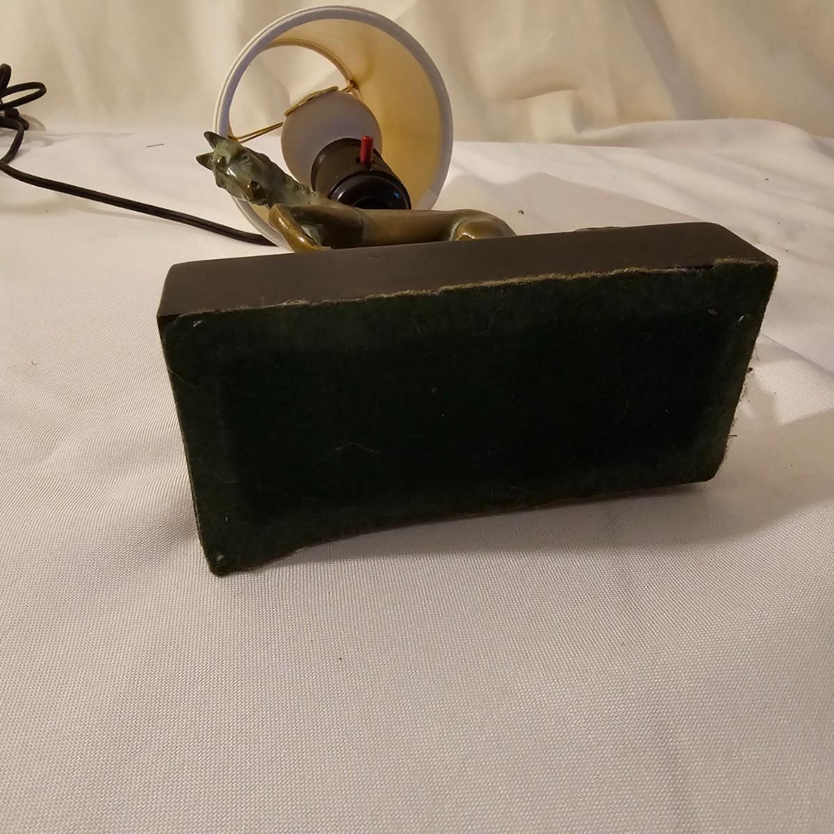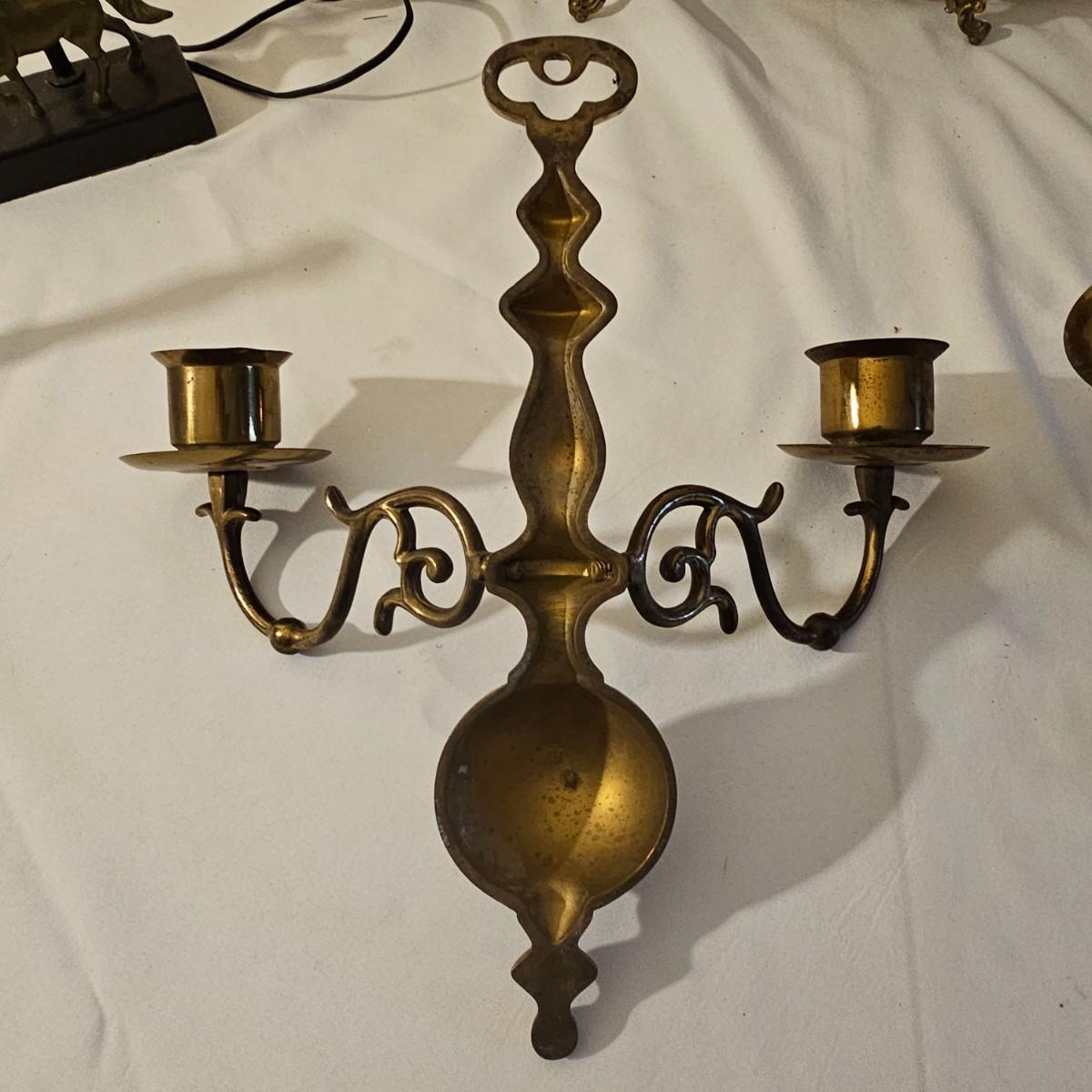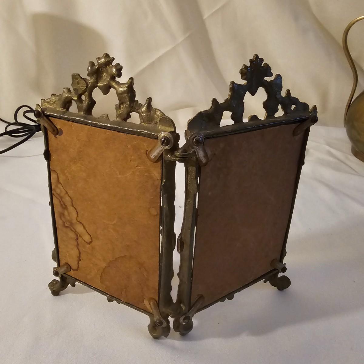 Several different brass items including candleholders, a lamp, double photo frame and more. The pitcher measures 6" x 11" x 13"H. The matching sconce candle holders are 13" x 5" x 12"H. The lamp with horse base is 2.5" x 5" x 12"H, powered on when plugged in. The pierced cone is 5"D x 7"H. Some tarnish on items, and one side of photo frame glass is broken. See photos for details. Shipping available.