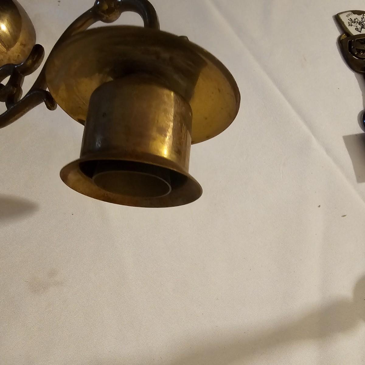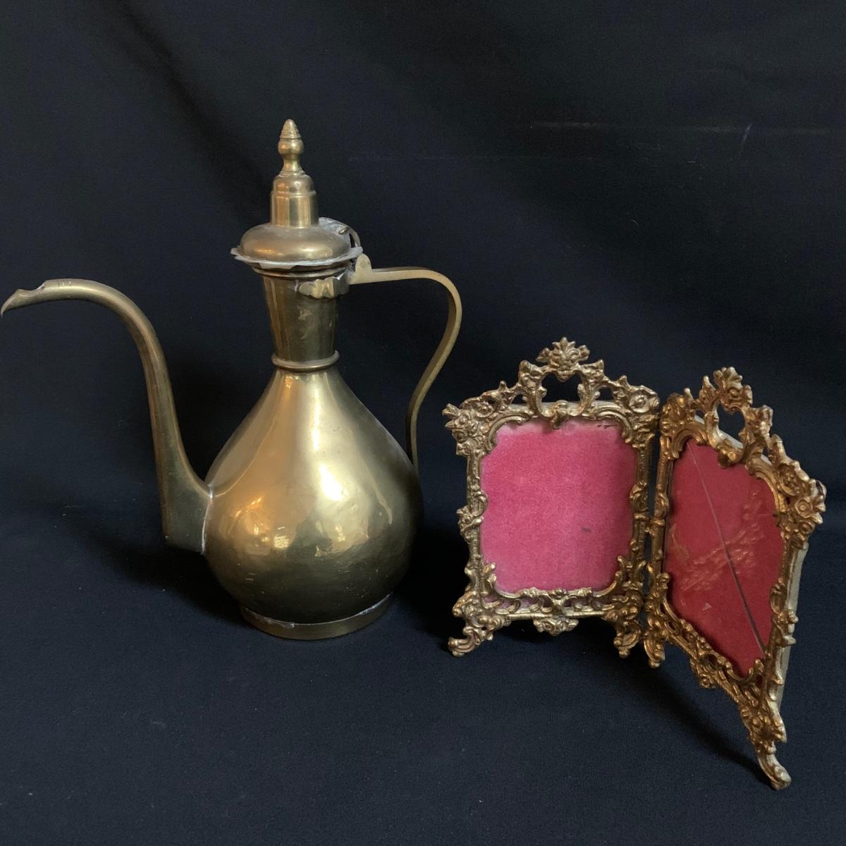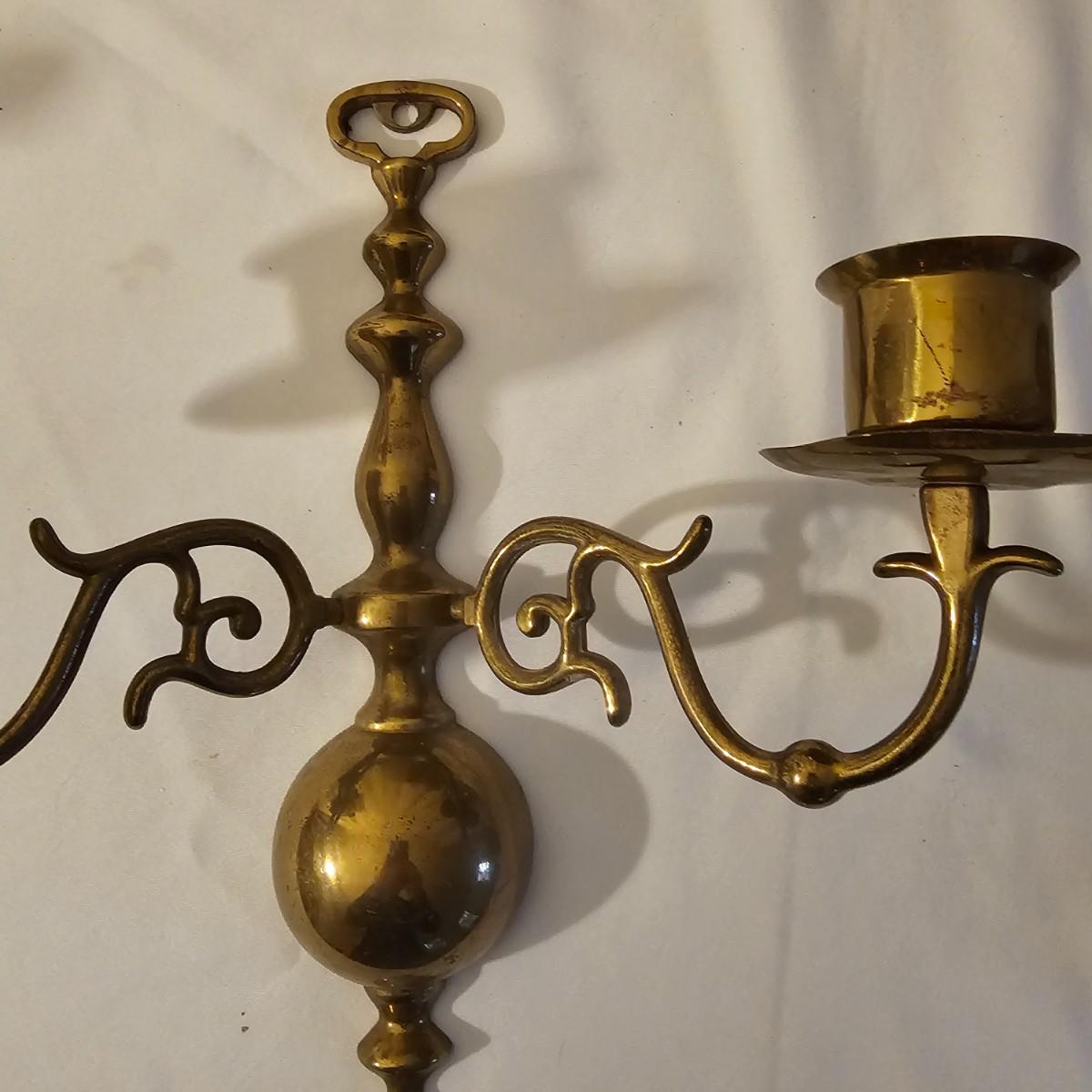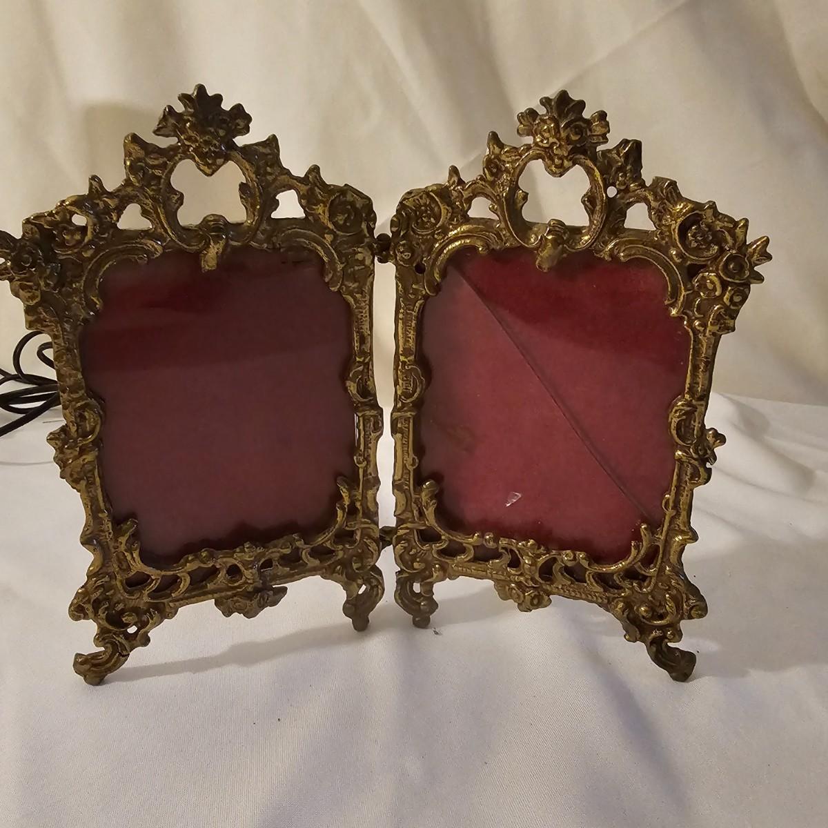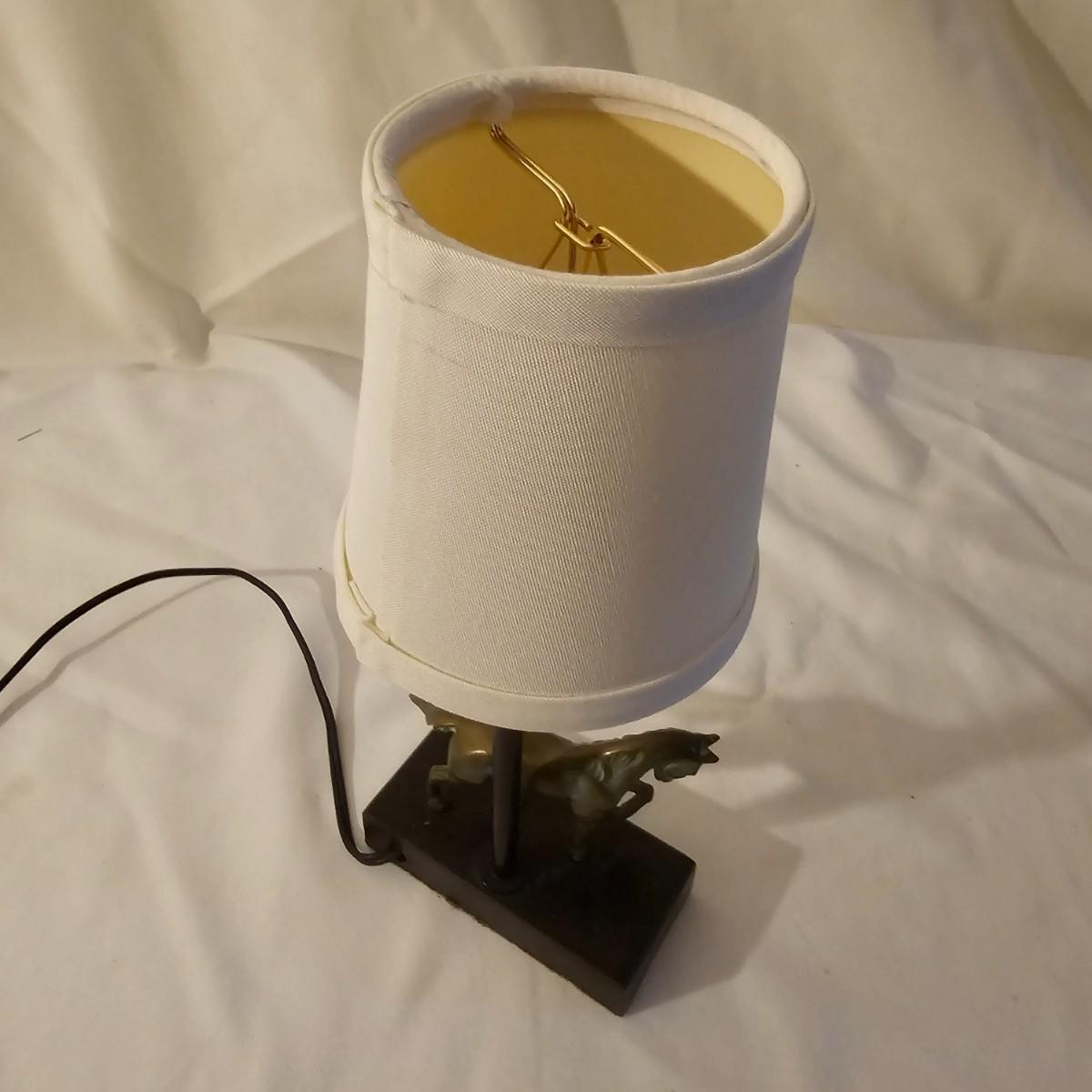 Several different brass items including candleholders, a lamp, double photo frame and more. The pitcher measures 6" x 11" x 13"H. The matching sconce candle holders are 13" x 5" x 12"H. The lamp with horse base is 2.5" x 5" x 12"H, powered on when plugged in. The pierced cone is 5"D x 7"H. Some tarnish on items, and one side of photo frame glass is broken. See photos for details. Shipping available.