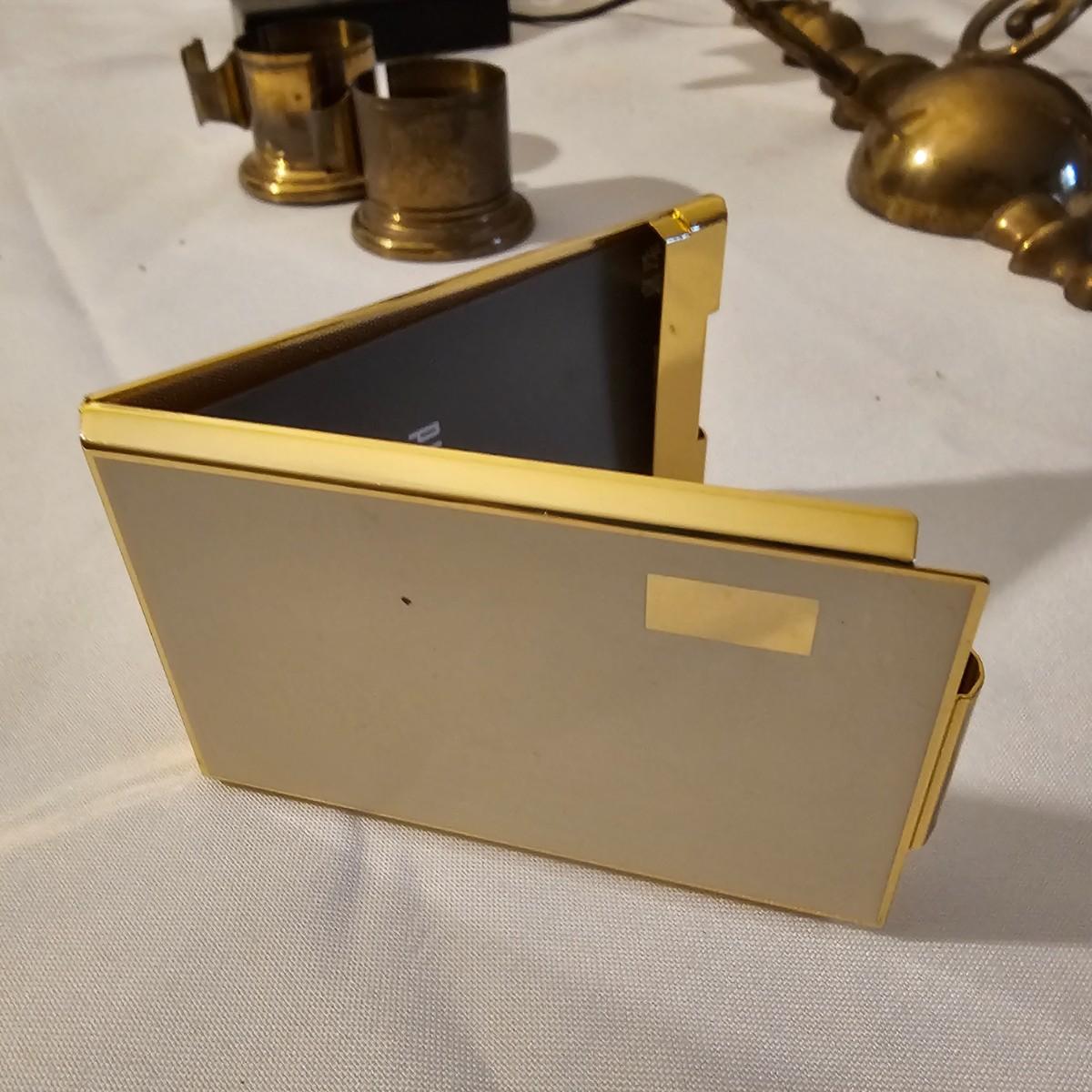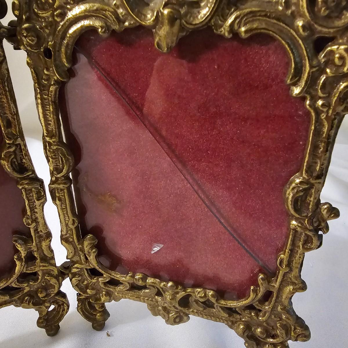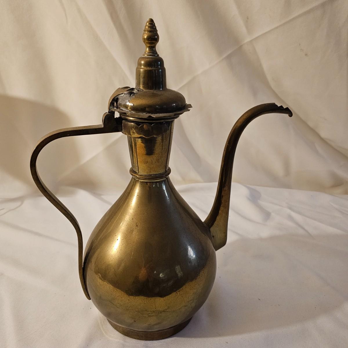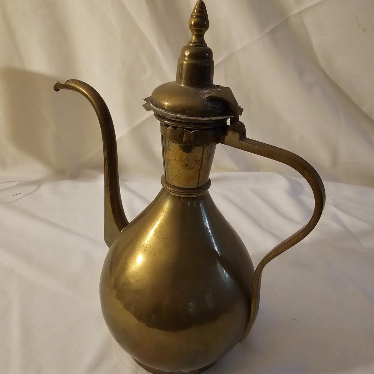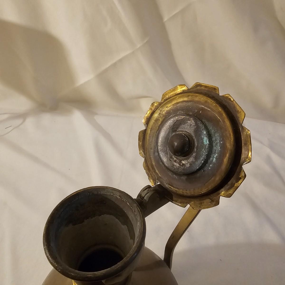 Several different brass items including candleholders, a lamp, double photo frame and more. The pitcher measures 6" x 11" x 13"H. The matching sconce candle holders are 13" x 5" x 12"H. The lamp with horse base is 2.5" x 5" x 12"H, powered on when plugged in. The pierced cone is 5"D x 7"H. Some tarnish on items, and one side of photo frame glass is broken. See photos for details. Shipping available.