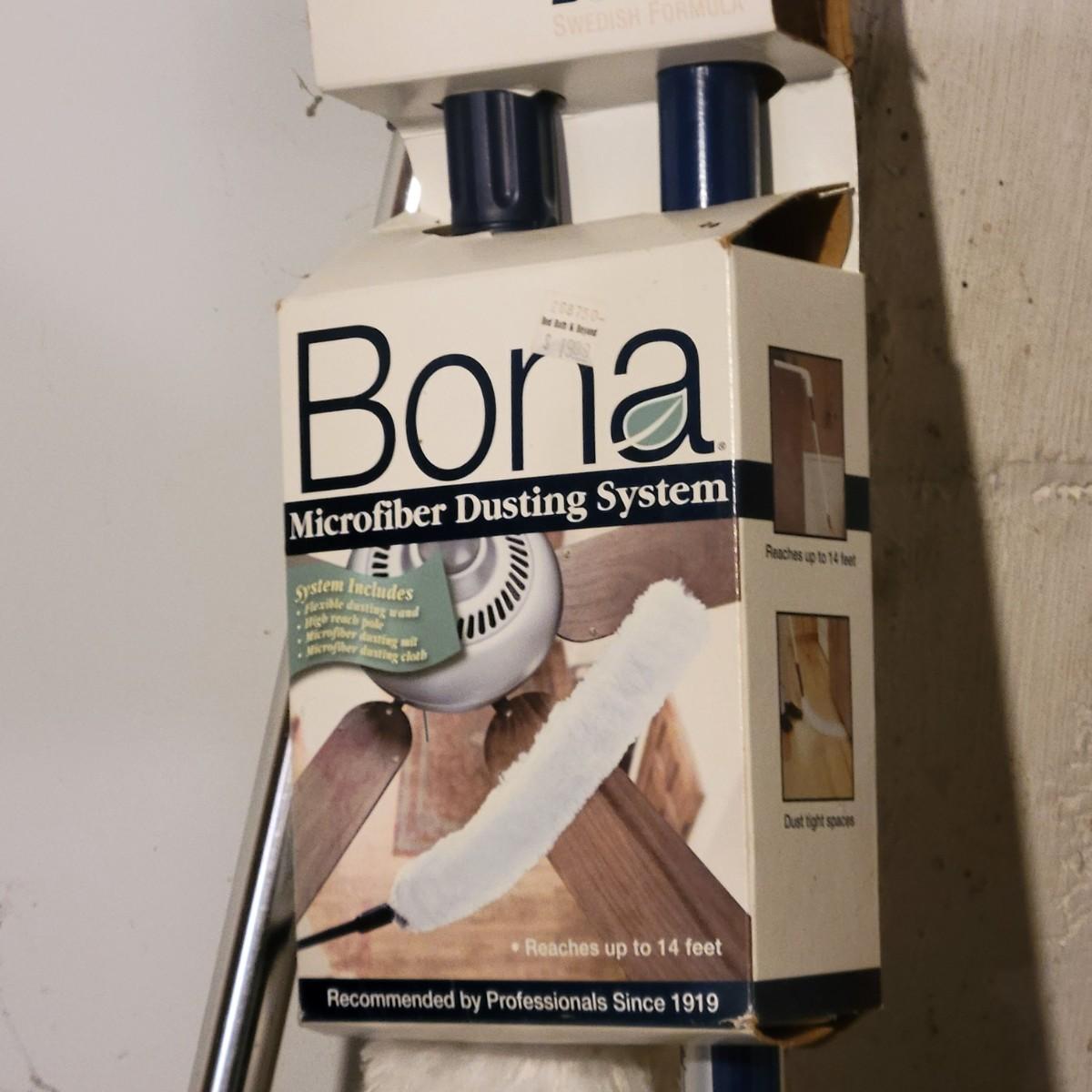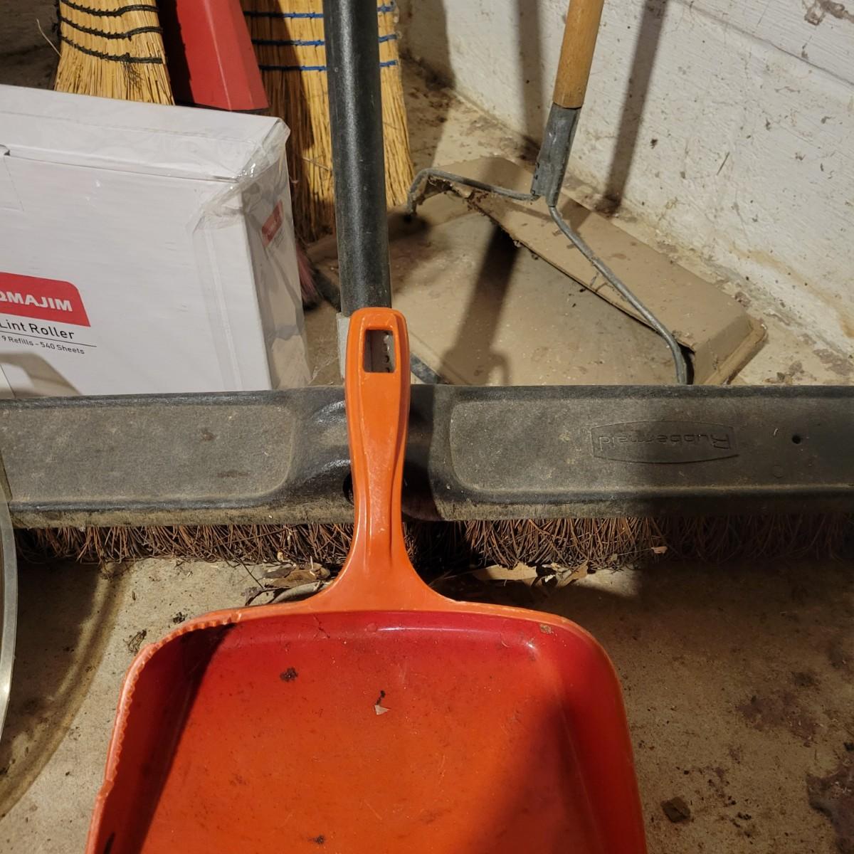 An assortment of brooms, dusters, dust pans, and more in good condition. Lot includes straw brooms, a large push broom, a full case of lint rollers, a mini duster, a flexible skinny duster, a Bona microfiber duster and more. Local pickup only