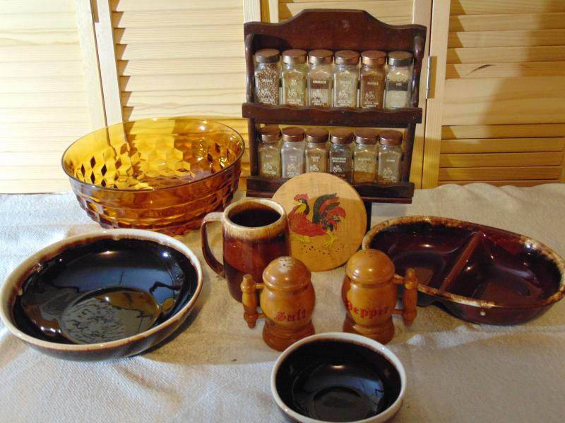 Assortment of brown pottery ,Spice Rack, Amber Glass and more