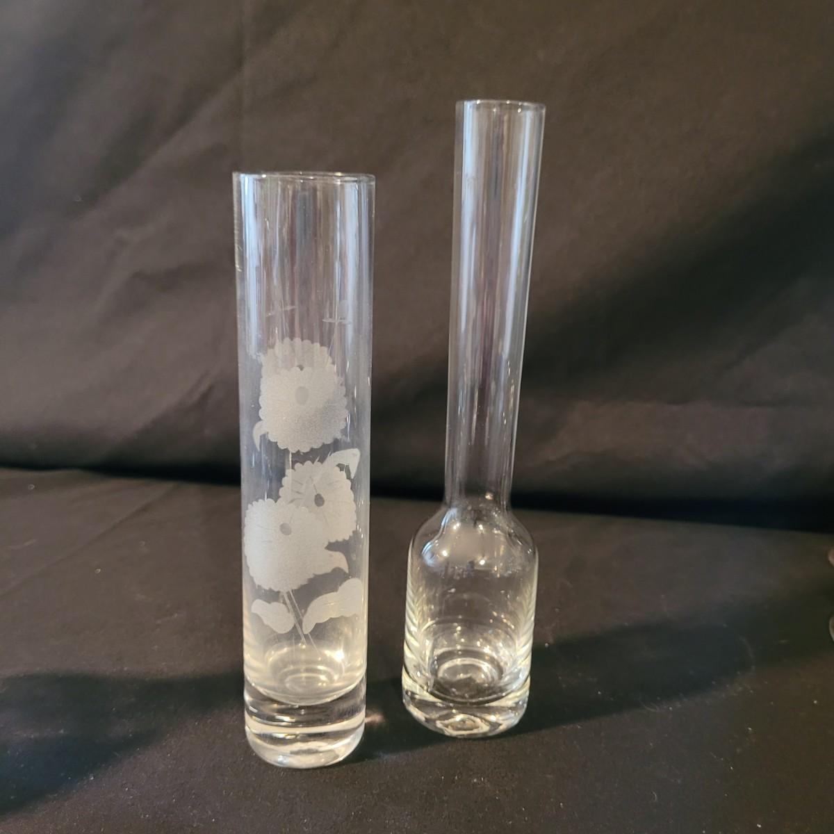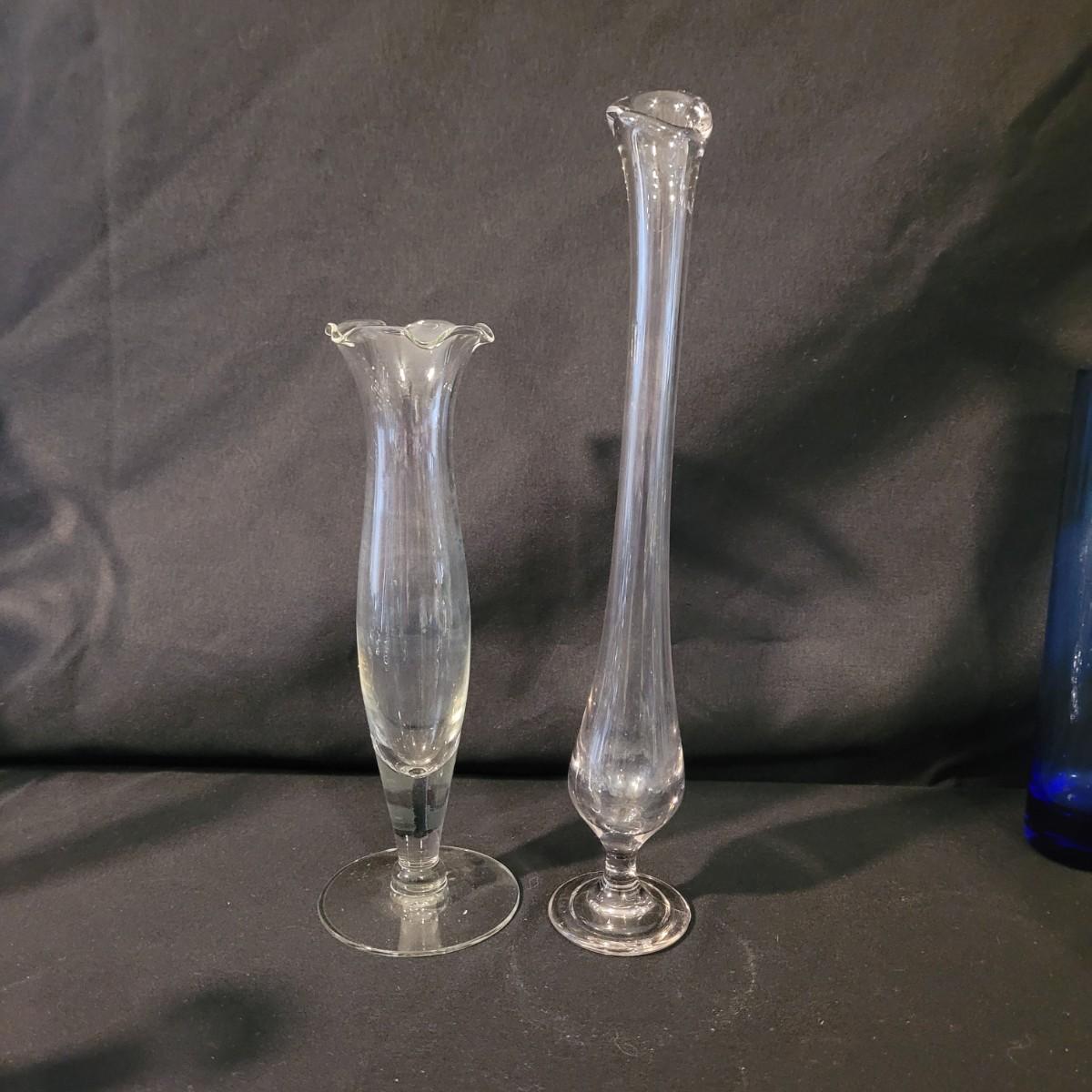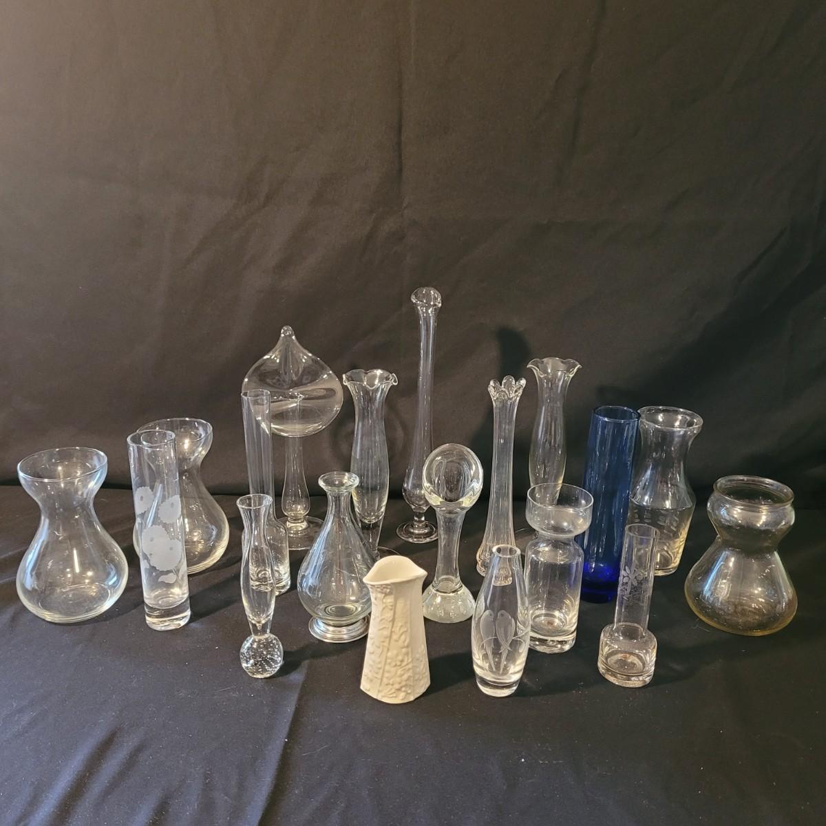This large assortment of nineteen bud and bulb vases includes a lovely variety of uniquely shaped vases for single stems, bulb sprouting, and buds. Bird etched vase is Lenox USA. Tallest vase in center of photo measures approximately 11”H. Shipping available.