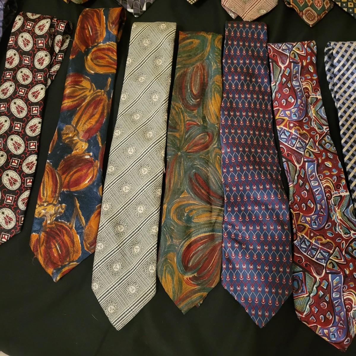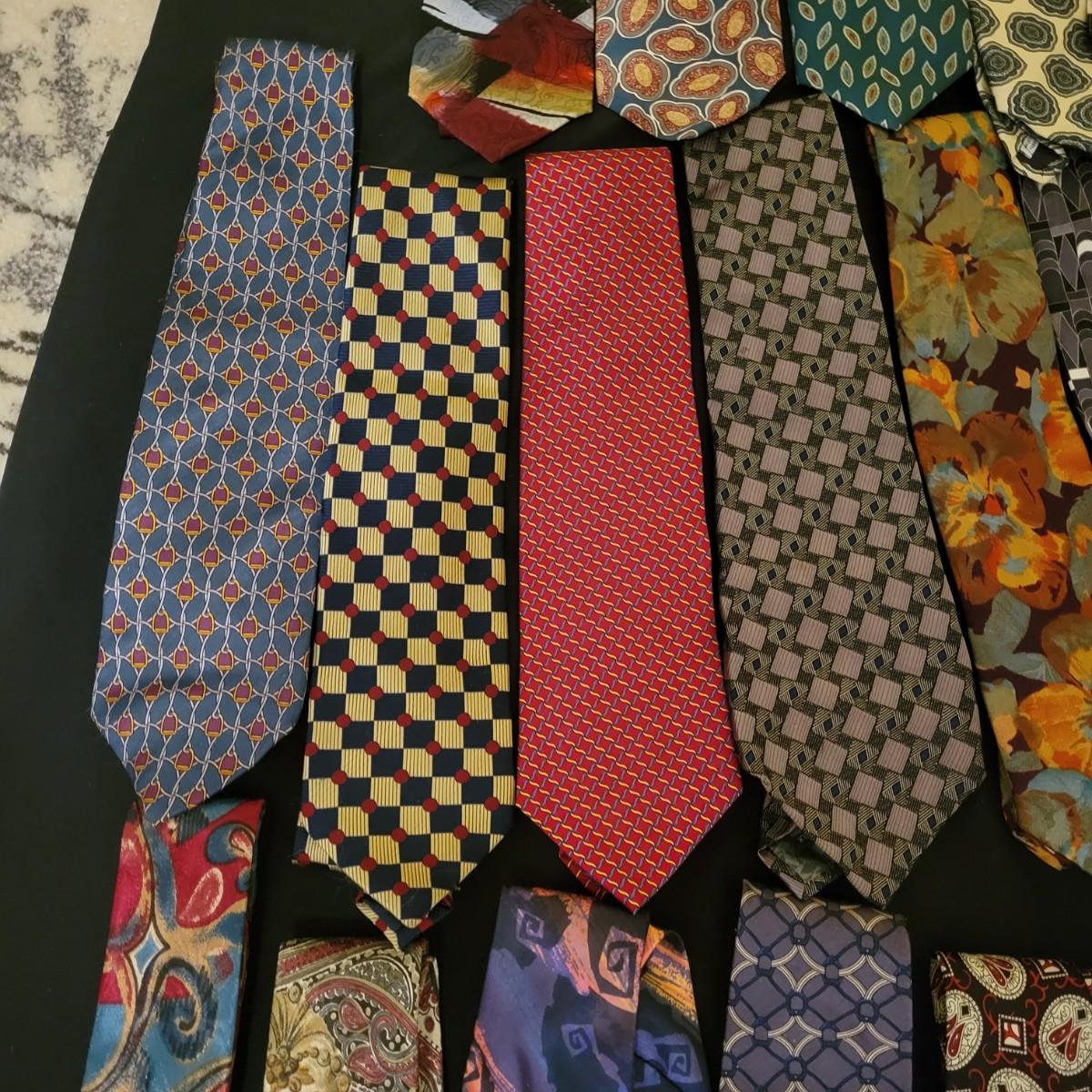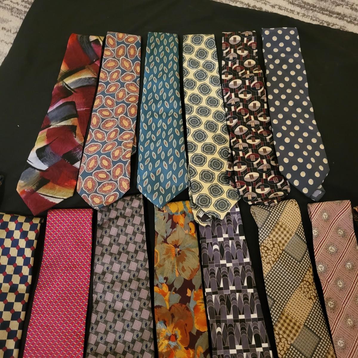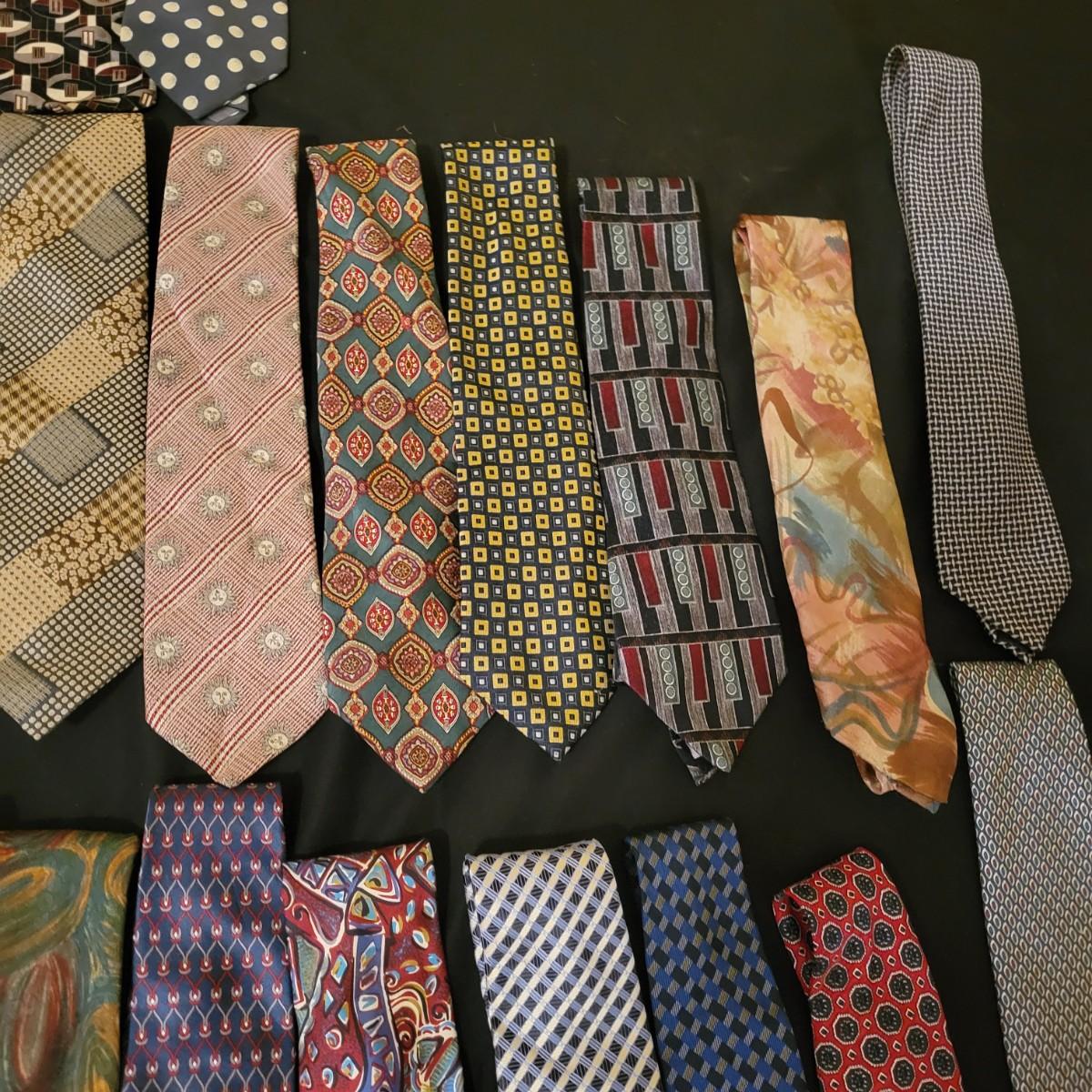 A large assortment of ties in a variety of styles from manufacturers br Conwell, Burberry, BHS, Ruffin, Salvatore and more