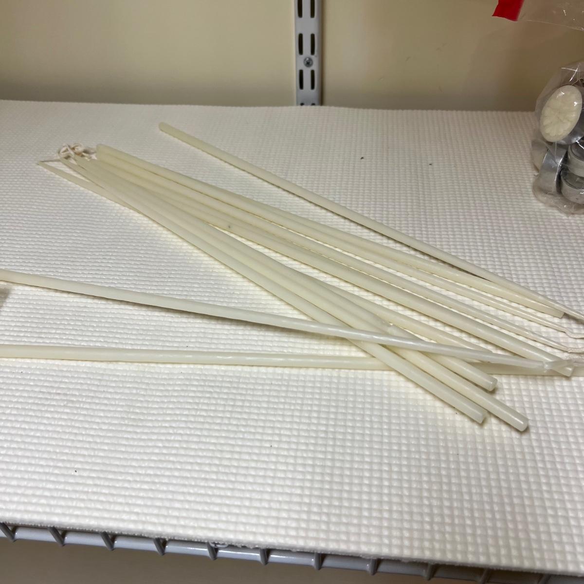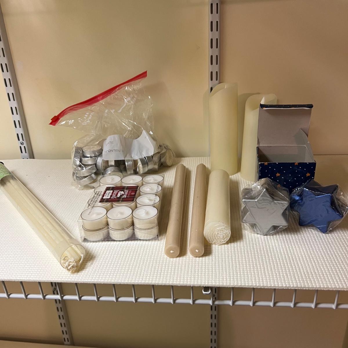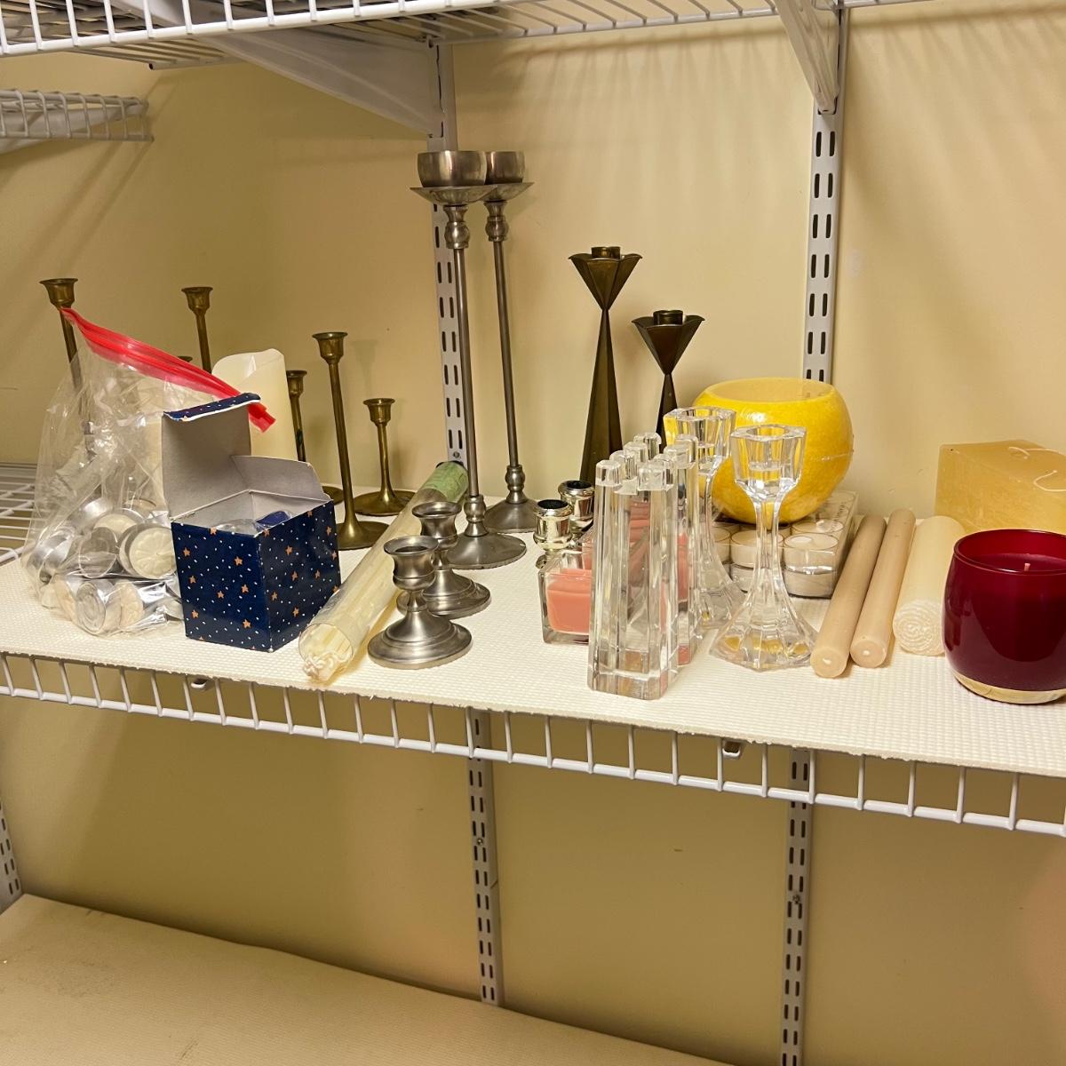 This huge lot features candles in all shapes and sizes, all unused. Also included are 19 candlestick holders, some glass, others are metal, mostly brass colored. The two battery operated candles need new batteries.