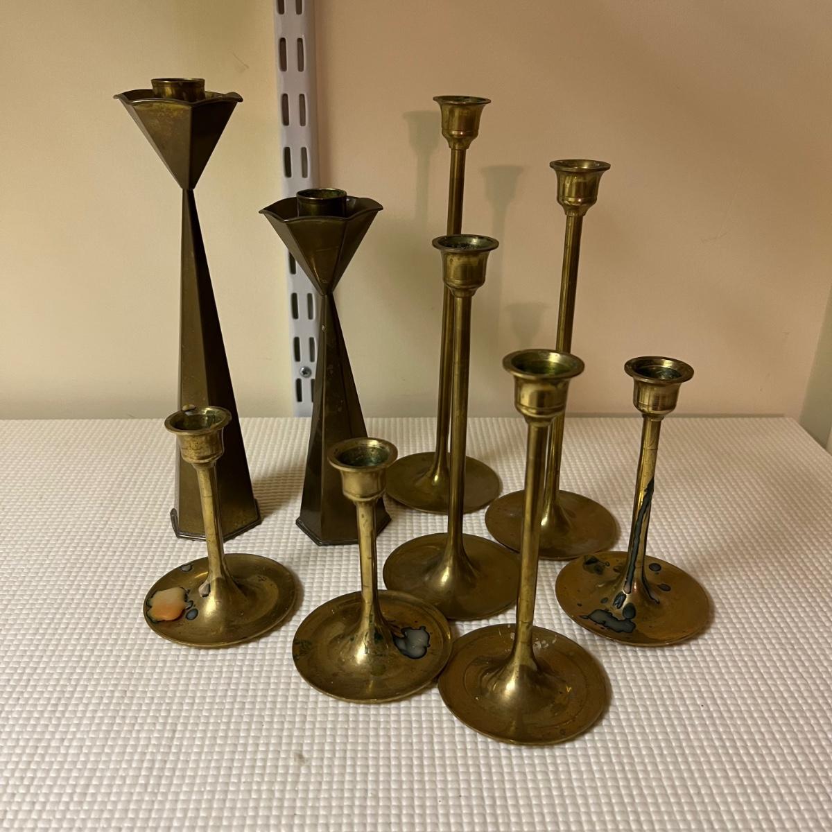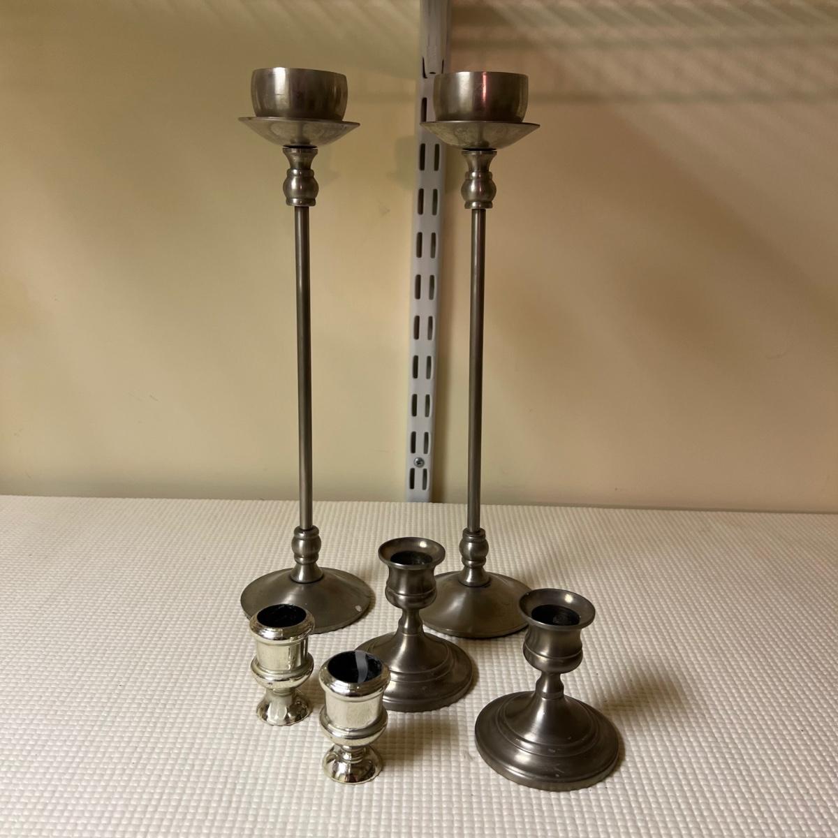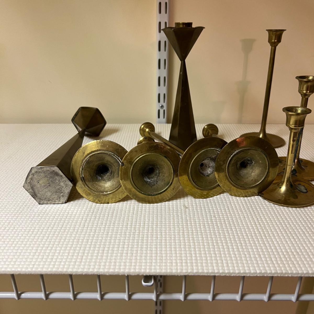 This huge lot features candles in all shapes and sizes, all unused. Also included are 19 candlestick holders, some glass, others are metal, mostly brass colored. The two battery operated candles need new batteries.