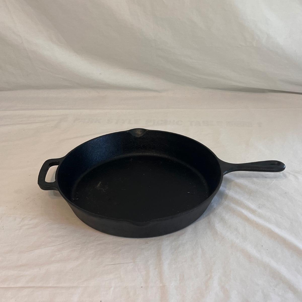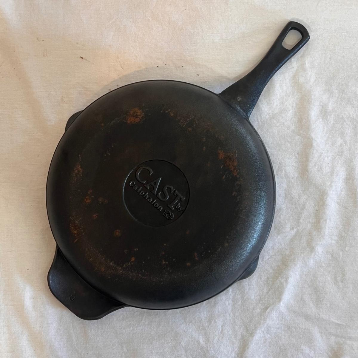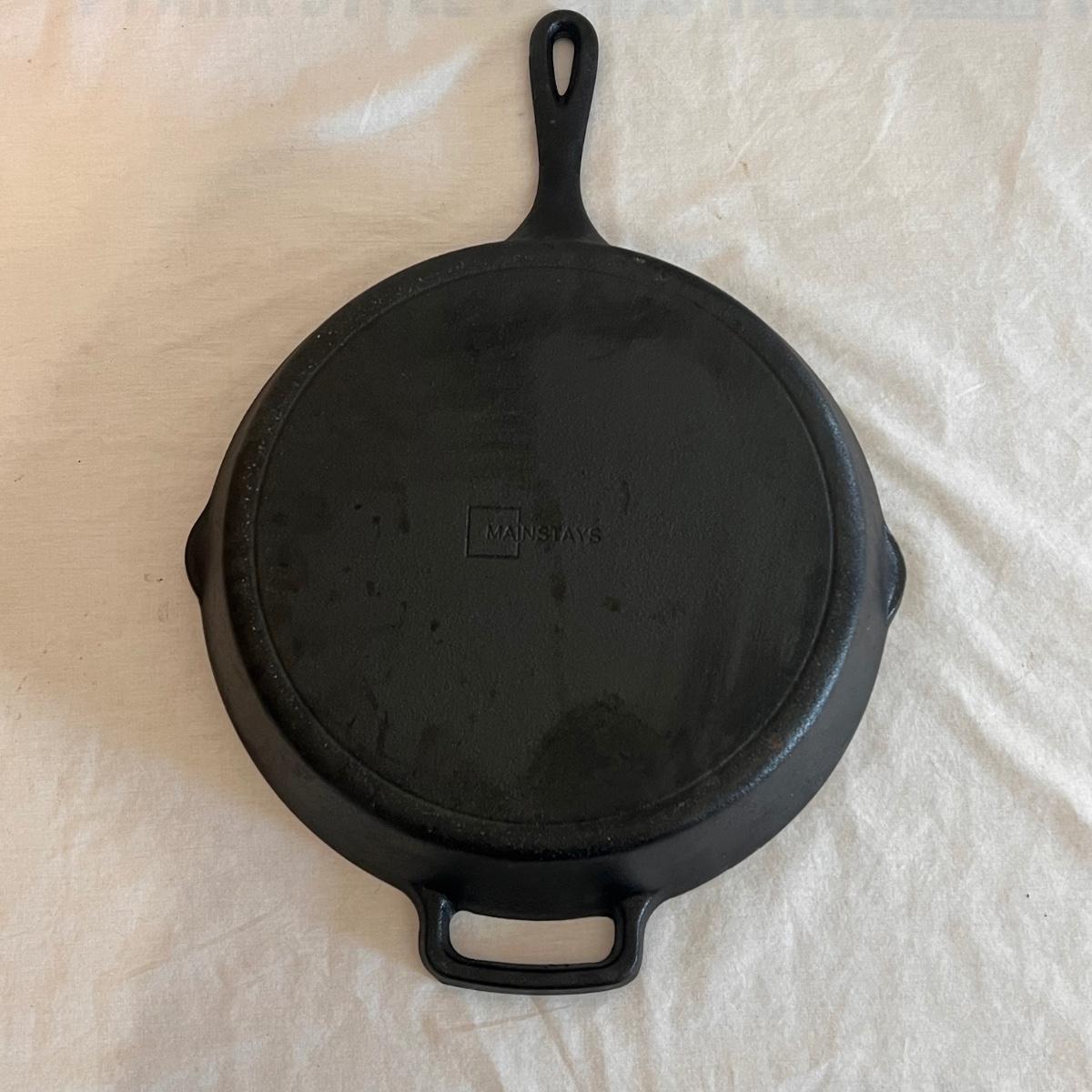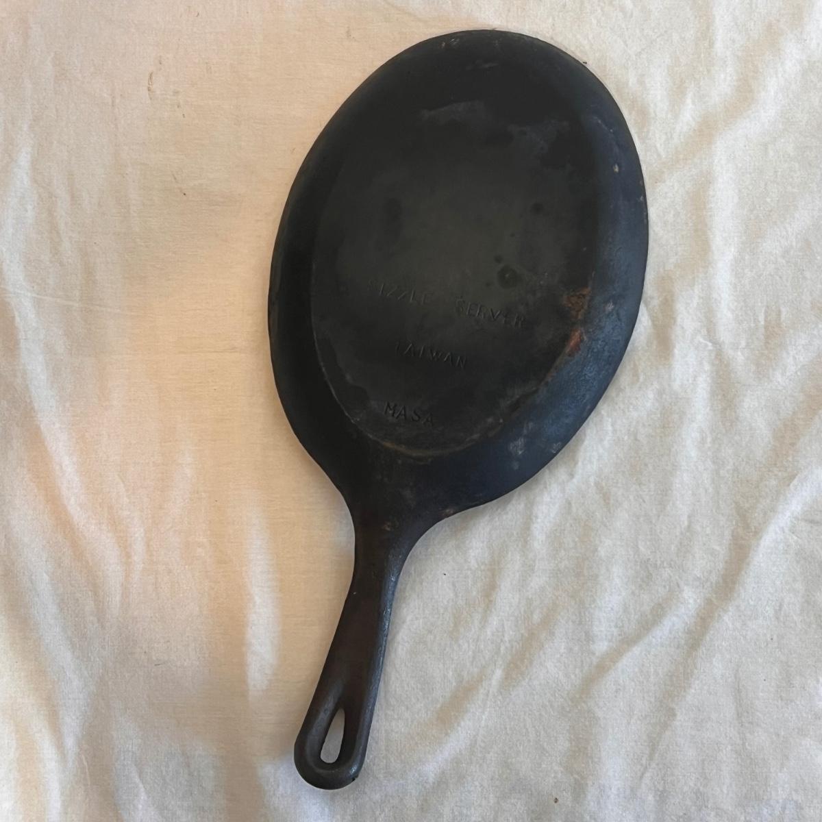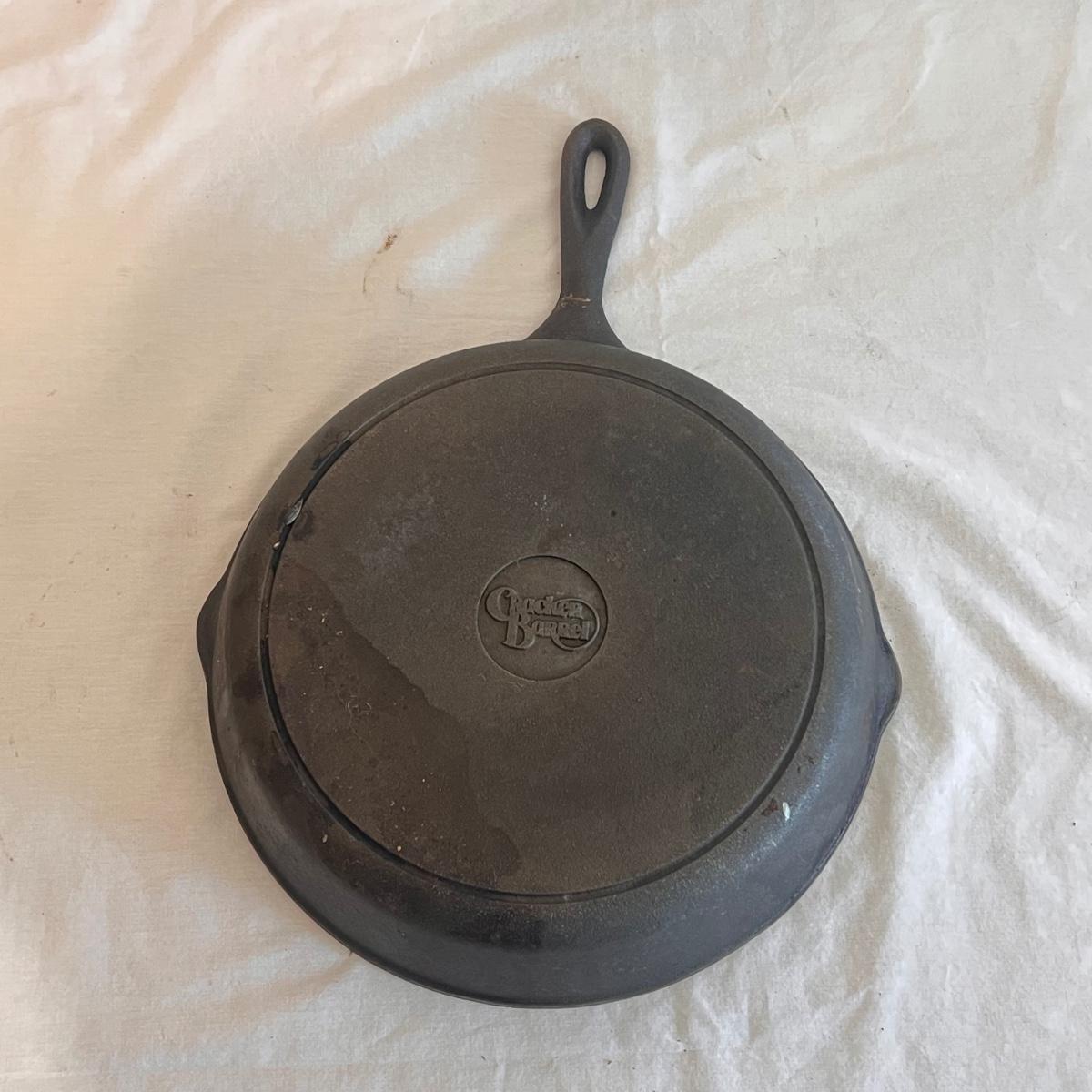 Several cast iron kitchenware items including two Cracker Barrel pieces, one MASA sizzle server made in Taiwan, one CAST by Calphalon, and one Mainstays skillet. The largest skillet is the Mainstays which measures 12” x 18”H. Local pick up only.