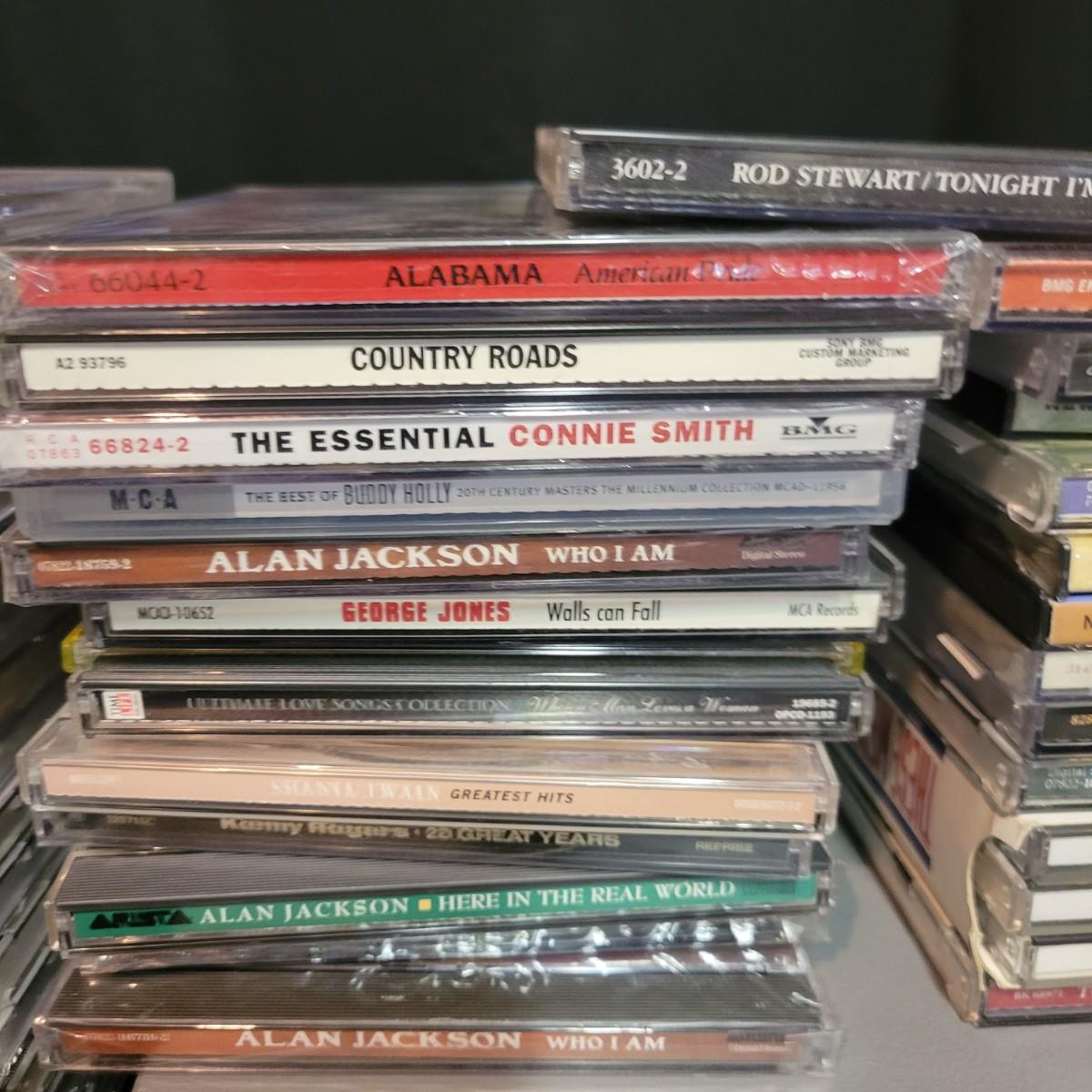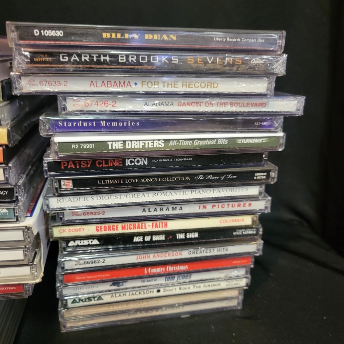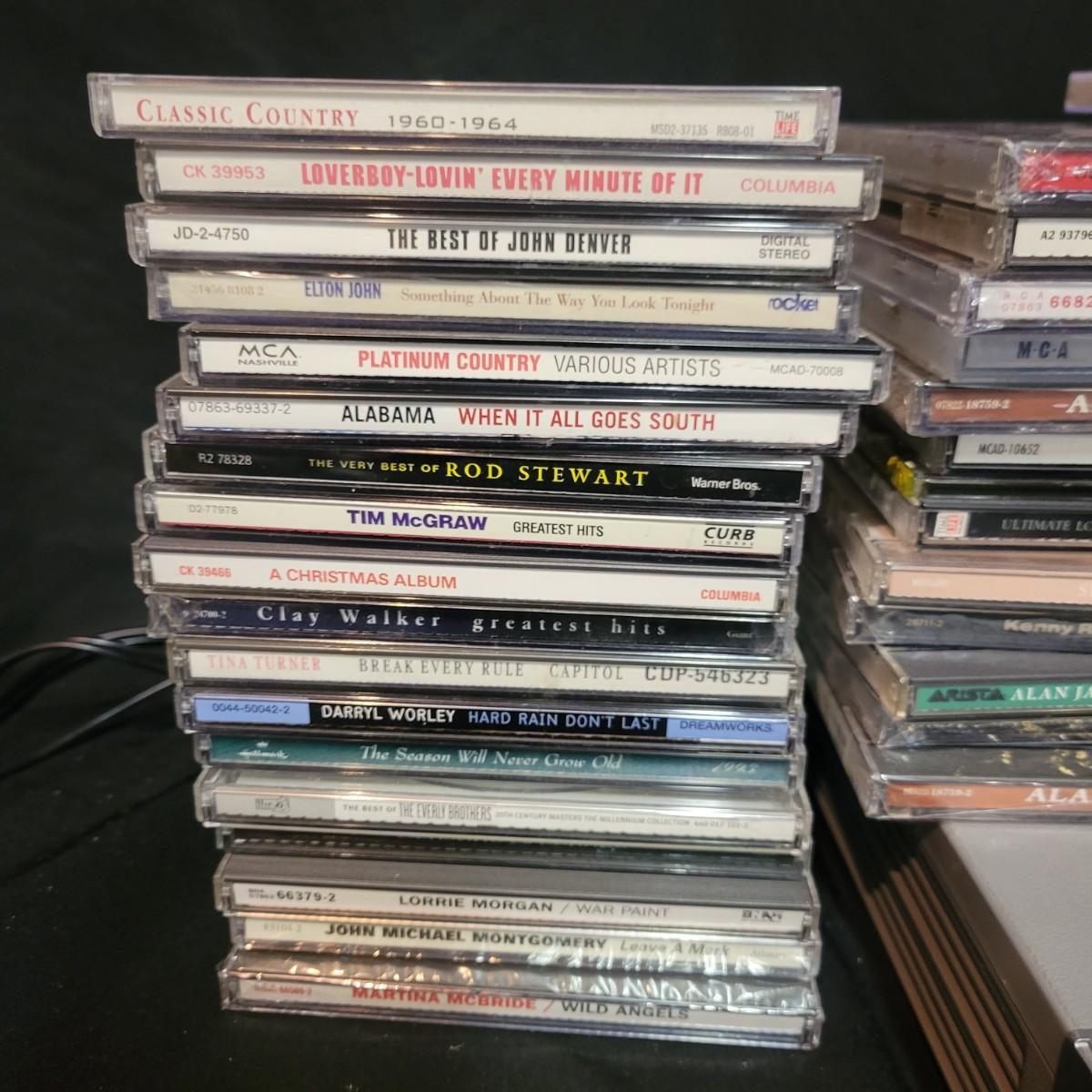 An assortment of CDs amd a Magnavod CD/DVD player. Over 60 CDs are included from artists like Alan Jackson, Alabama, George Micheal, Tom Jones and more. Also includes a Magnavox CD/DVD player, model # MWD200F, that powered on when plugged in. Local pickup only