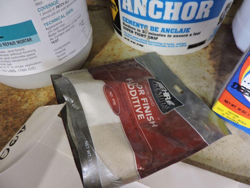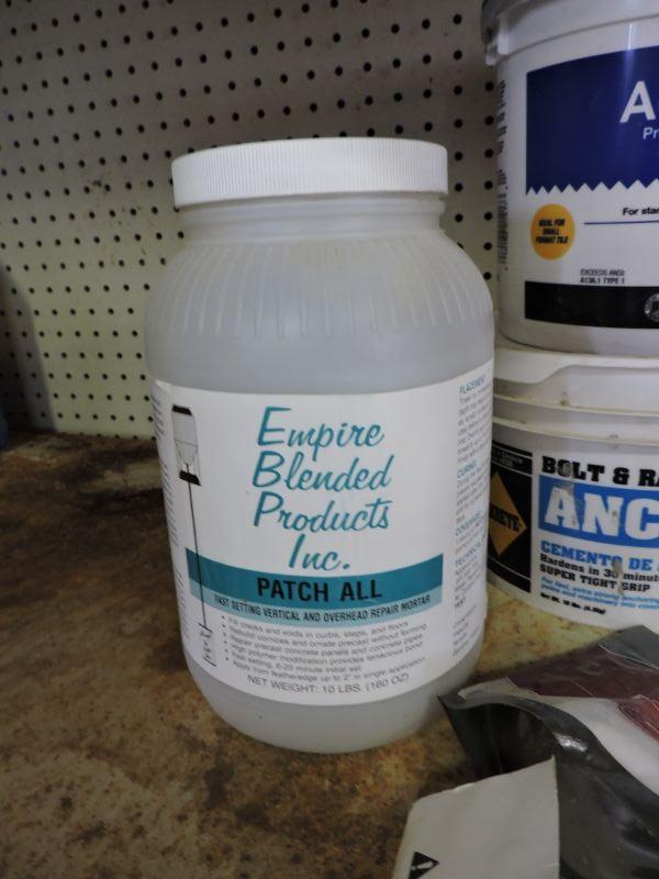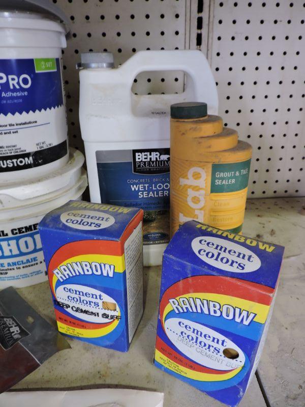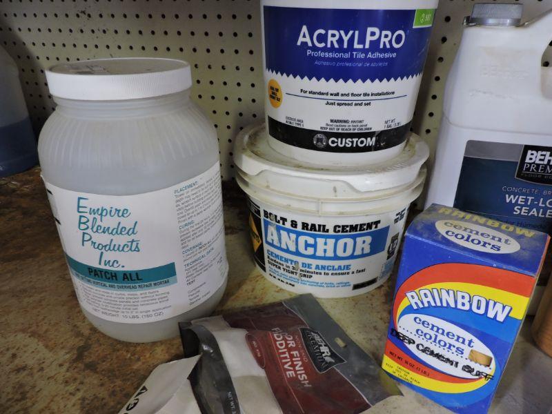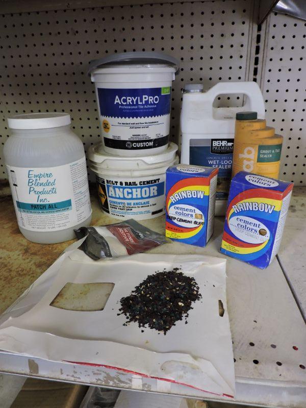All sorts of cement and tile supplies including a large box of flakes for adding to sealer. Please read Terms and Conditions before placing a bid. Pick up is Friday, October 25th between 4 and 7, and Saturday, October 26th between 9 and 1. Please bring boxes, tools, and muscle to help move your items. Props included in photos are not included in listing. All measurements are approximate.