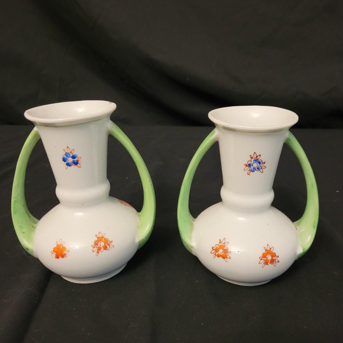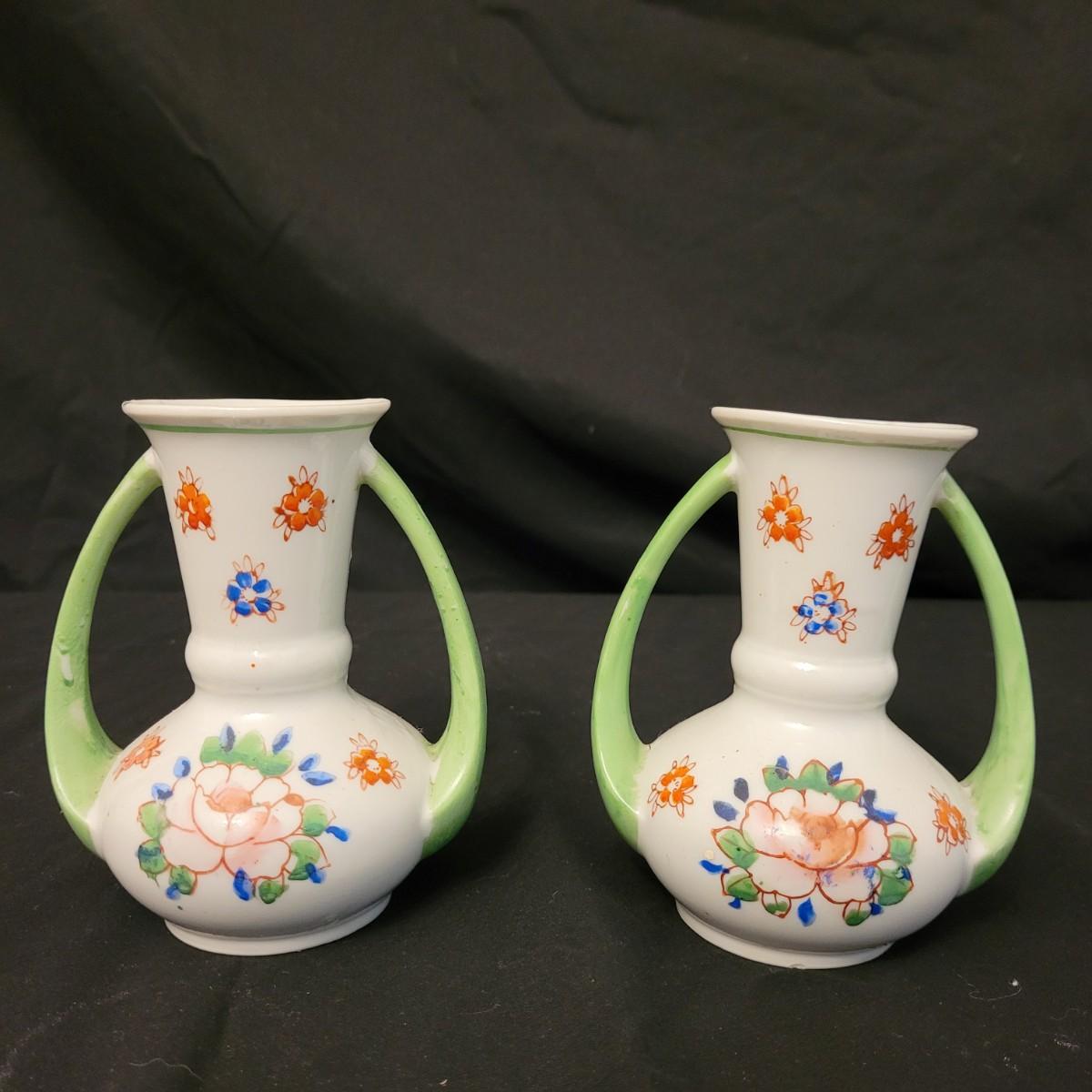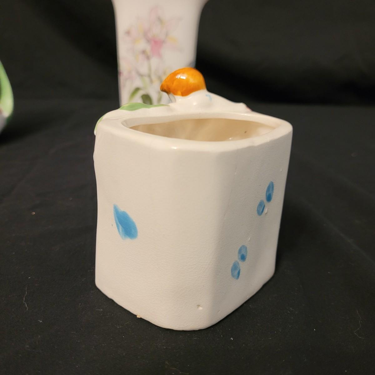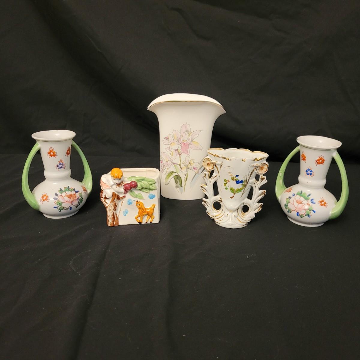 Well loved assortment of small painted ceramic vases and container. All items have accumulation of dust and grime, easily cleanable. Paint is chipped on many pieces, and one container has a crack (see photos). Tall flower vase measures approximately 5.5"W at mouth x7"H. Shipping available.