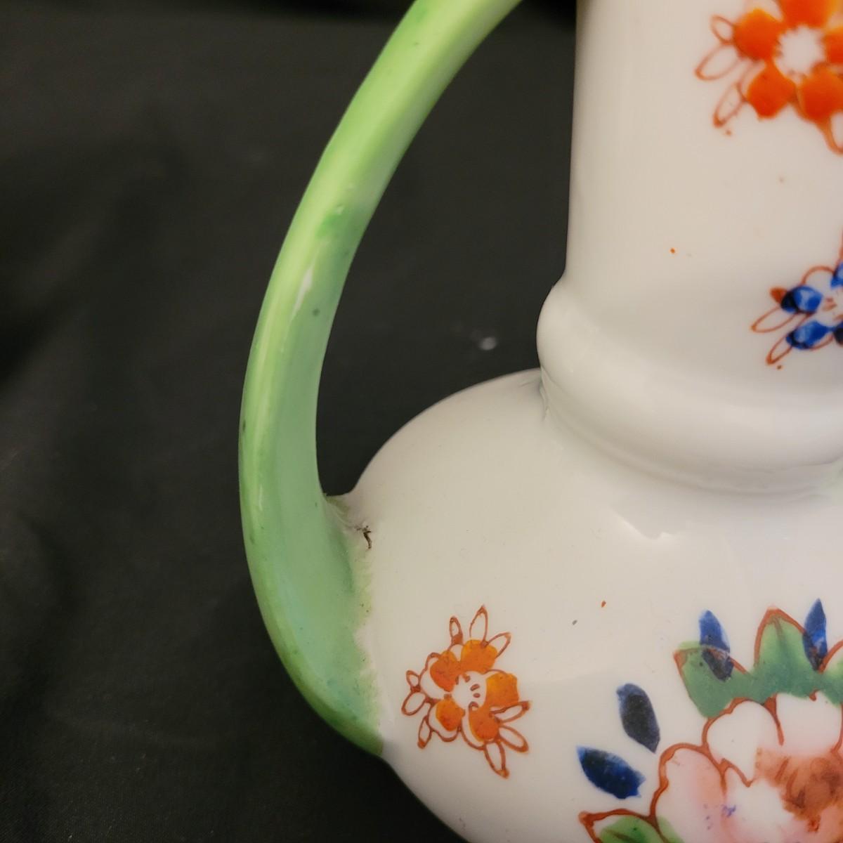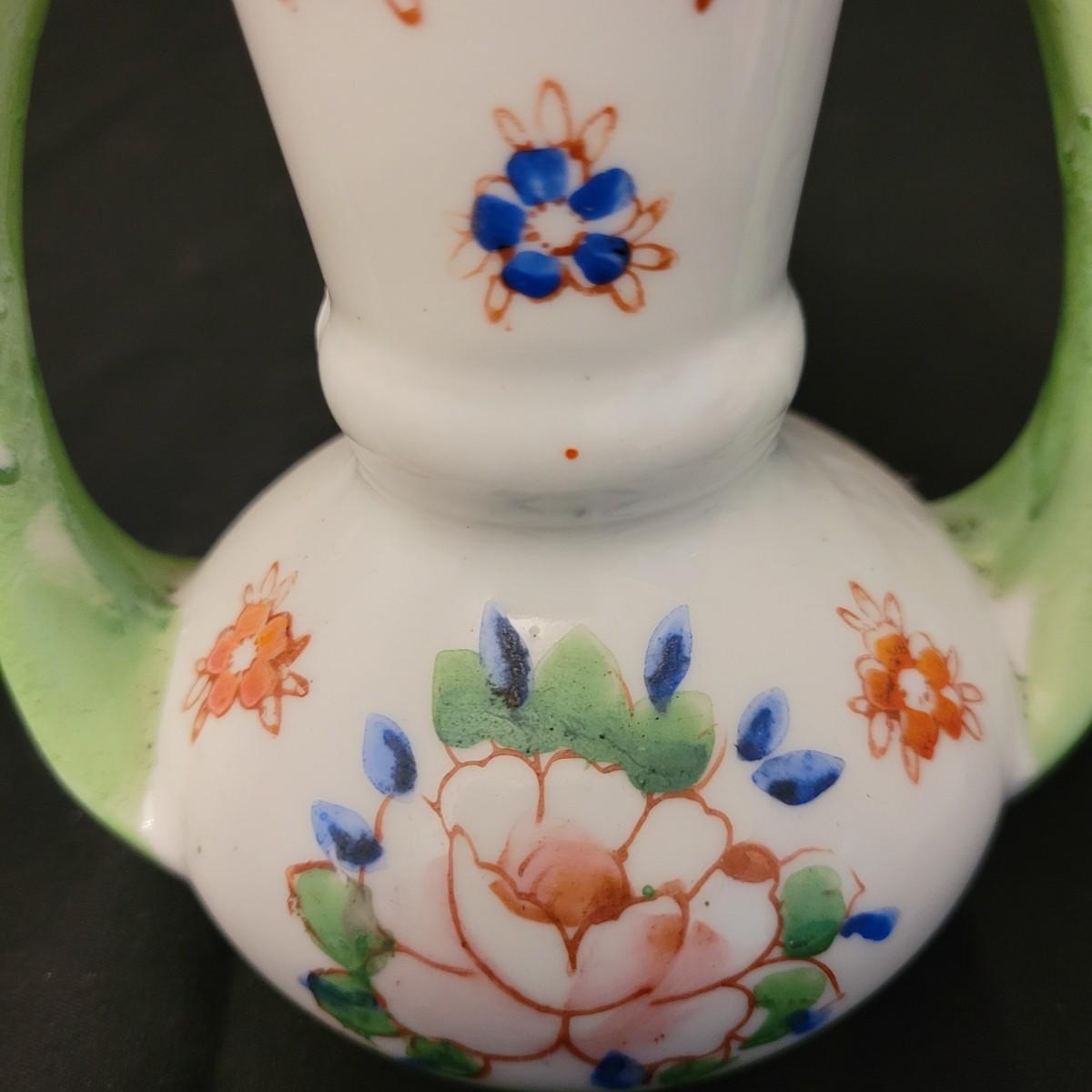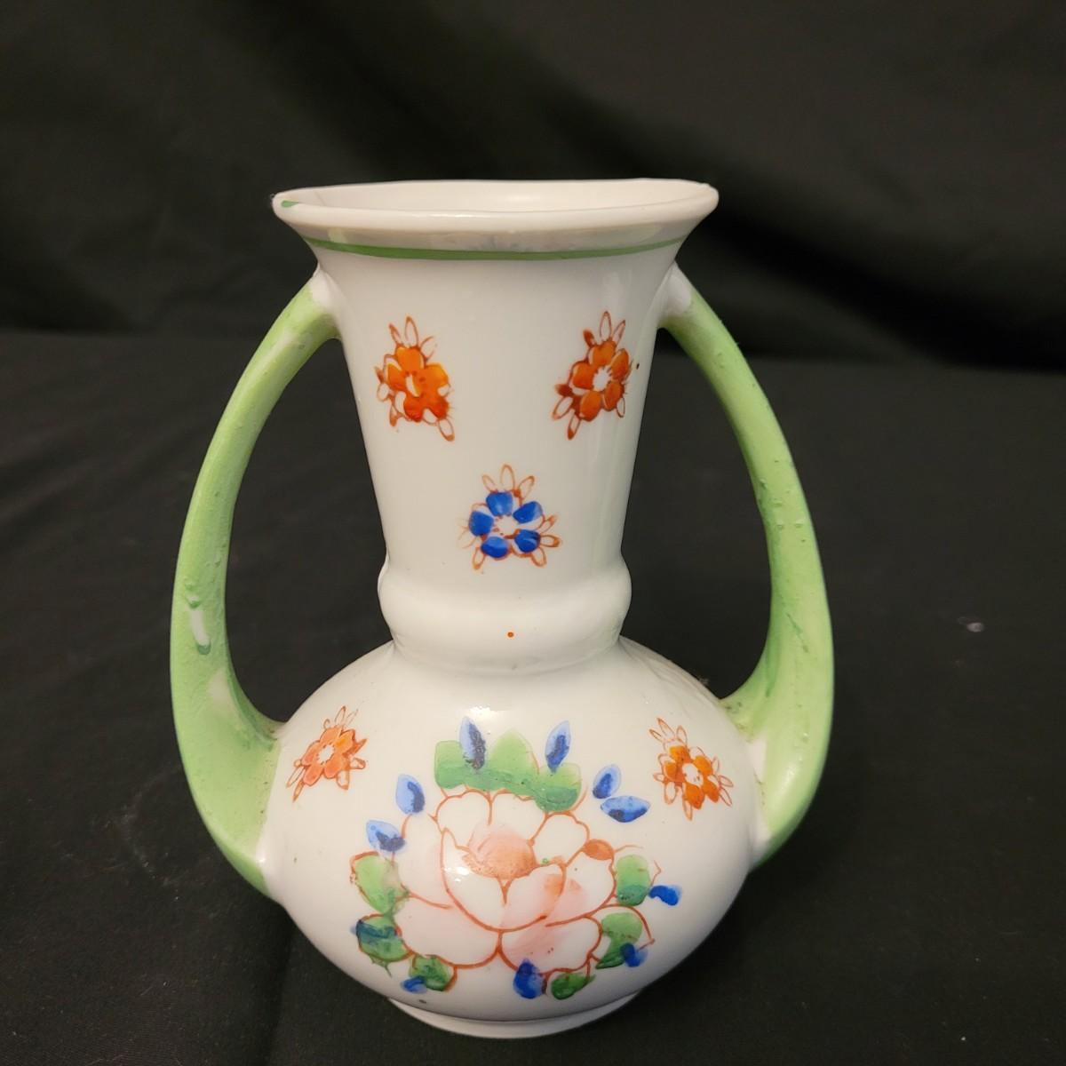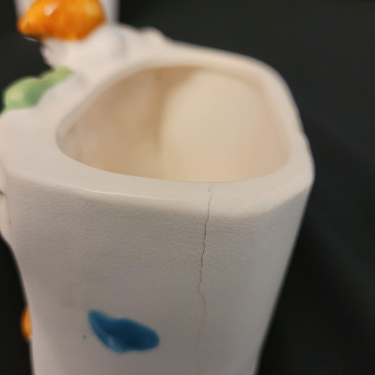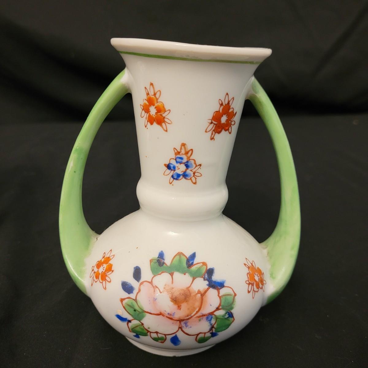 Well loved assortment of small painted ceramic vases and container. All items have accumulation of dust and grime, easily cleanable. Paint is chipped on many pieces, and one container has a crack (see photos). Tall flower vase measures approximately 5.5"W at mouth x7"H. Shipping available.