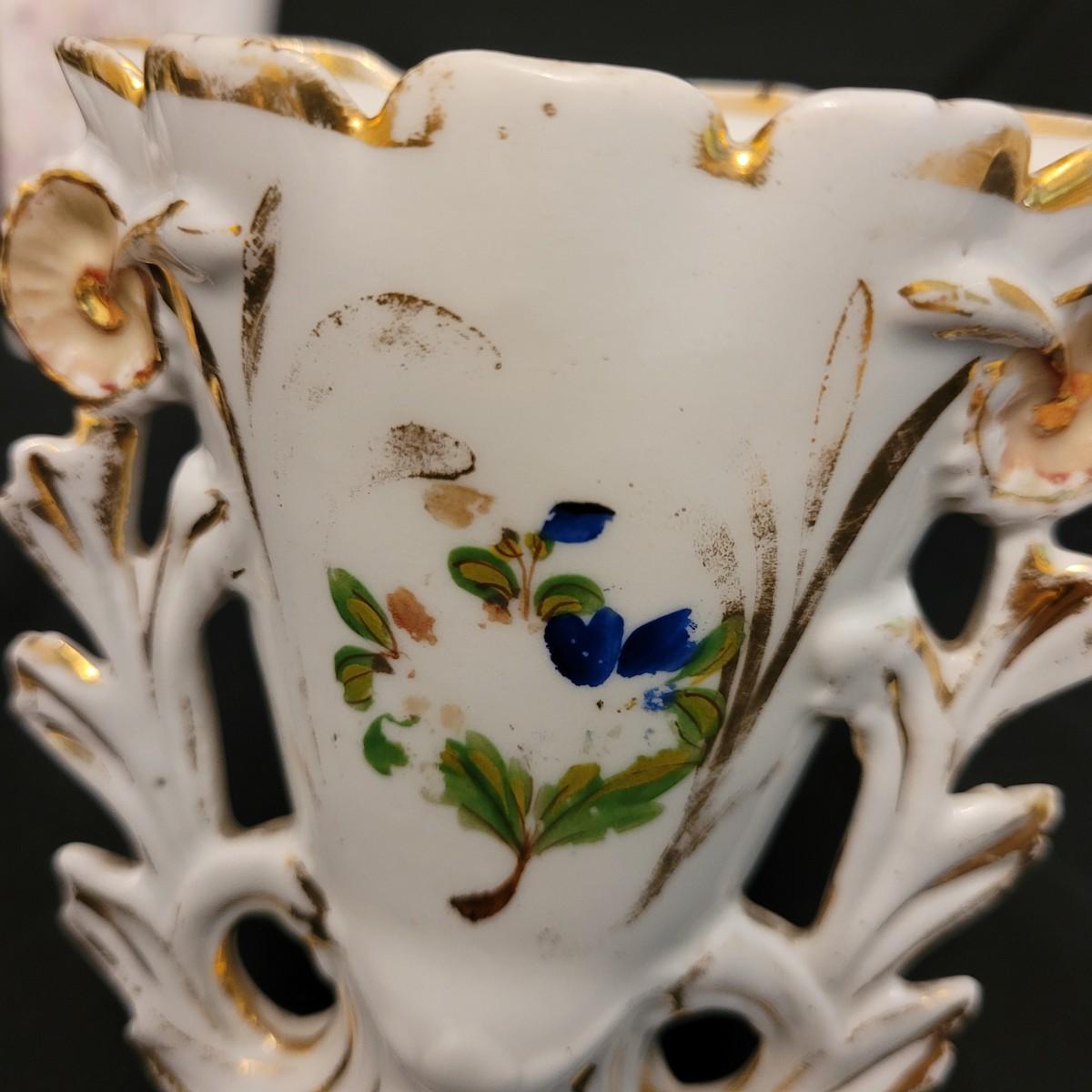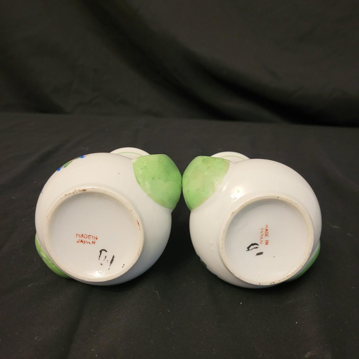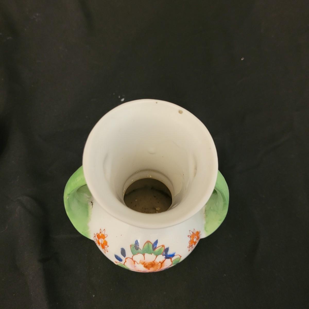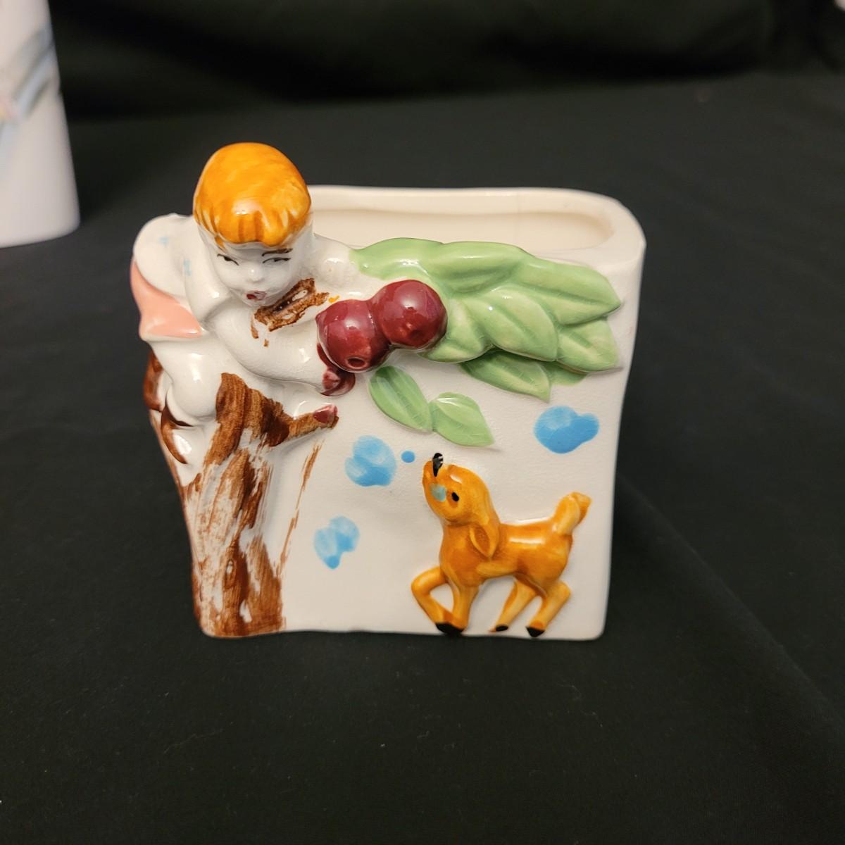 Well loved assortment of small painted ceramic vases and container. All items have accumulation of dust and grime, easily cleanable. Paint is chipped on many pieces, and one container has a crack (see photos). Tall flower vase measures approximately 5.5"W at mouth x7"H. Shipping available.
