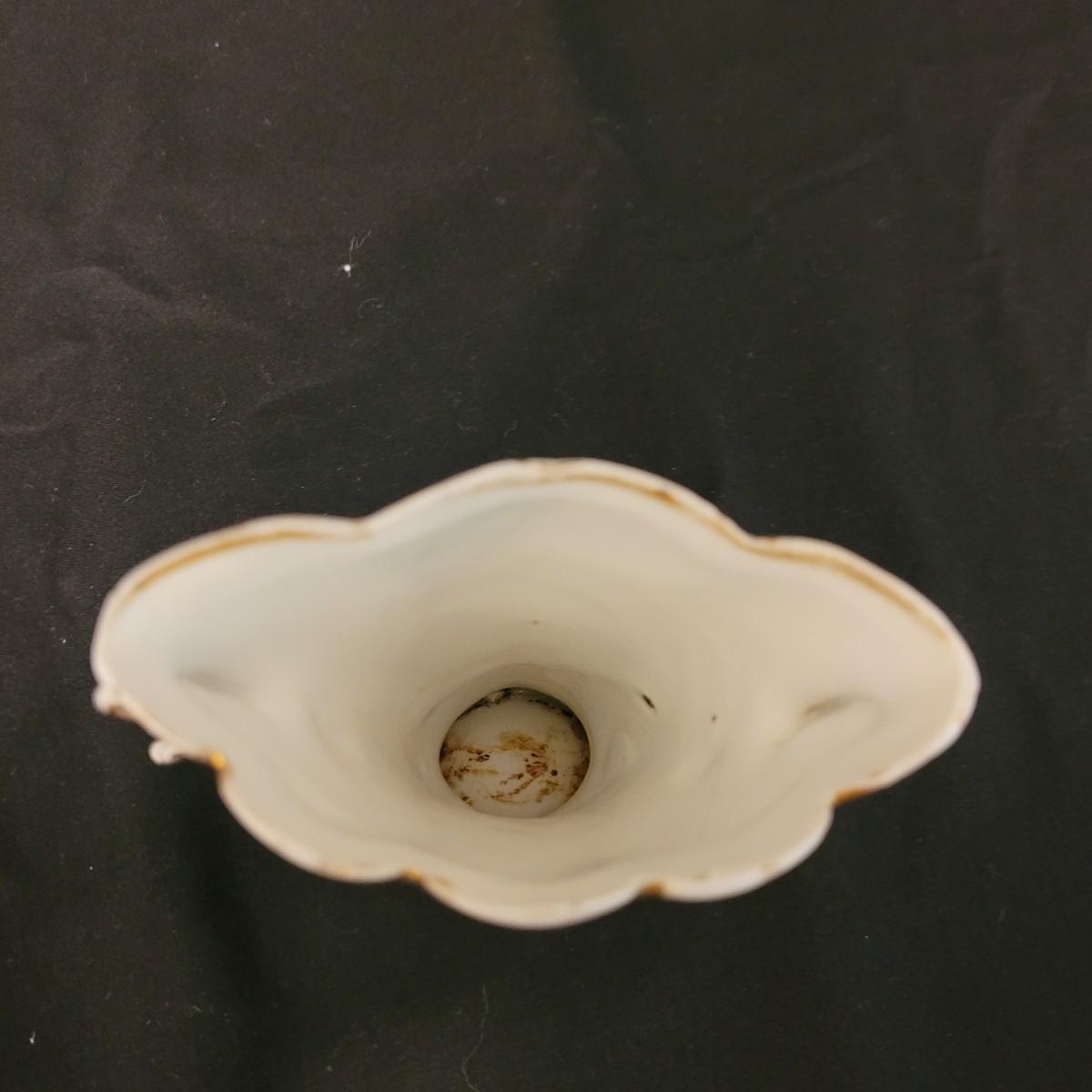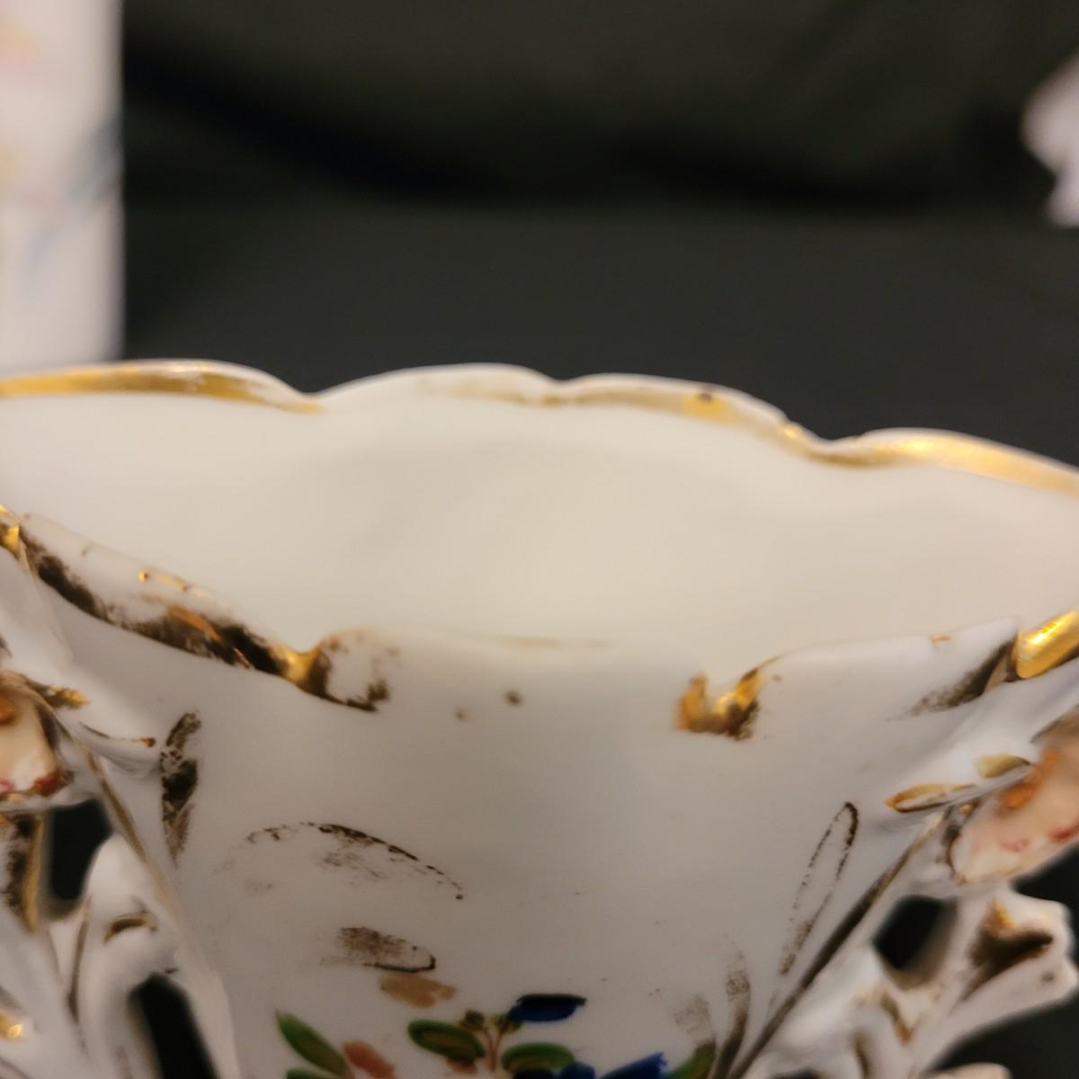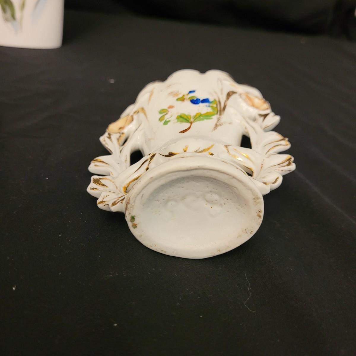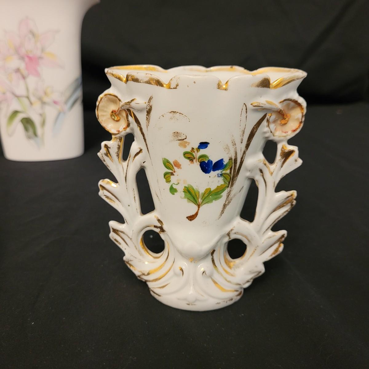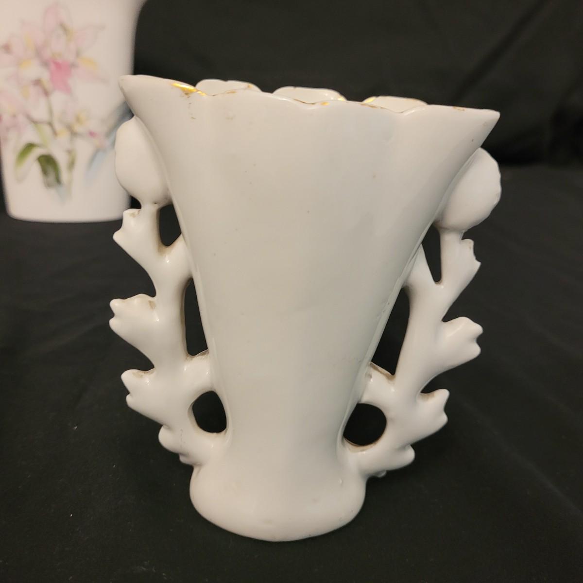Well loved assortment of small painted ceramic vases and container. All items have accumulation of dust and grime, easily cleanable. Paint is chipped on many pieces, and one container has a crack (see photos). Tall flower vase measures approximately 5.5"W at mouth x7"H. Shipping available.