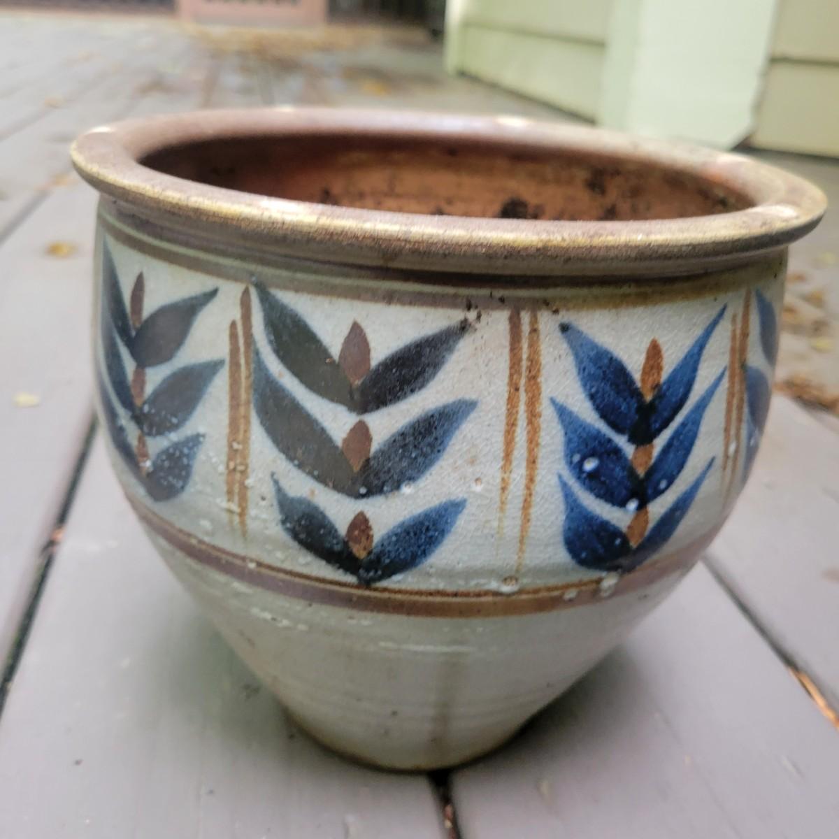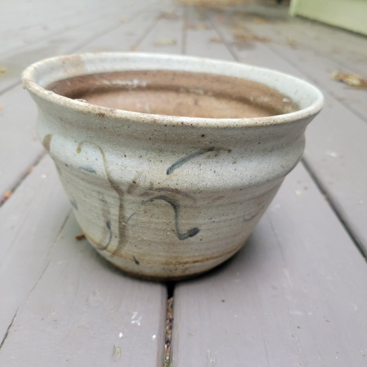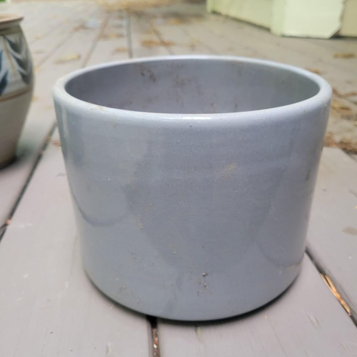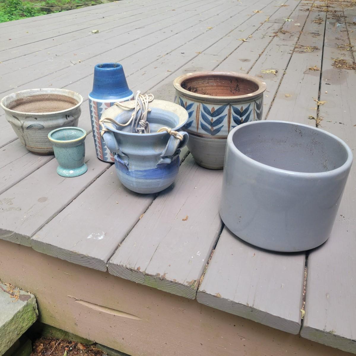 An assortment of ceramic planters in a variety of sizes. Most are signed or stamped. The largest grey planter measures approximately 8"D x 6"H. Local pickup only