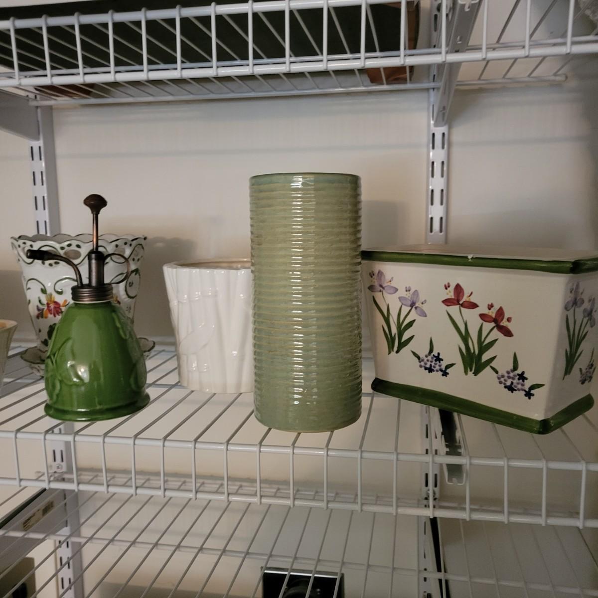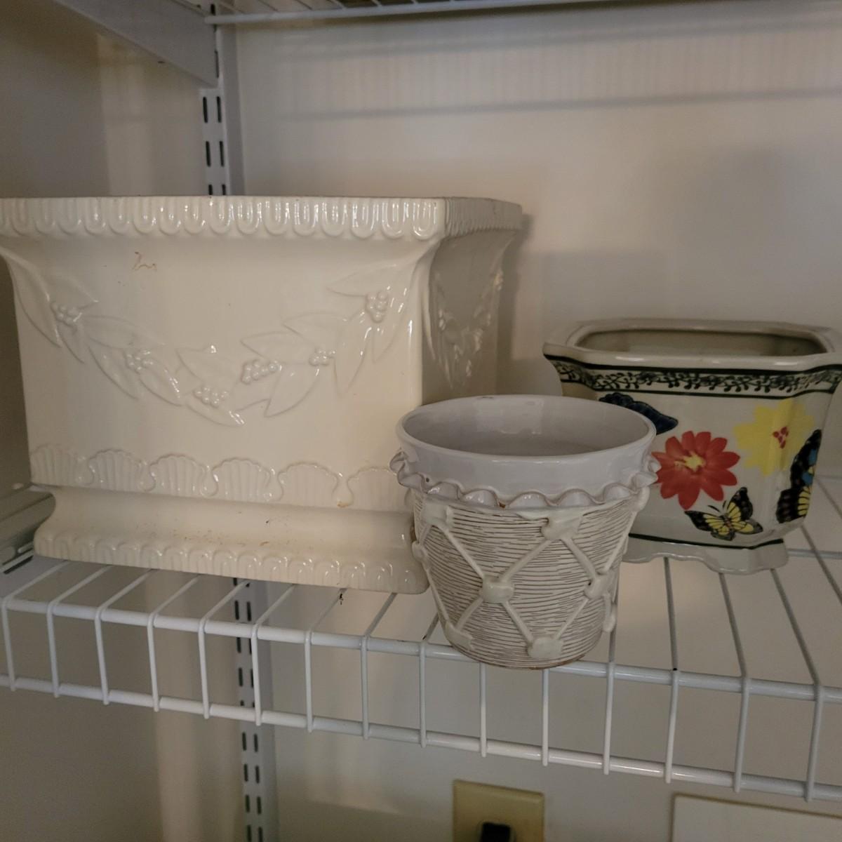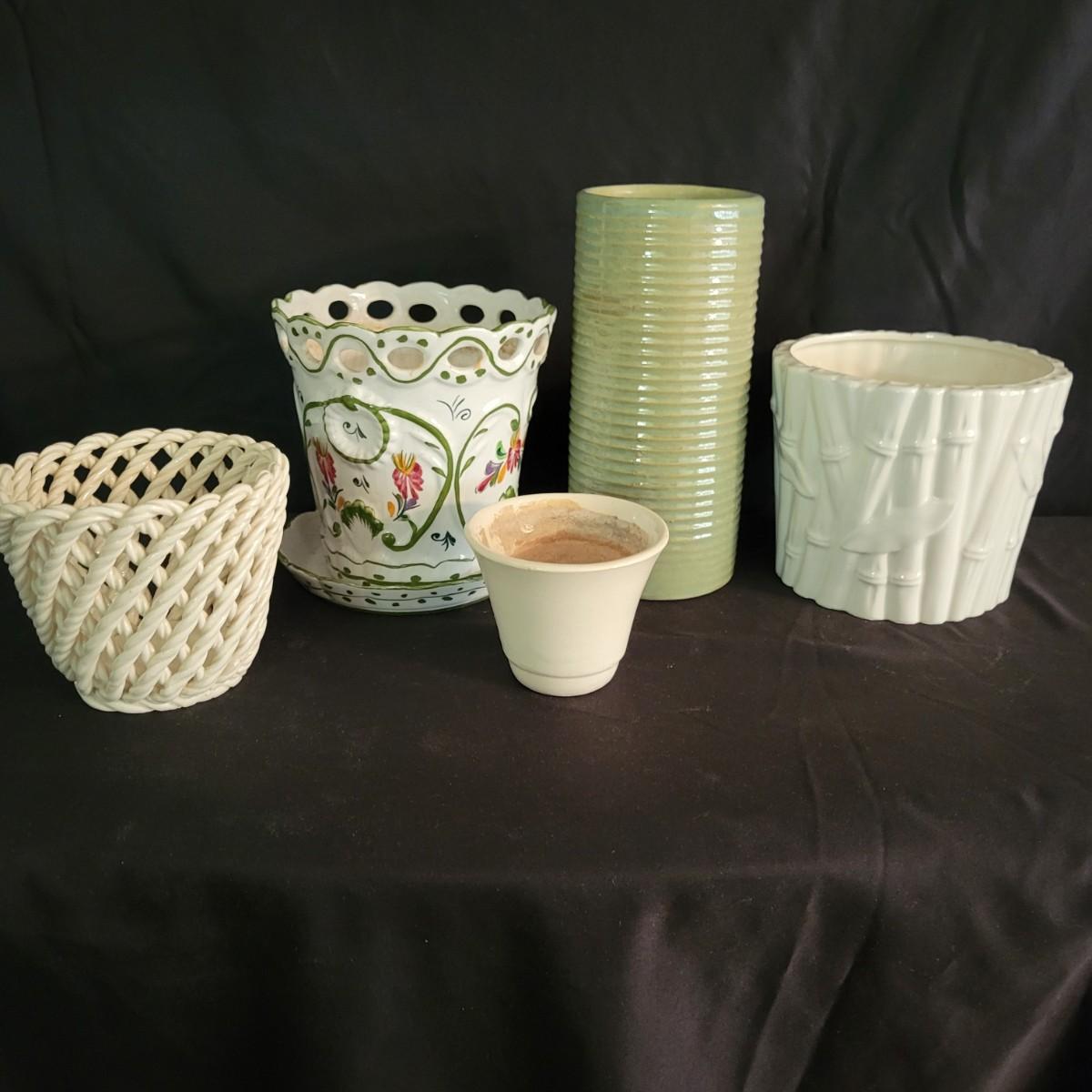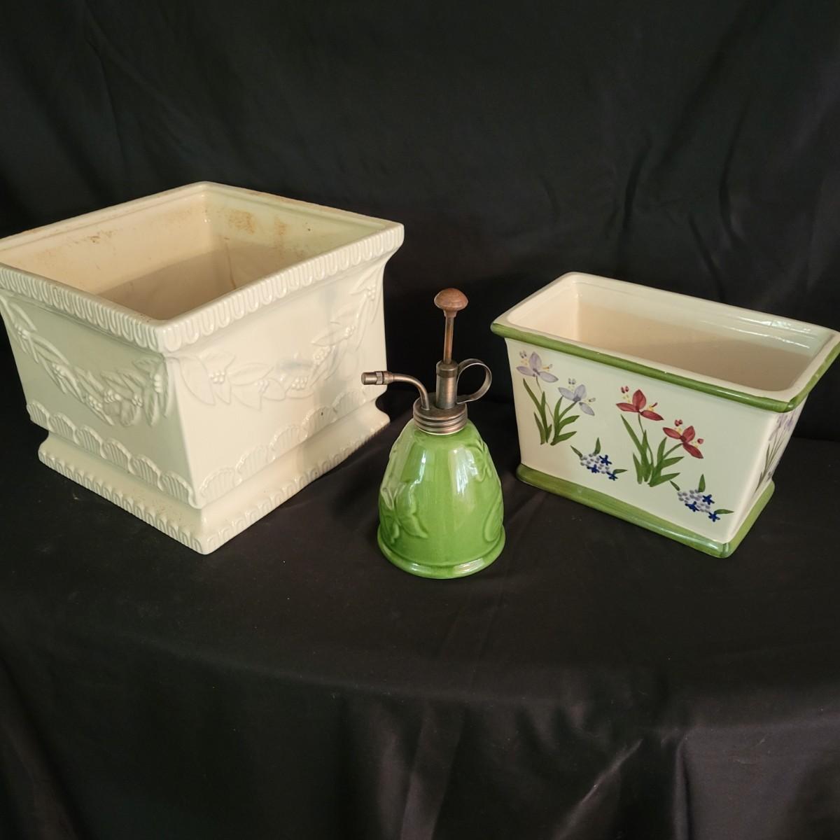 An assortment of ceramic pots in a variety of shapes and sizes. Some pieces are marked with their country of origin ranging from Japan to Portugal. The mister has a brass head. Large white pot measures approximately 9" x 9" x 7.5"H. Local pickup only