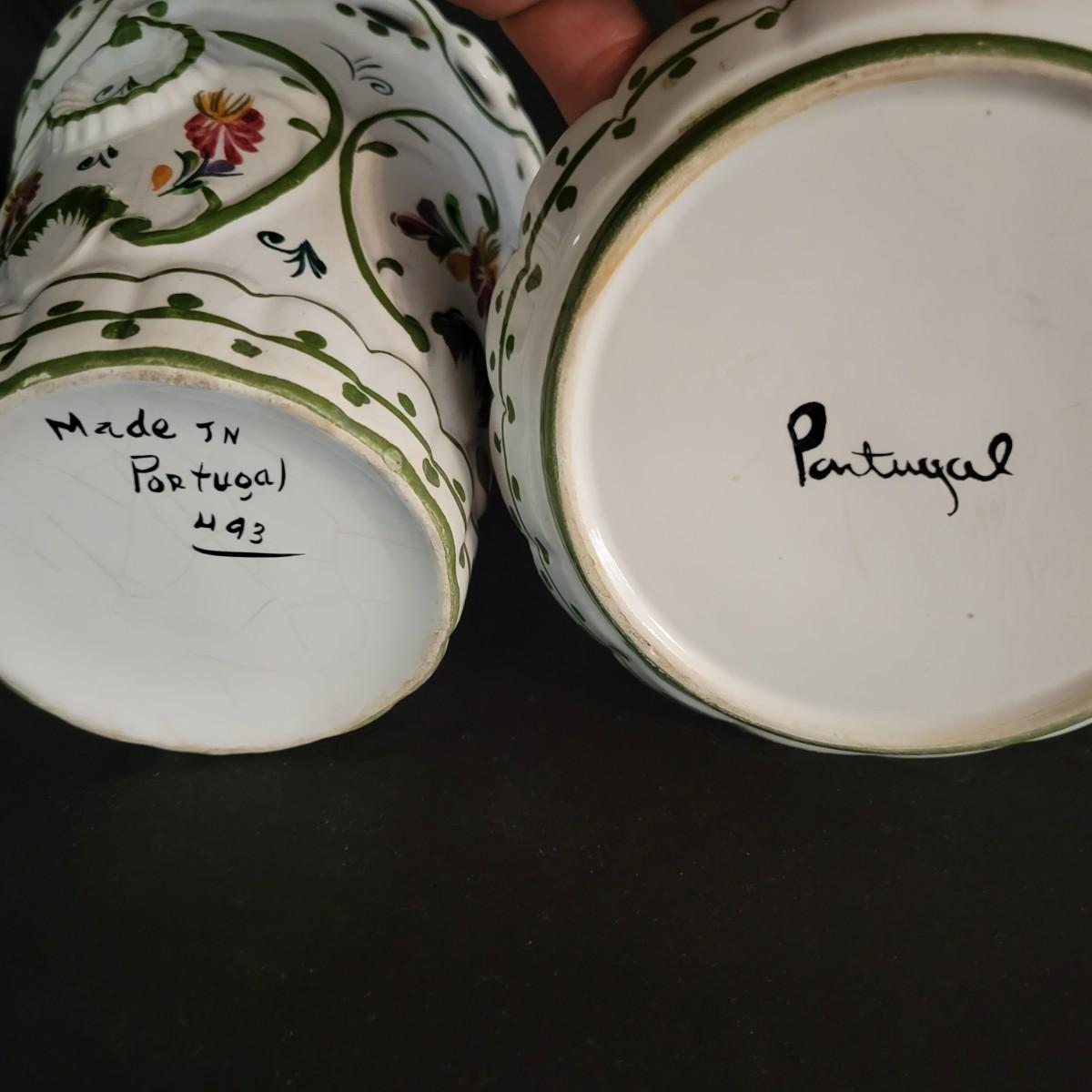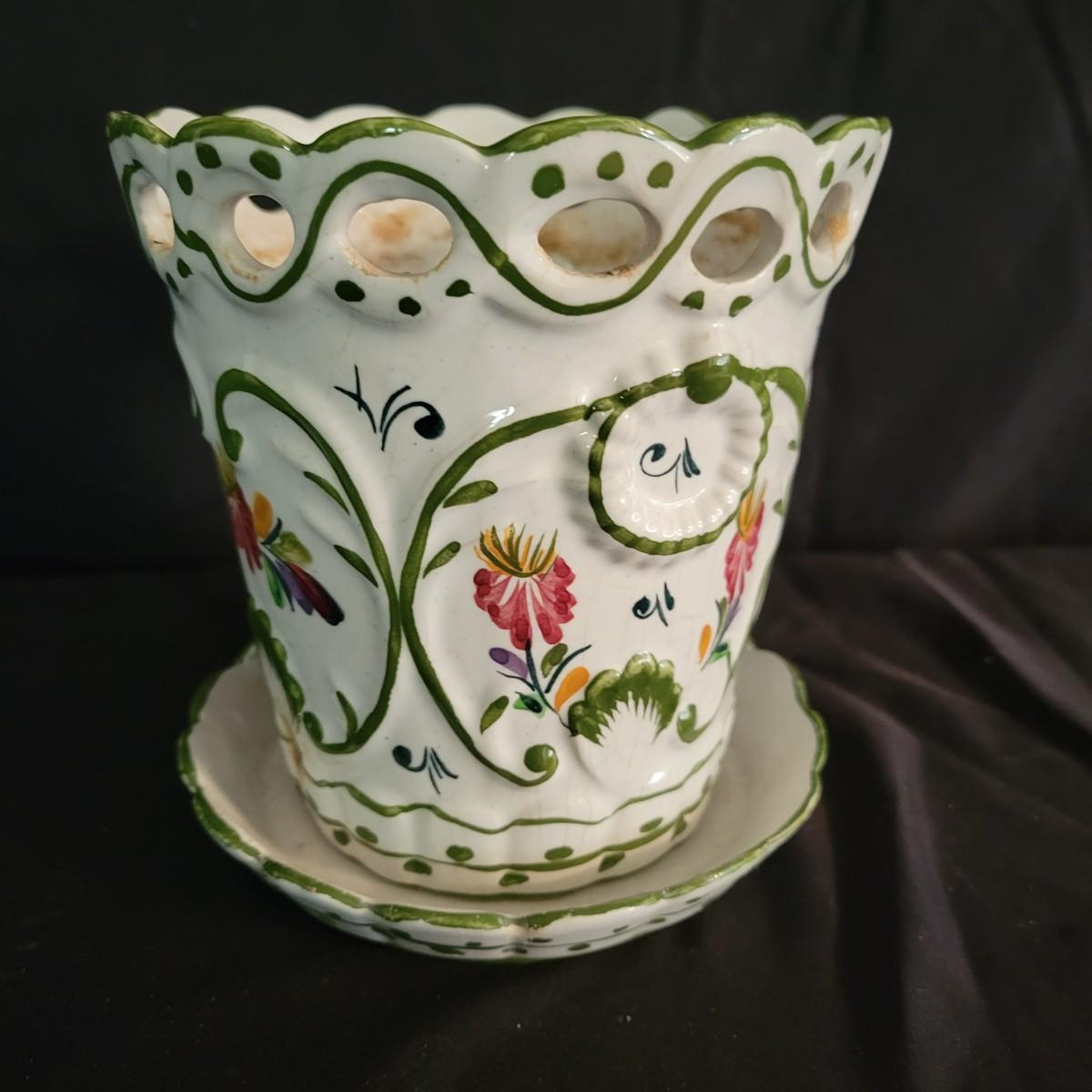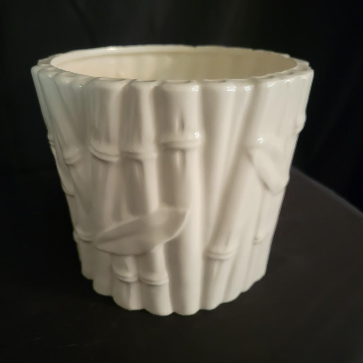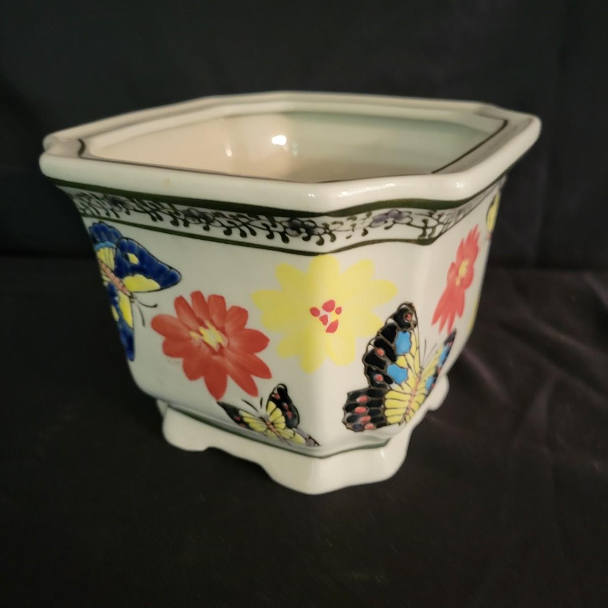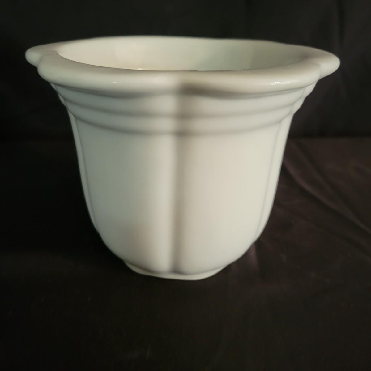 An assortment of ceramic pots in a variety of shapes and sizes. Some pieces are marked with their country of origin ranging from Japan to Portugal. The mister has a brass head. Large white pot measures approximately 9" x 9" x 7.5"H. Local pickup only