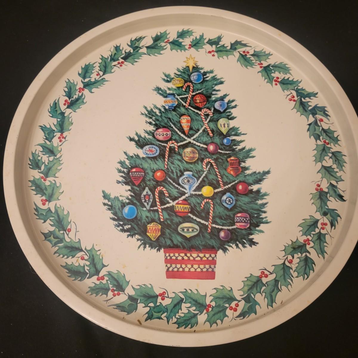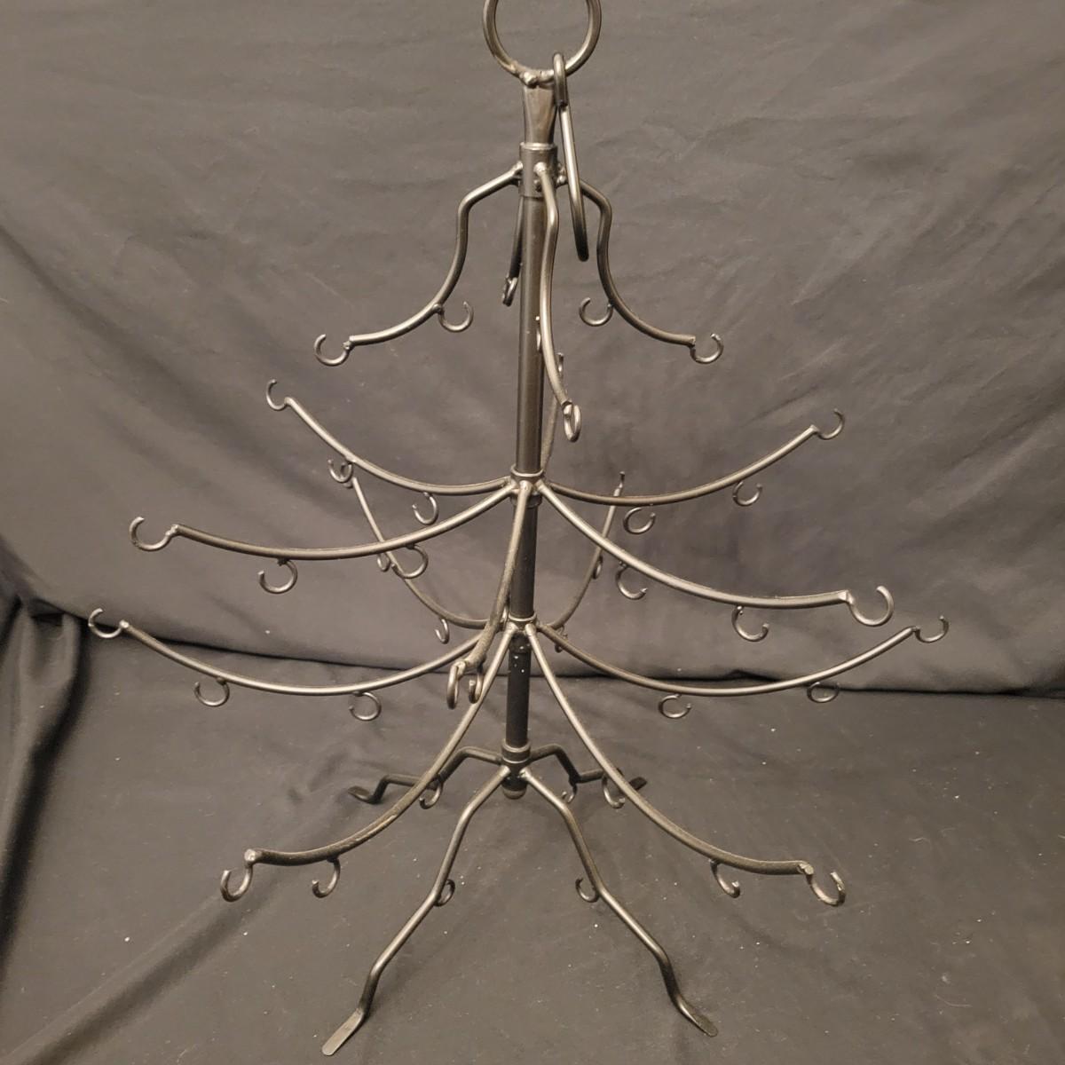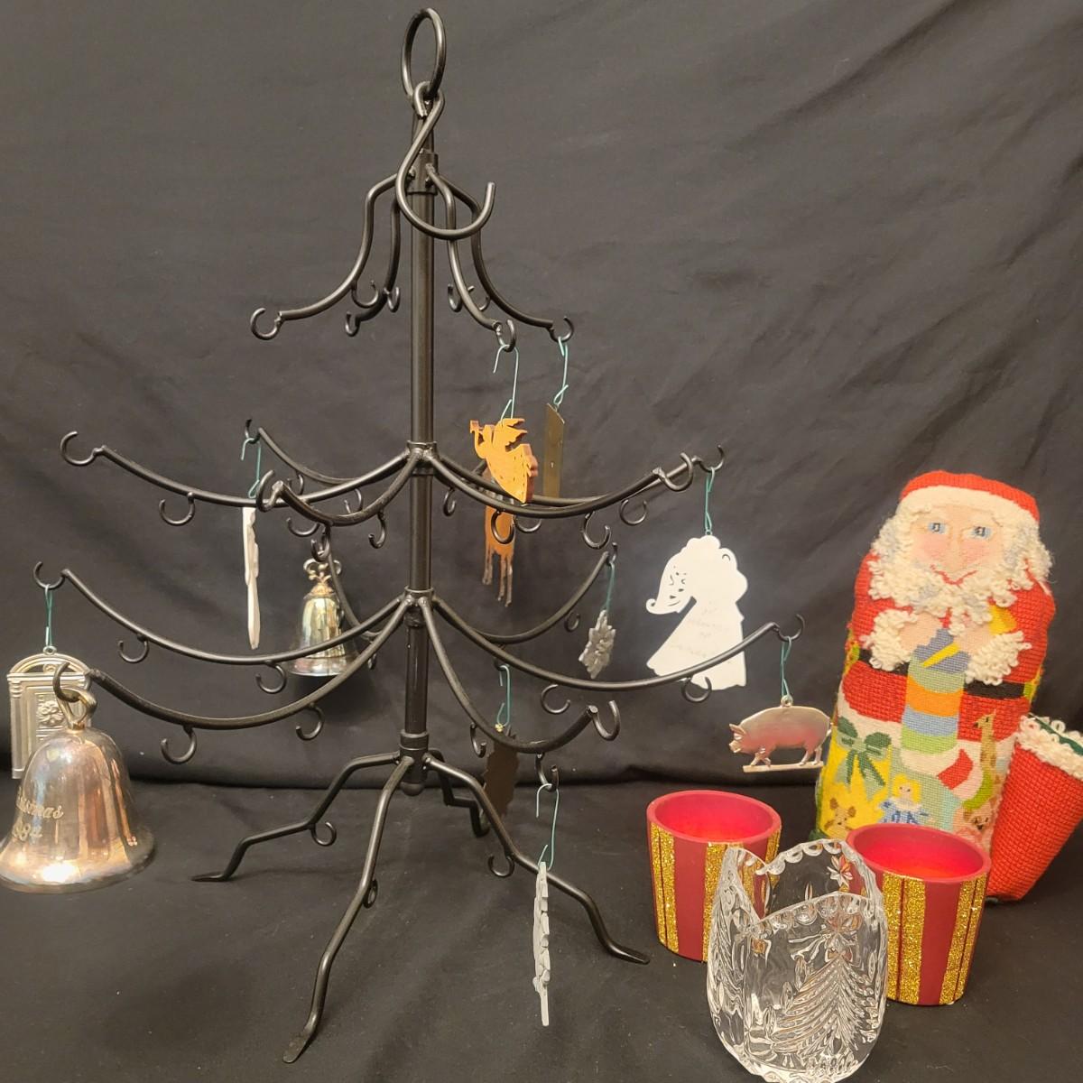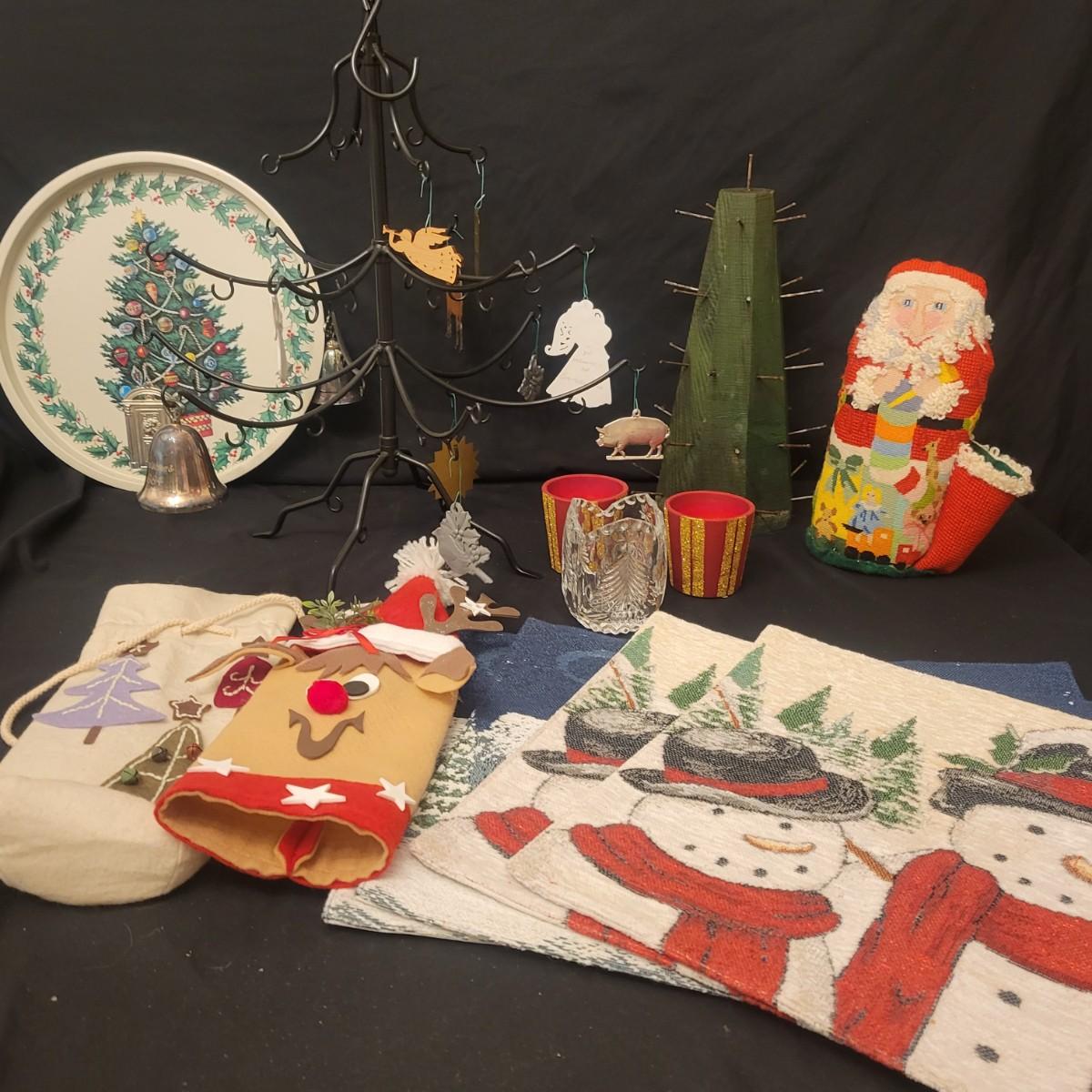 An assortment of Christmas decor in good condition. Included are four place mats, two votive candleholders, a small crystal glass, a tin platter, two wine bottle covers, a primitive Christmas Tree, an assortment of ornaments and a wrought iron Christmas Tree. Wrought iron tree measures approximately 17.5" x 20". Shipping available. Shipping can be costly please call UPS store at 828-252-6930 for estimate